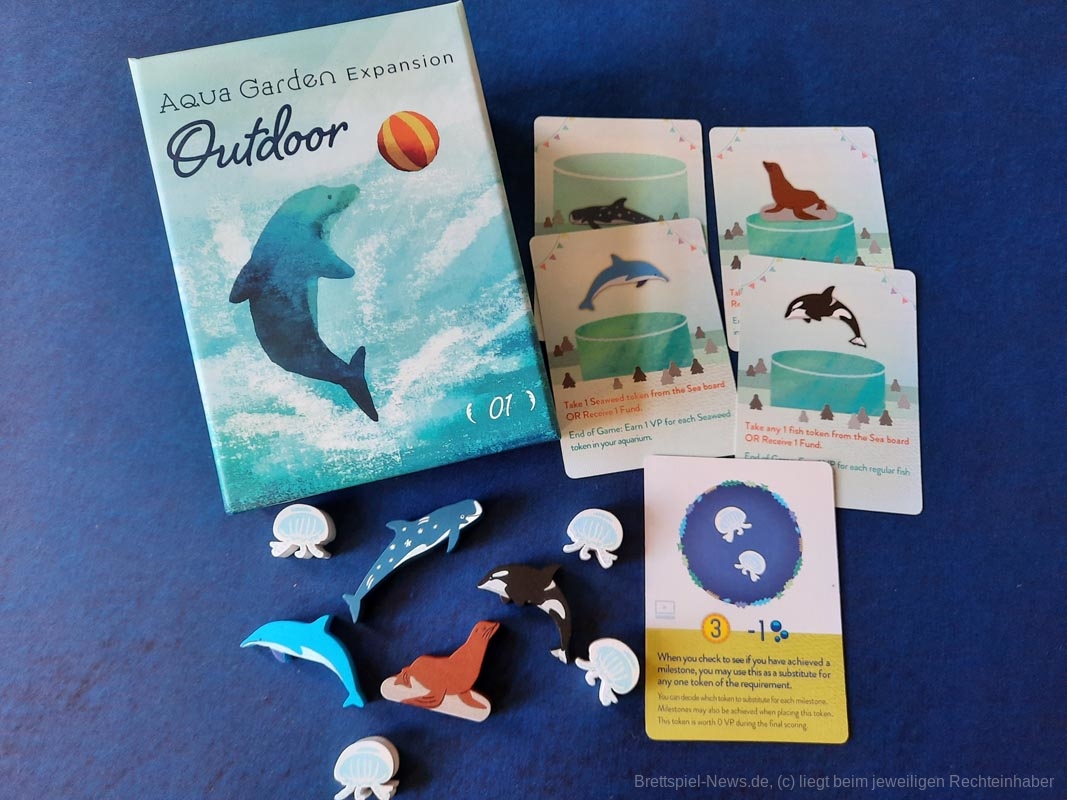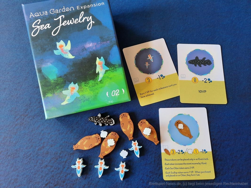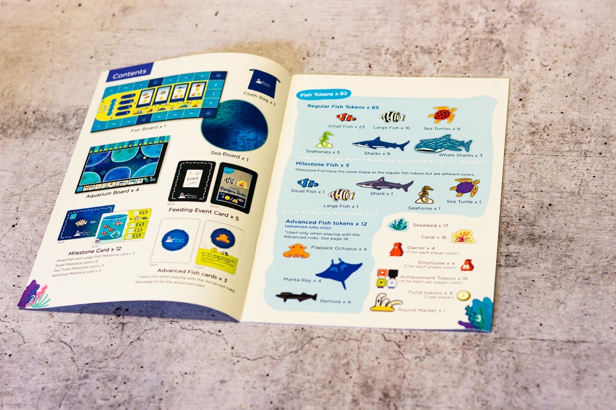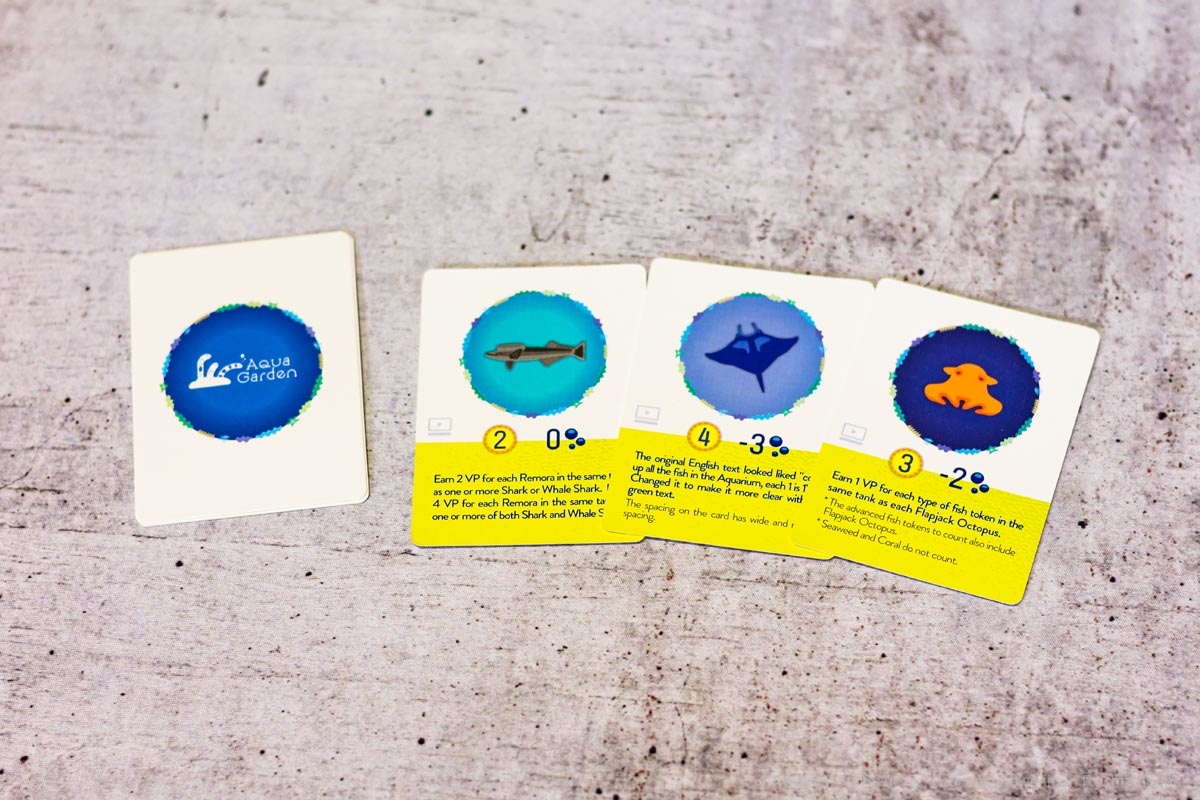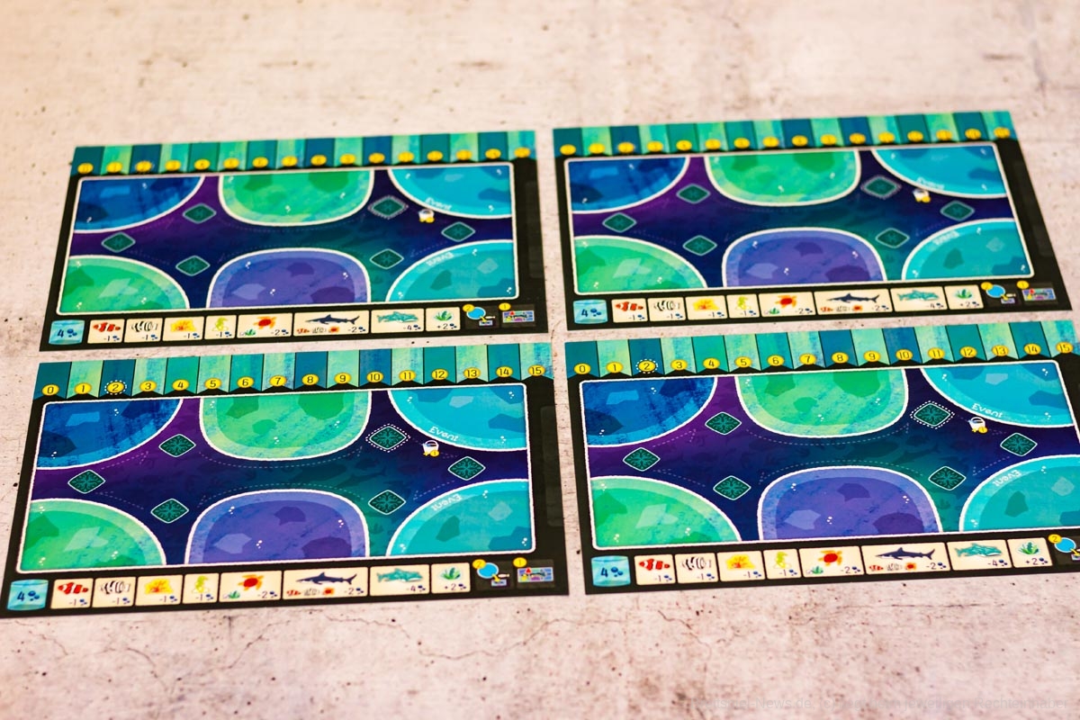 Das ist auch nötig, um einige der Meilensteine zu erfüllen. Unter der Aquariummesse liegen Karten mit besonderen Konstellationen, die in einem Tank vorhanden sein müssen, damit ein eigener Marker auf diese Karte gelegt werden darf. Das Erfüllen eines Meilensteins bringt Punkte und sogar extra Meeresbewohner, sollte man die erste Person sein, die diese Aufgabe meistert.