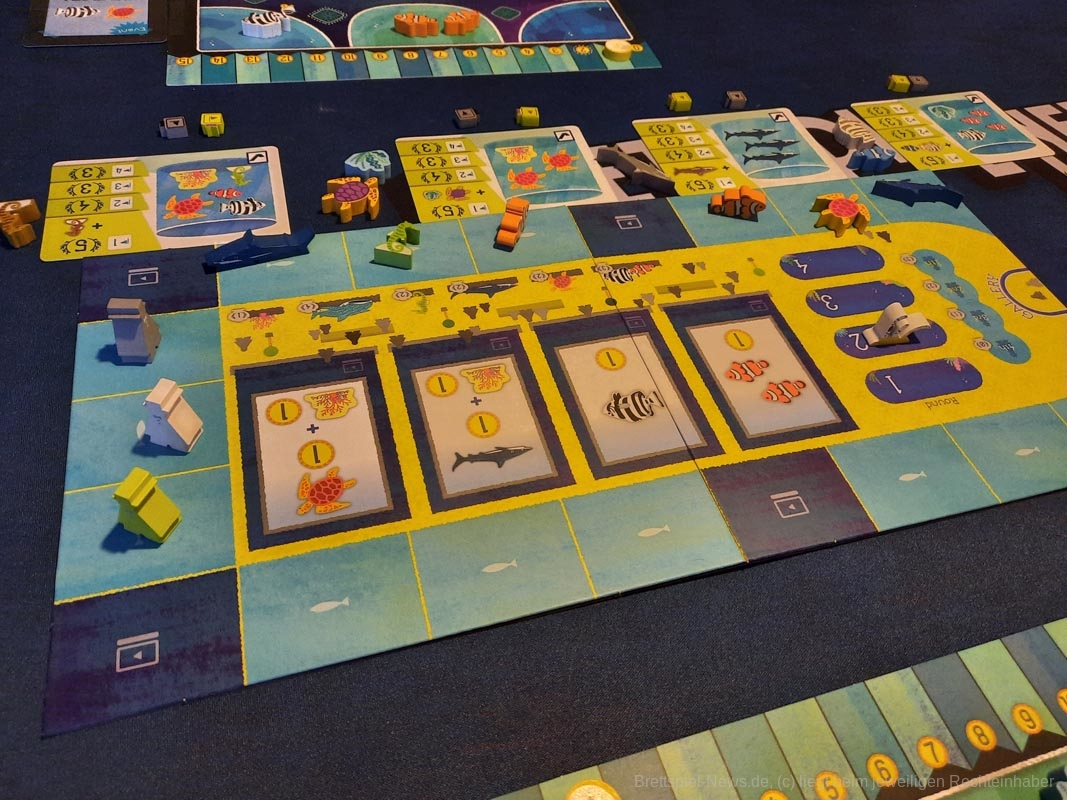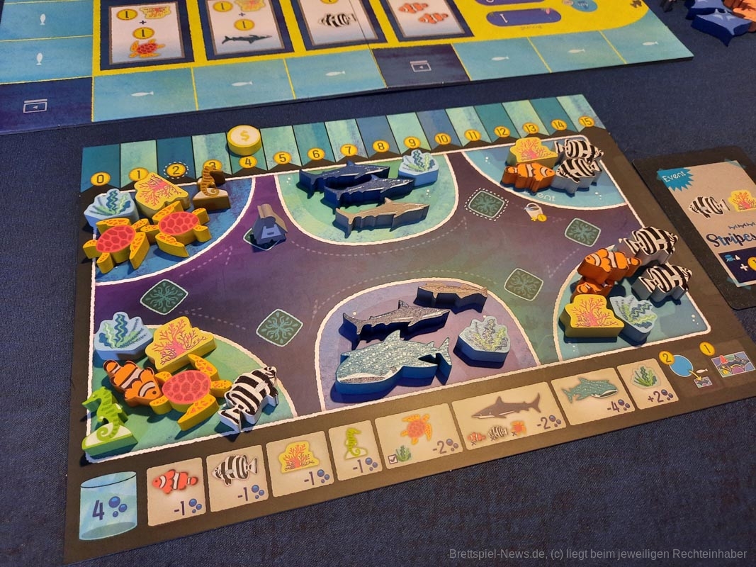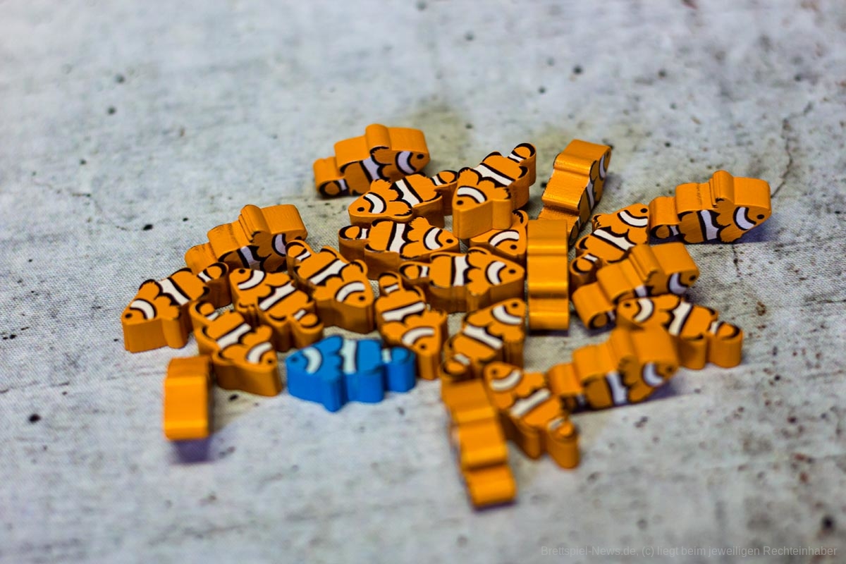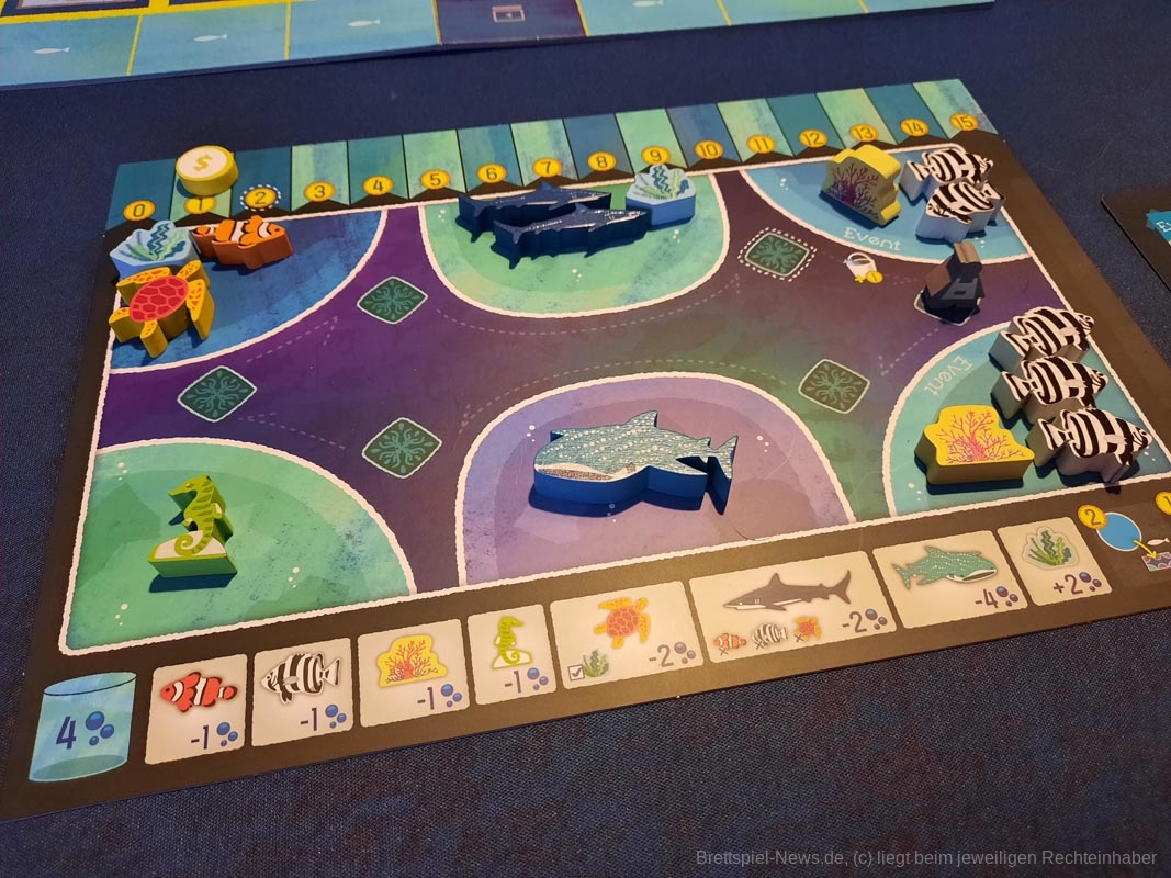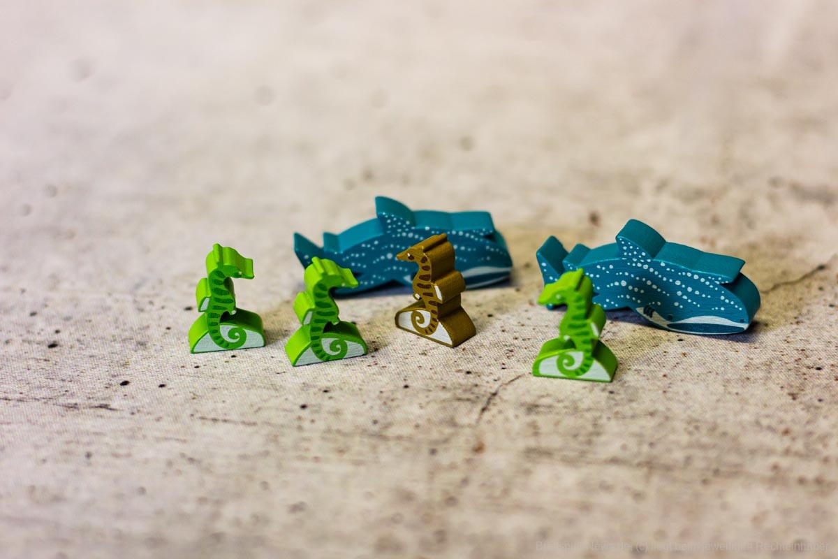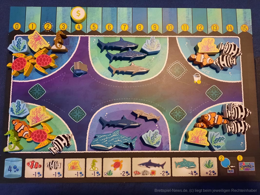 Das geht je nach Personenanzahl ein paar Runden und am Ende wird ausgewertet. Die einzelnen Meeresbewohner bringen unterschiedlich viele Punkte, die Meilensteine bringen Punkte, überschüssiges Geld und die Position der eigenen Figur auf der Aquariummesse ebenfalls.