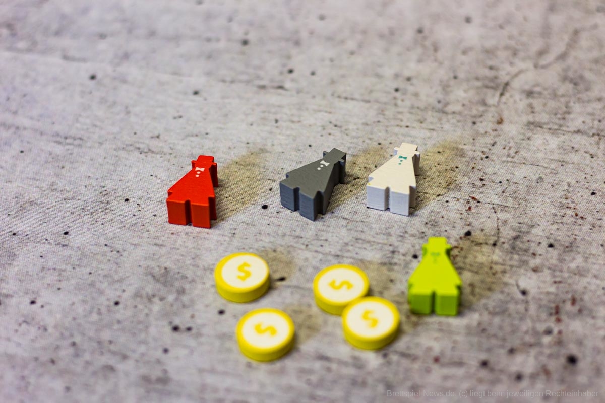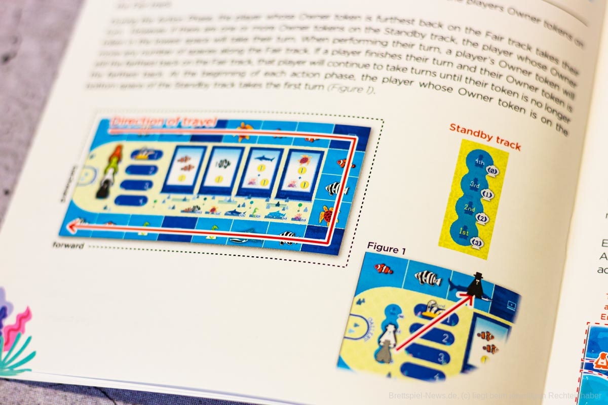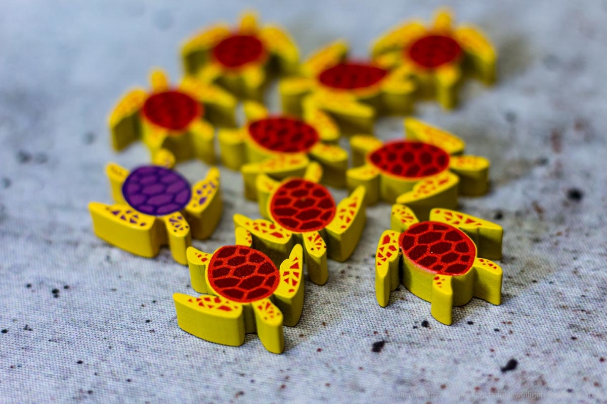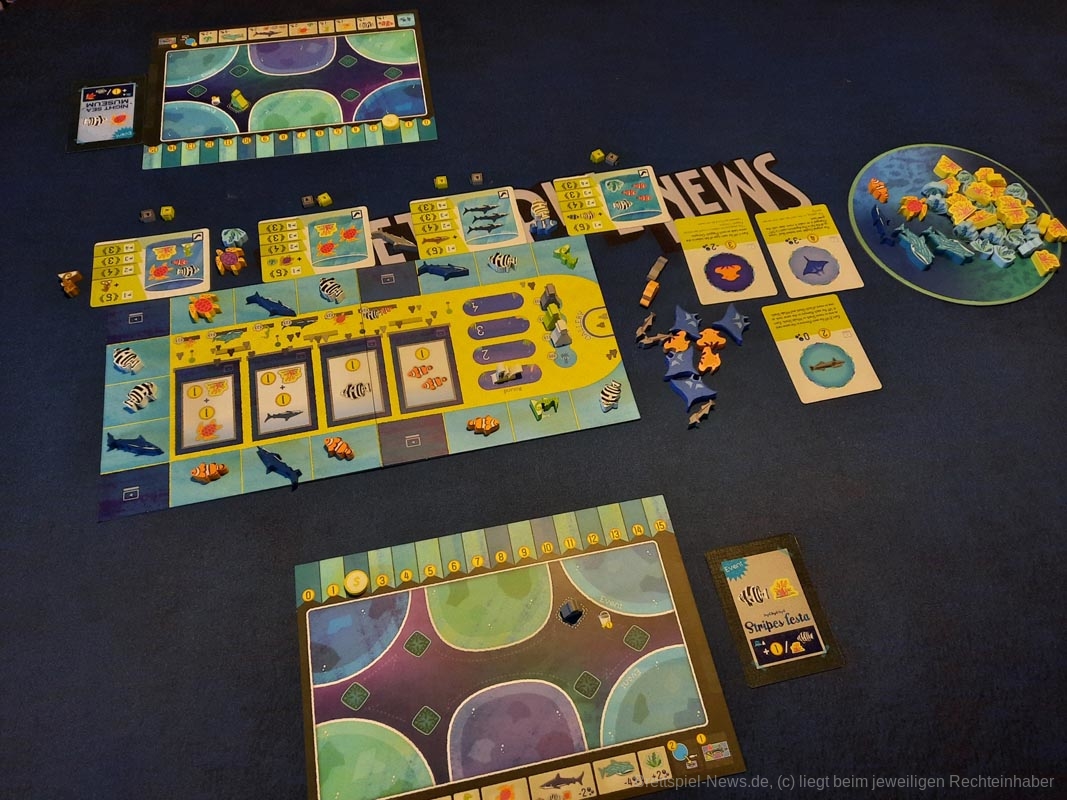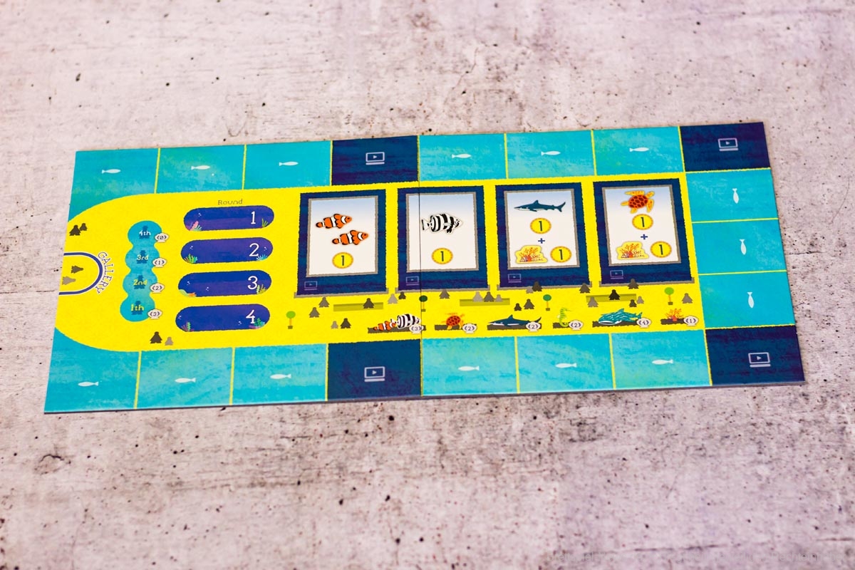 Das geht je nach Personenanzahl ein paar Runden und am Ende wird ausgewertet. Die einzelnen Meeresbewohner bringen unterschiedlich viele Punkte, die Meilensteine bringen Punkte, überschüssiges Geld und die Position der eigenen Figur auf der Aquariummesse ebenfalls.