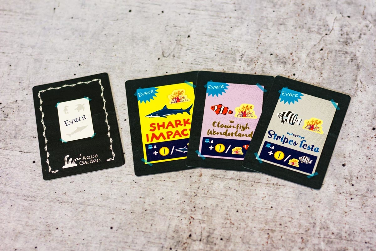 Was mir gleich beim Lesen der Anleitung auffiel, ist, dass die Eventkarten unausbalanciert wirken. Die Anzahl der verschiedenen Meeresbewohner ist unterschiedlich. Ein Clownfisch ist 23 Mal im Spiel, aber ein Hai und eine Schildkröte jeweils nur 9 mal. Jetzt fordert eine Eventkarte einen Clownfisch, aber eine andere einen Hai oder einer Schildkröte. Zwar bringt ein Hai mehr Punkte als ein Clownfisch, zwingt eine Person aber vielleicht zu einem riesigen Schritt auf der Auqariummesse, weil der einzige Hai in dieser Runde auf jeden Fall gesichert werden muss. Wer Clownfische sammelt hat dieses Problem nicht.