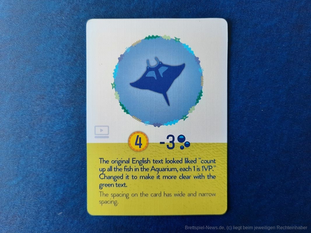 Zudem kommt noch, dass es mit den erweiterten Regeln der „Manta Ray“ ins Spiel kommt, dessen englische Karte eine Anweisung enthält, wie der Text auf der Karte geändert werden soll. Was nicht passiert ist. Schaut man in die Anleitung, um die Regeln für die Karte nachzuschlagen, bricht der Regeltext einfach mitten in einem Satz ab.