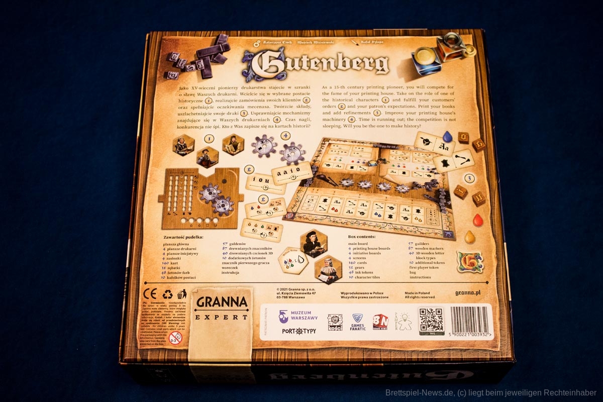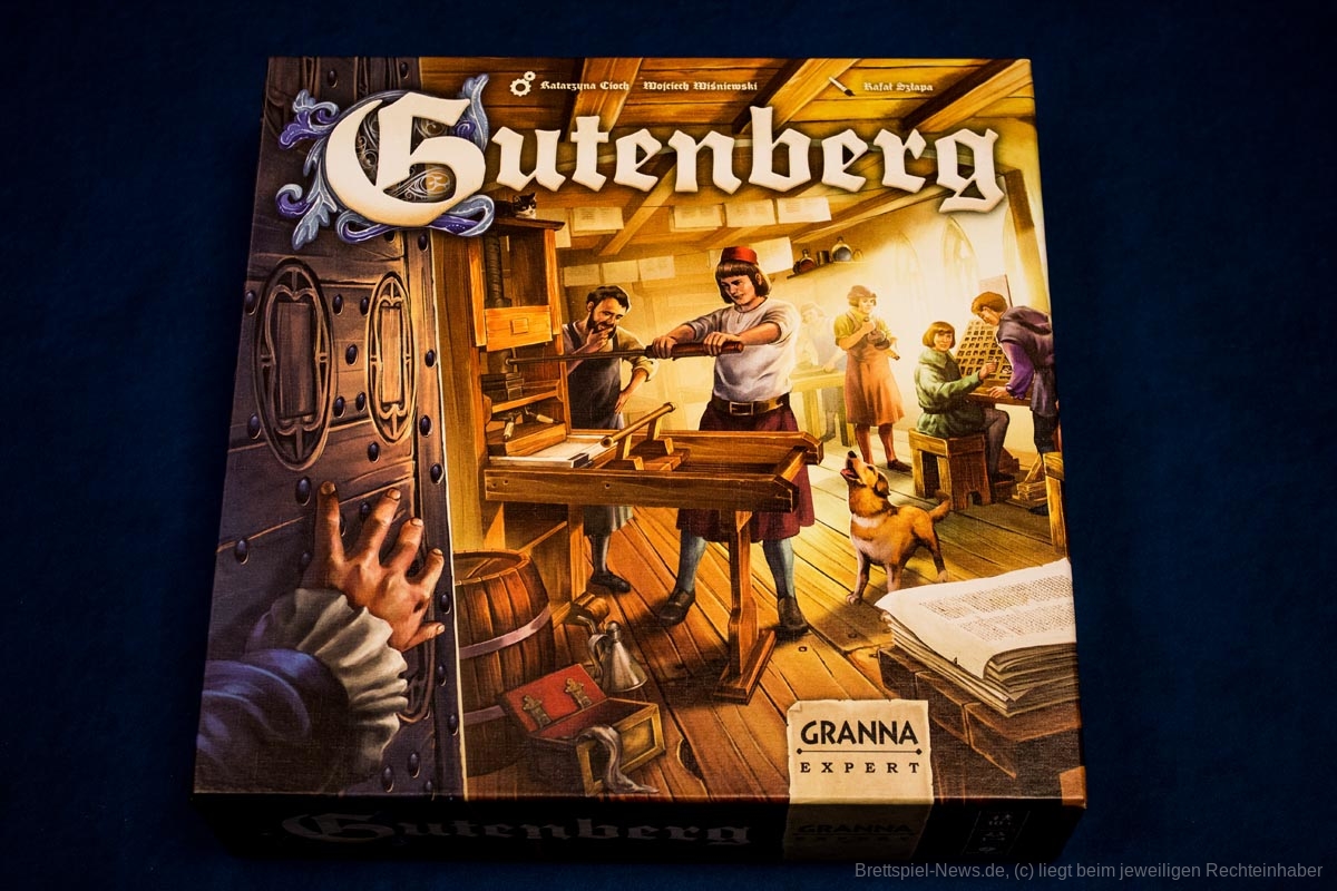 „Gutenberg“ bringt ein neues Thema in die Welt der Brettspiele, den Buchdruck. Die Umsetzung dieses Themas ist jedoch eher abstrakt, sodass die Mechaniken auch mit einem anderen Thema funktionieren würden. Die getestete Version ist die englisch/polnische Ausgabe herausgegeben von Granna, das Spiel auf Deutsch wird vom HUCH! Verlag vertrieben.
