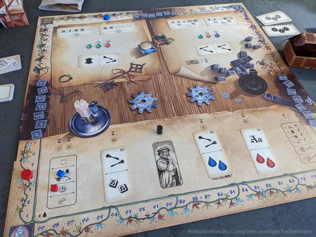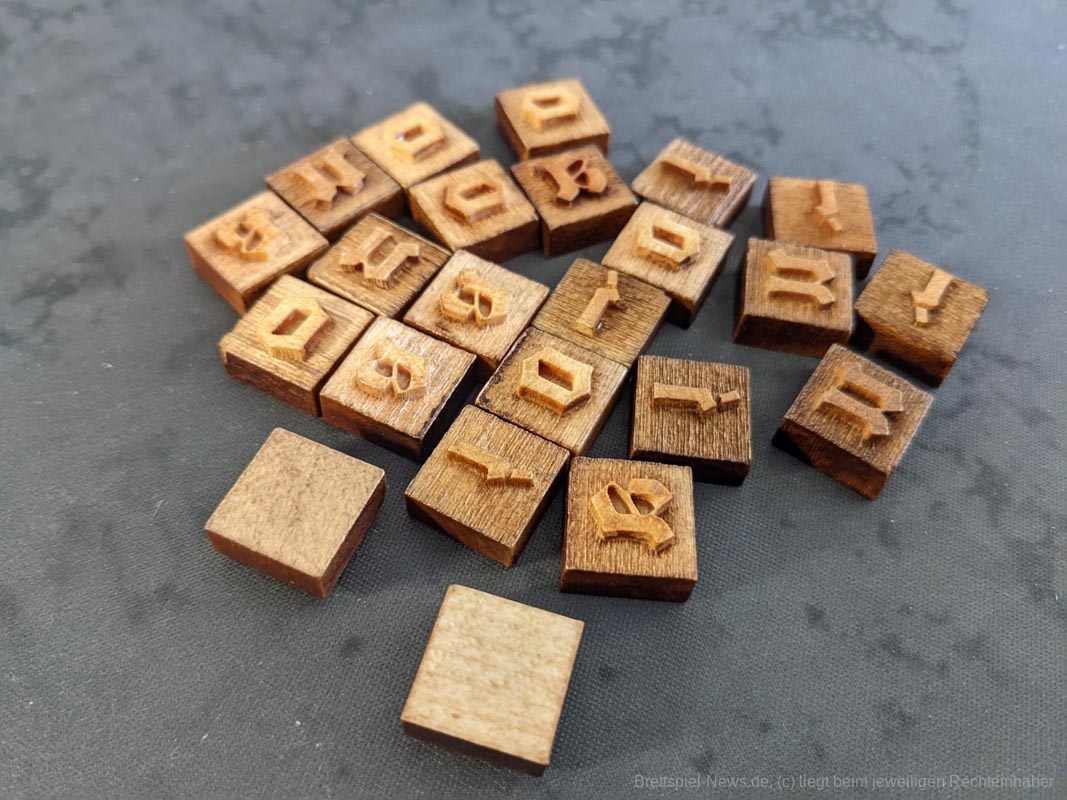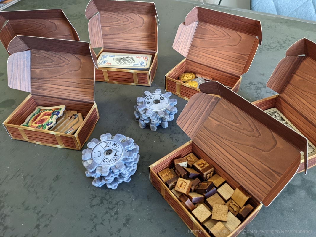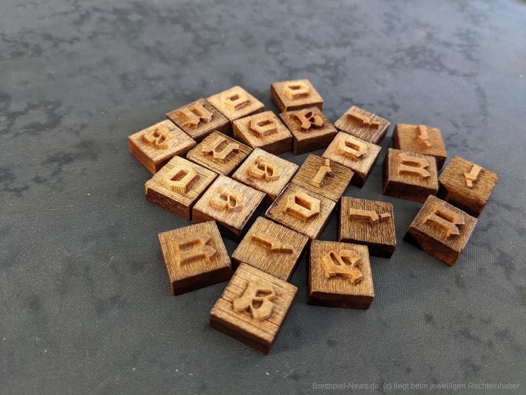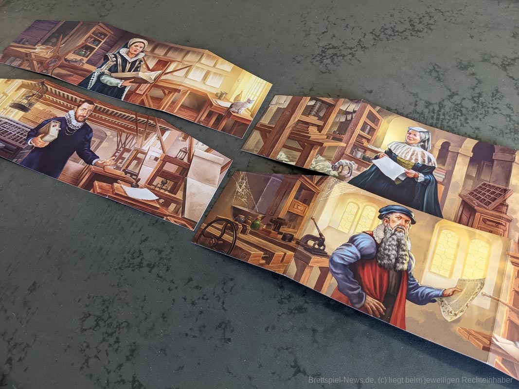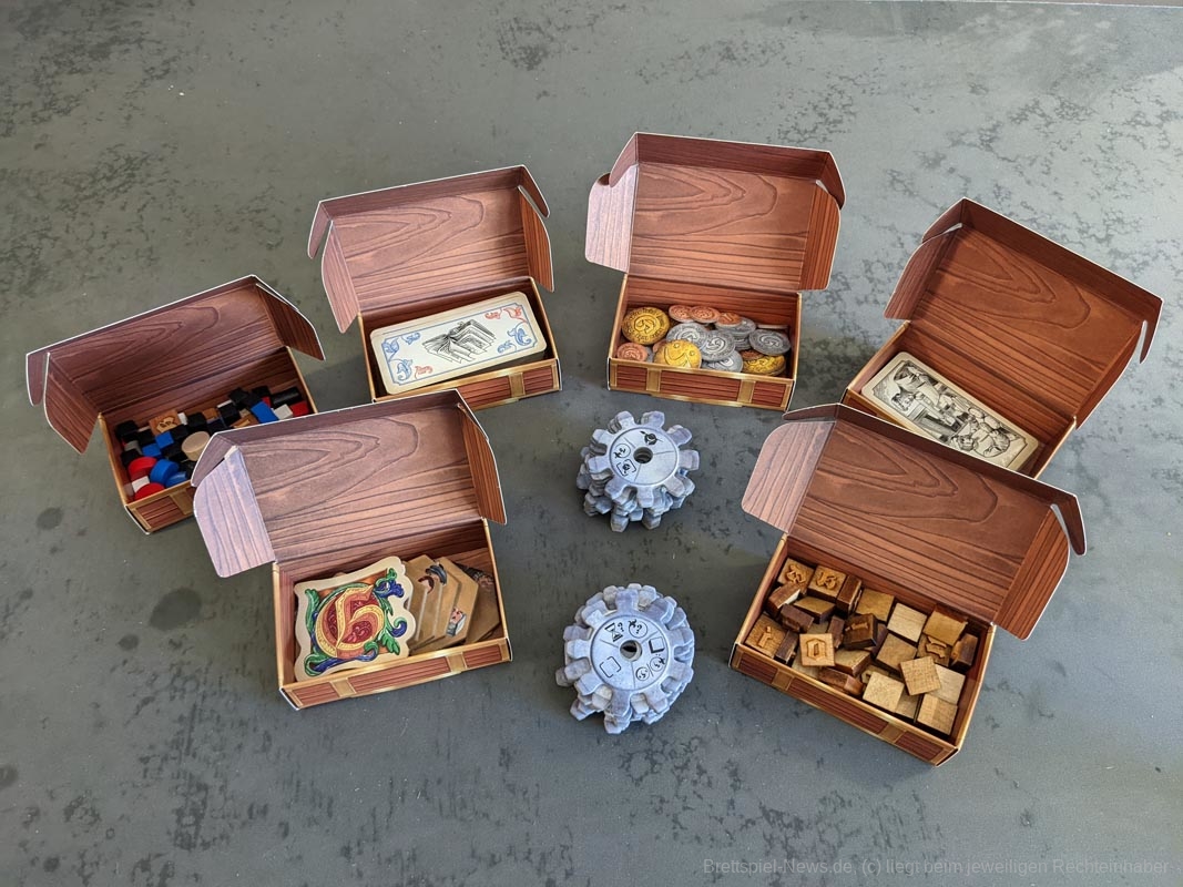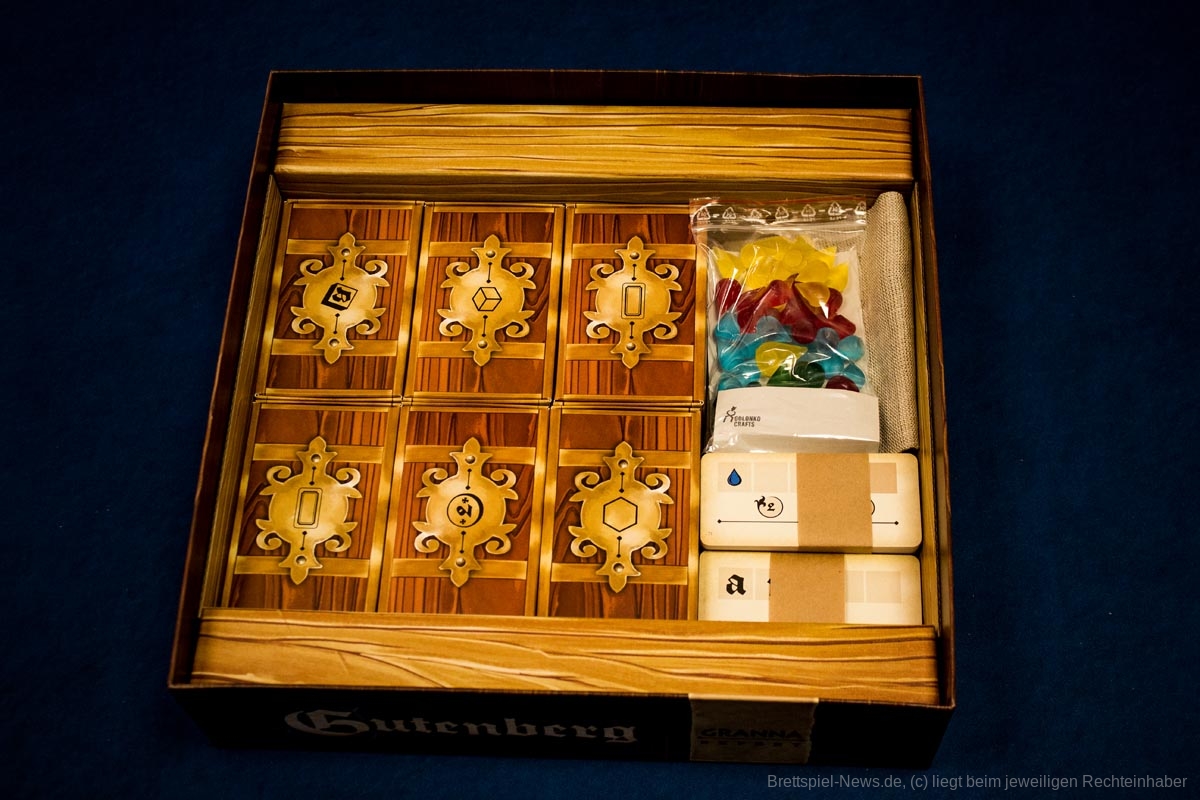 Das Artwork spiegelt das Thema gut wider, mit vielen kleineren Details. Auch die anderen Spielmaterialien sind hochwertig. Das gesamte Spiel kommt ohne Plastik aus. Anstelle eines Plastikinlays oder vielen Plastiktüten, liefert „Gutenberg“ sechs kleinere Pappschachteln mit, in denen sich der Großteil der Spielmaterialien verstauen lässt. Selbst die Spielkarten waren vor dem ersten Spiel nicht eingeschweißt, sondern wurden von einem Papierband zusammengehalten. Außerdem werden die Zahnräder auf den Playerboards nicht mit kleinen Plastikteilen befestigt, stattdessen werden hierfür kleine Holzscheiben verwendet. Die mitgelieferten Druckbuchstaben aus Holz bieten eine tolle Haptik, sind für das Spiel und seine Mechaniken aber eher von geringem Mehrwert. Da wir diese nur besitzen müssen, um Aufträge zu erfüllen und „Gutenberg“ keinen wirklichen Druck enthält, hätten es Papptokens theoretisch auch getan.