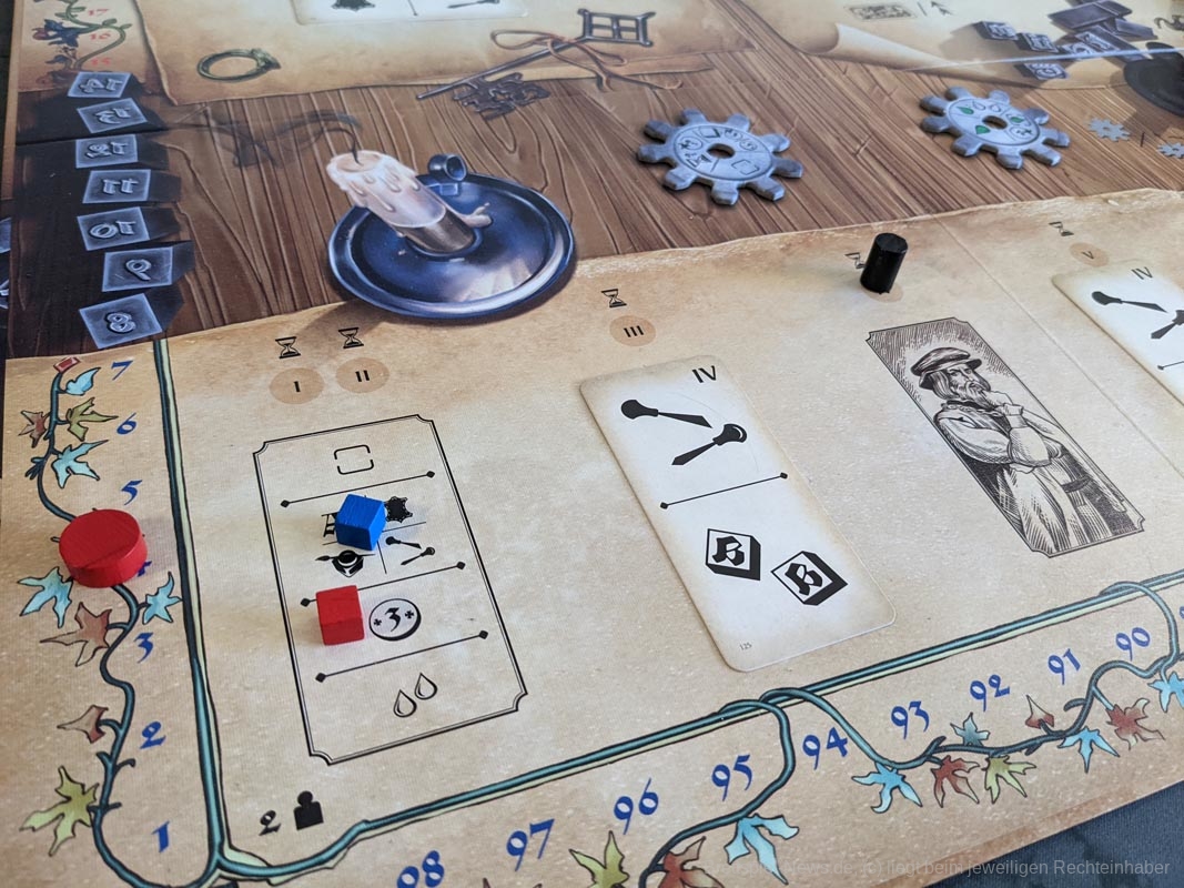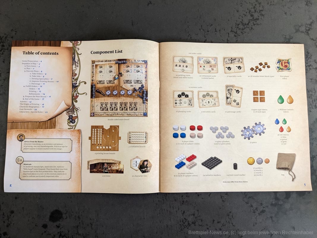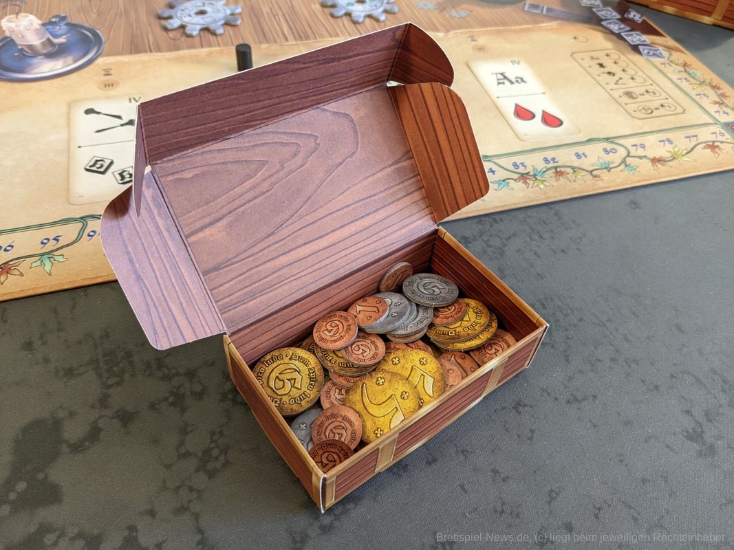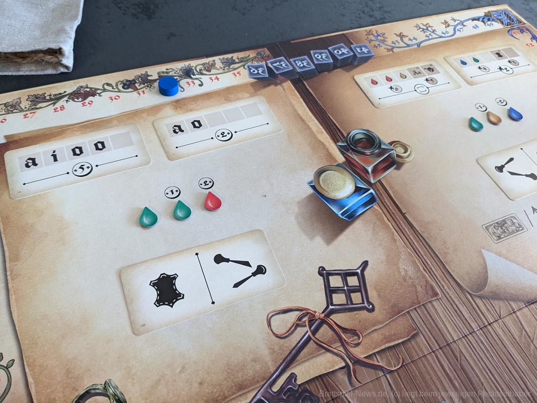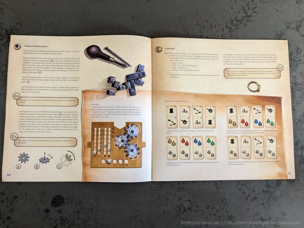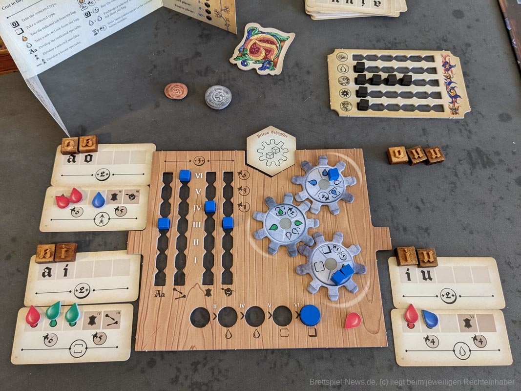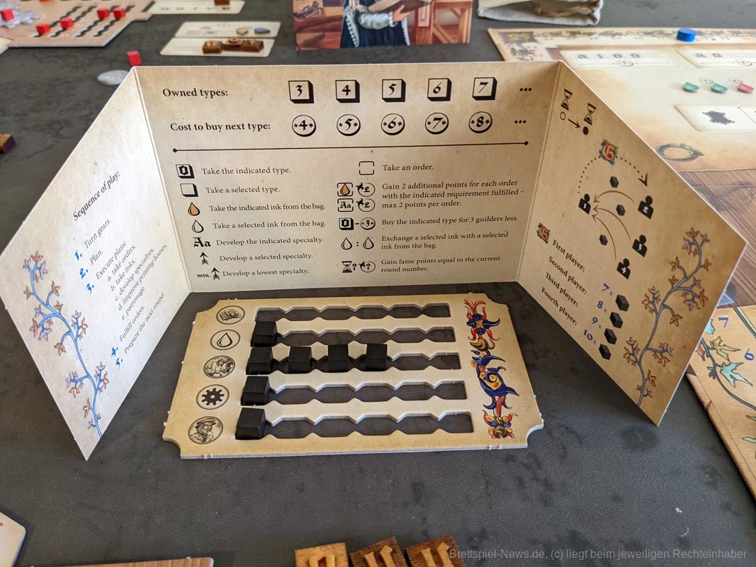 Das Artwork spiegelt das Thema gut wider, mit vielen kleineren Details. Auch die anderen Spielmaterialien sind hochwertig. Das gesamte Spiel kommt ohne Plastik aus. Anstelle eines Plastikinlays oder vielen Plastiktüten, liefert „Gutenberg“ sechs kleinere Pappschachteln mit, in denen sich der Großteil der Spielmaterialien verstauen lässt. Selbst die Spielkarten waren vor dem ersten Spiel nicht eingeschweißt, sondern wurden von einem Papierband zusammengehalten. Außerdem werden die Zahnräder auf den Playerboards nicht mit kleinen Plastikteilen befestigt, stattdessen werden hierfür kleine Holzscheiben verwendet. Die mitgelieferten Druckbuchstaben aus Holz bieten eine tolle Haptik, sind für das Spiel und seine Mechaniken aber eher von geringem Mehrwert. Da wir diese nur besitzen müssen, um Aufträge zu erfüllen und „Gutenberg“ keinen wirklichen Druck enthält, hätten es Papptokens theoretisch auch getan.
