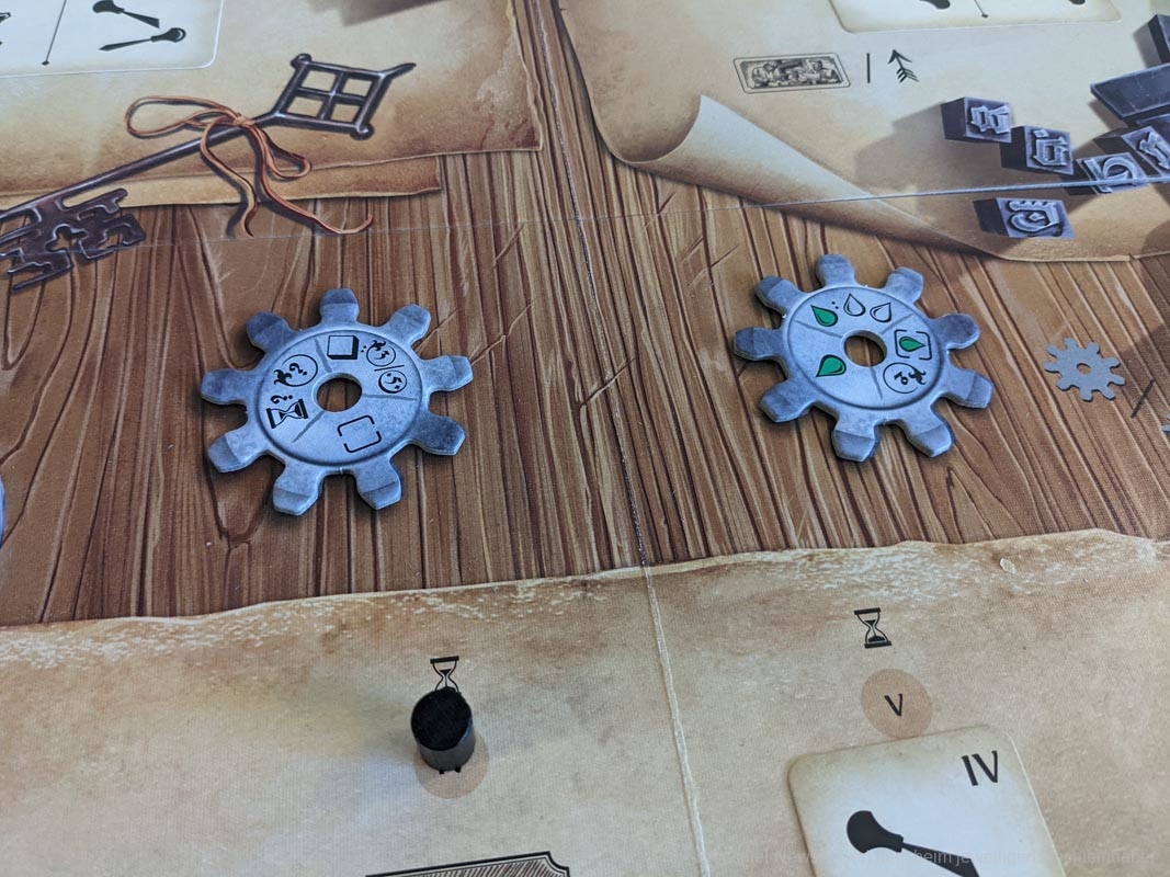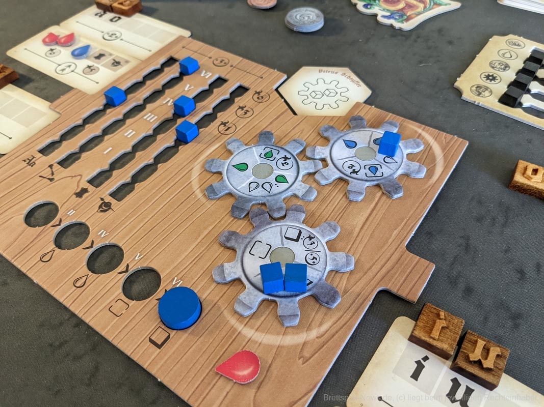 Zwischen den Runden ist viel zu tun, denn alle Farben, Zahnräder und Aufträge, die in der vorherigen Runde nicht gewählt wurden, gilt es nun zu ersetzen. Während andere am Tisch also schon in die Planungsphase übergehen, ist manch einer noch mit dem Aufbau der neuen Runde beschäftigt. Hier wäre es aus unserer Sicht sinnvoller und entspannter nur die gewählten Komponenten neu aufzufüllen.
