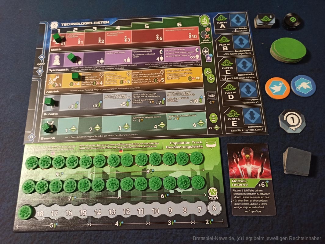 „Galactic Era“ ist ein umfangreiches Spiel. Es hat knapp 1,5 Stunden gedauert, das Spielmaterial auszupöppeln, die Flottenchips zu bekleben und sich mit der Geschichte und den Völkern vertraut zu machen. In einem 31 Seiten umfassenden Buch werden umfangreich Hintergrundinformationen zu dem übergeordneten Handlungsbogen, physikalische Annahmen, der Geschichte und den 17 Sternenvölker vorgestellt. Dies ist sehr interessant zu lesen und macht neugierig auf die erste Partie, für die ein großer Tisch sehr empfehlenswert ist.