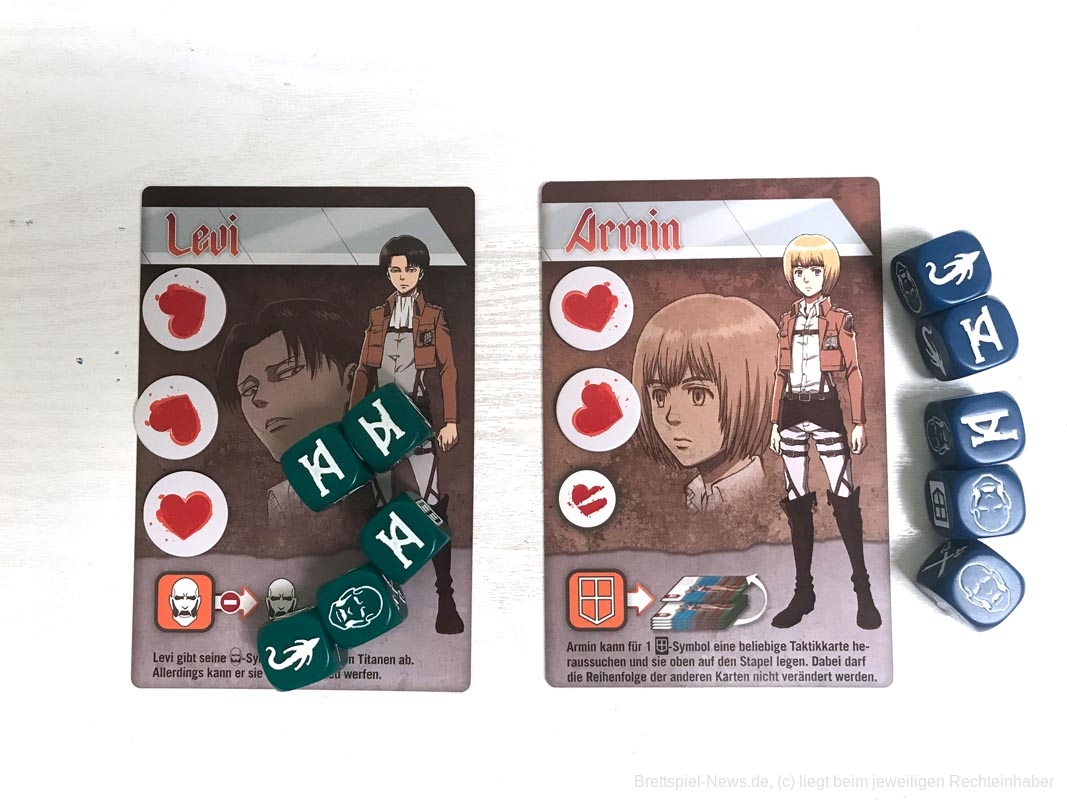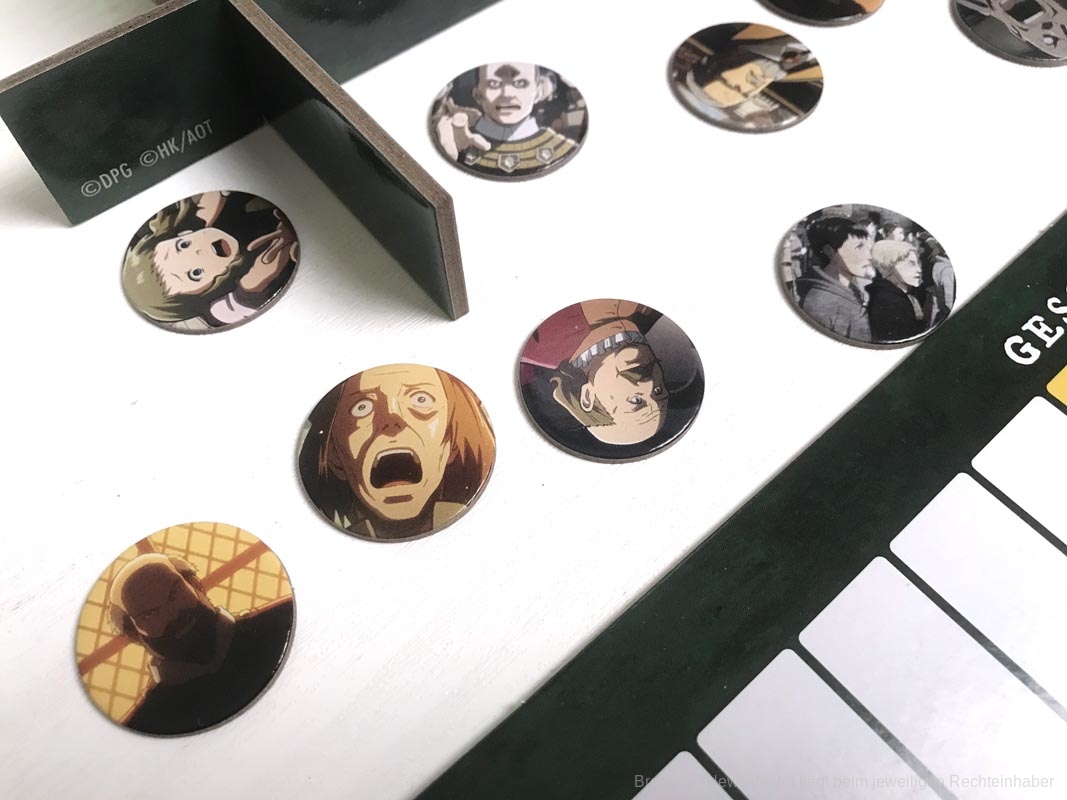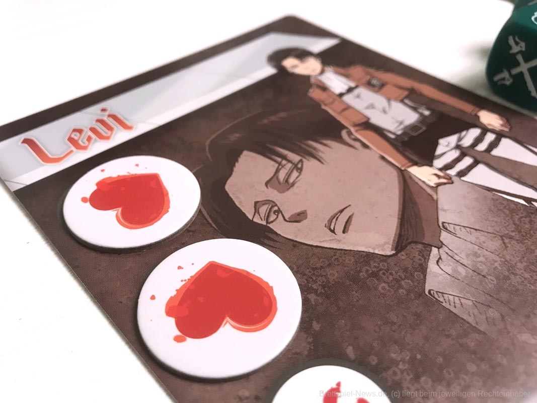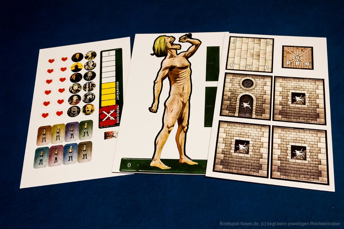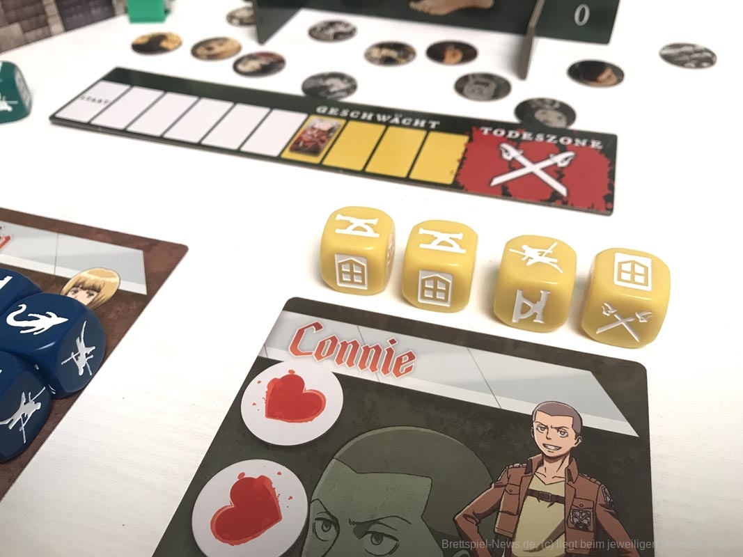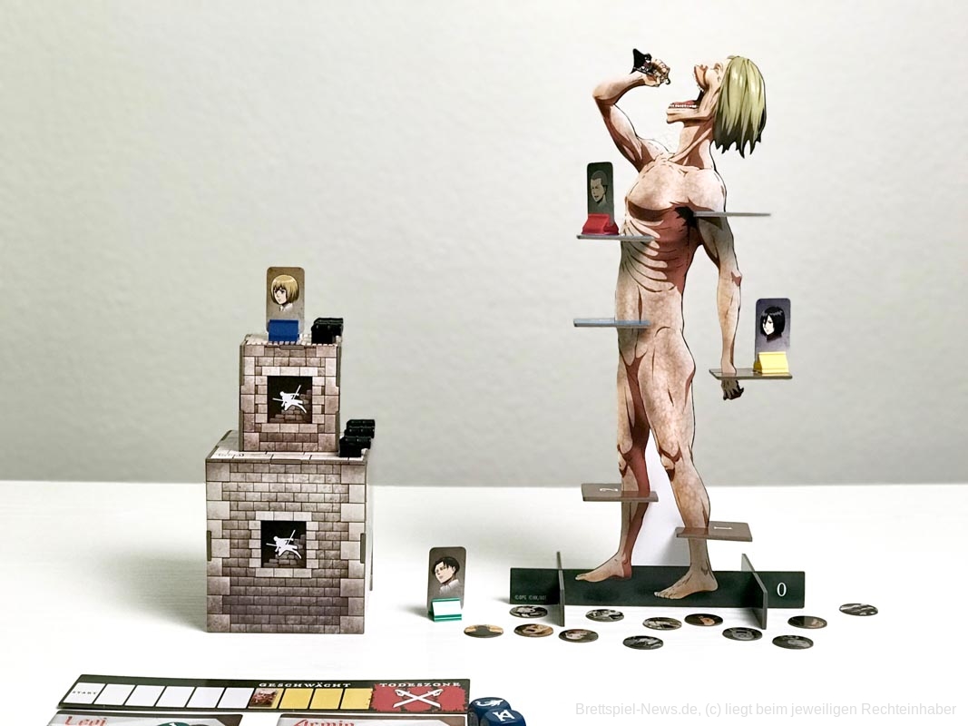 Die 3D-Elemente verleihen „Attack on Titan: The Last Stand“ eine tolle Tischpräsenz. Sie sind stabil verarbeitet, werden aber sicherlich durch den nötigen Auf- und Abbau nicht schöner. Es gibt insgesamt 20 farbige Würfel, für jede Person fünf Stück.