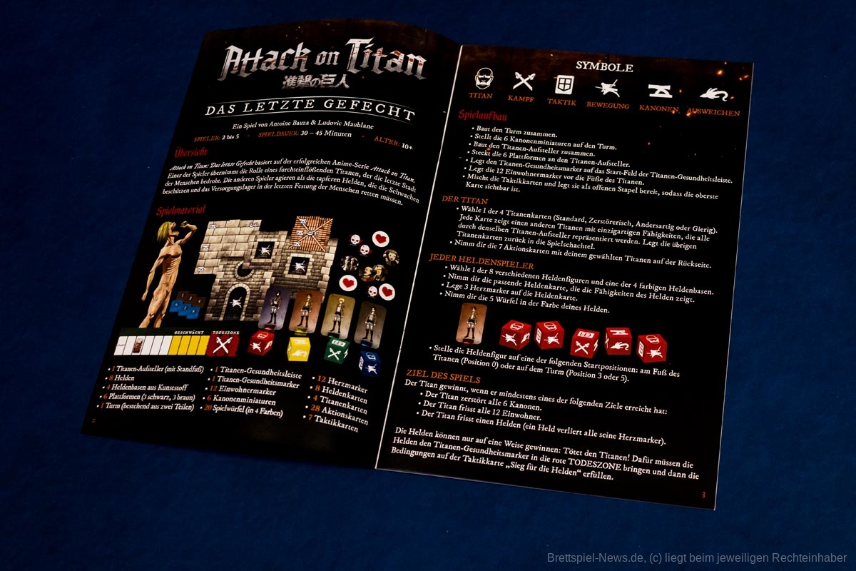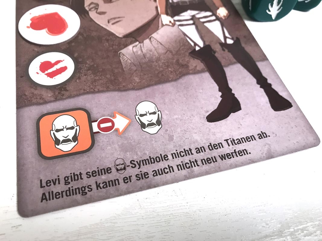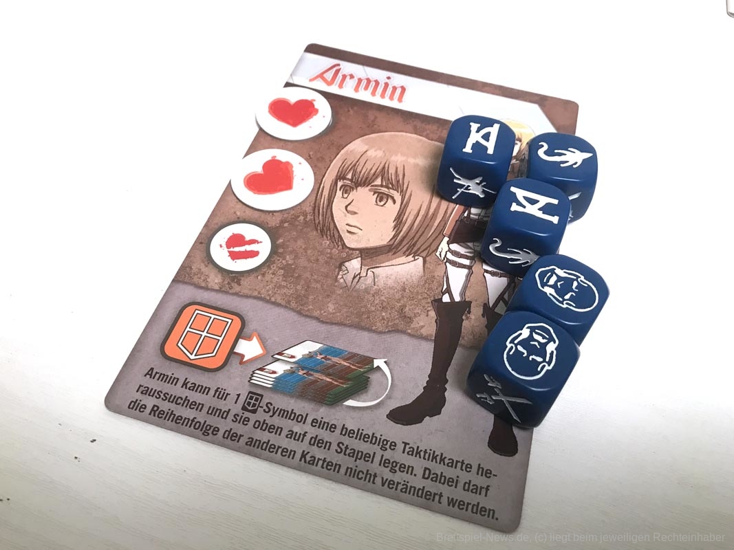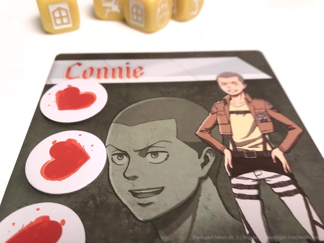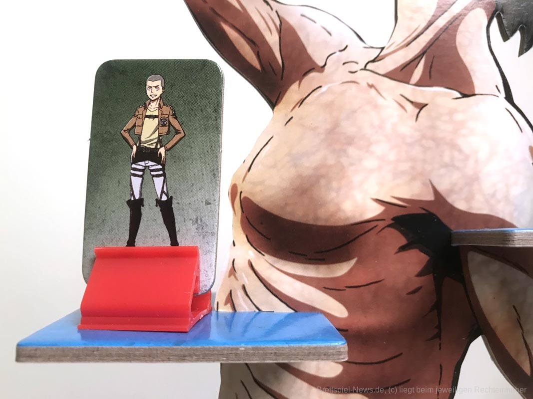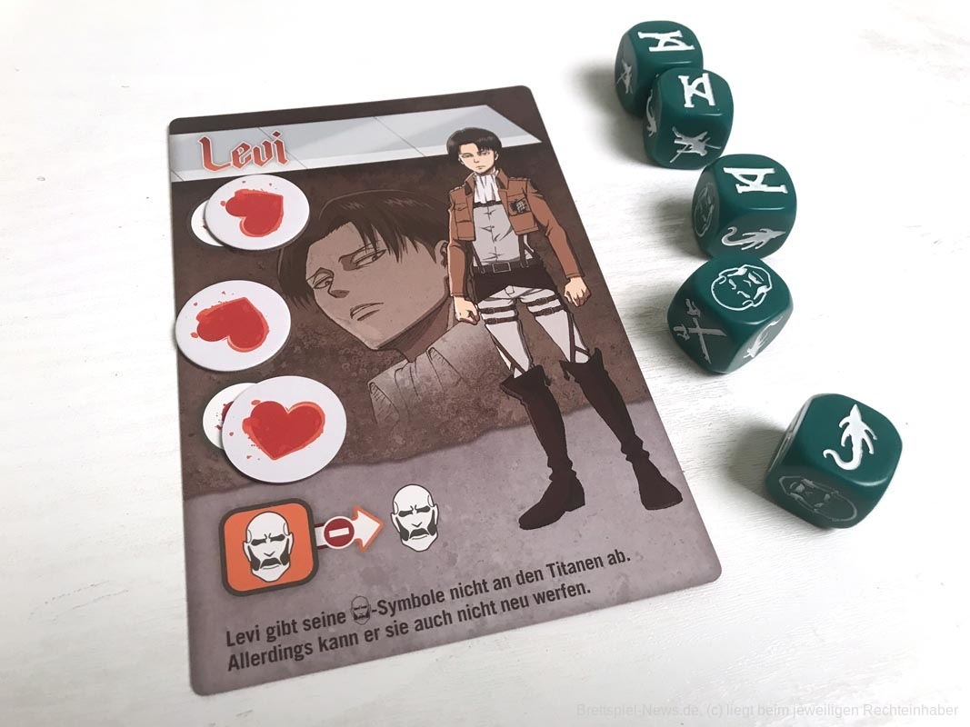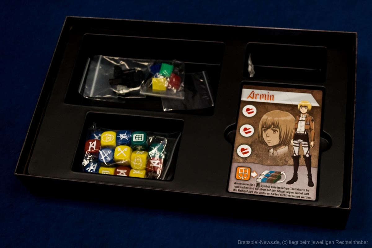 Die 3D-Elemente verleihen „Attack on Titan: The Last Stand“ eine tolle Tischpräsenz. Sie sind stabil verarbeitet, werden aber sicherlich durch den nötigen Auf- und Abbau nicht schöner. Es gibt insgesamt 20 farbige Würfel, für jede Person fünf Stück.