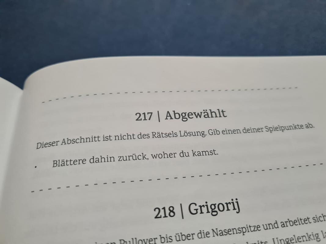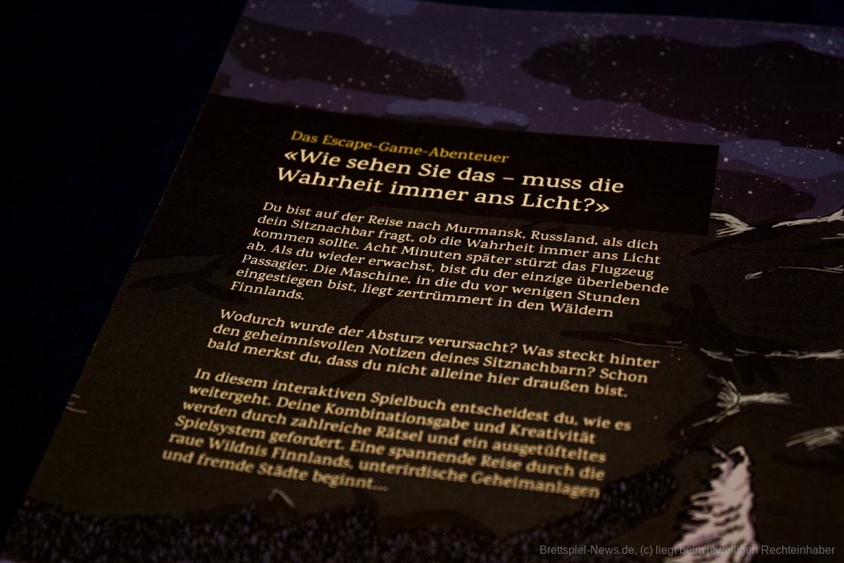 Als ich damals bei Brettspielnews.de anfing, dachte ich nicht im Traum daran, dass mal ein eher klassisches Buch auf meinem Tisch landen würde. So ulkig ich die ganze Sache fand, so interessiert war ich auch daran, den Grund dafür zu erfahren. So ist „Jagd auf den letzten Passagier“ kein Brettspiel im eigentlichen Sinne, sondern eher etwas für Buchfans, wobei die Grenzen hier sichtbar verschwimmen. Festzuhalten ist, dass „Jagd auf den letzten Passagier“ in seiner Form eher etwas für eine Solo-Partie ist. Zwar lässt sich die Geschichte vorlesen und die Rätsel im Anschluss gemeinsam lösen, dass das Buch aber nicht dafür gedacht zu sein scheint, ist schnell zu merken. Das liegt auch an einem der größten Minuspunkte, den ich beim „Lesen/Spielen“ wahrgenommen habe. Durch die Verweise der Textpassagen wird sehr viel umgeblättert. Während die Hinweise in der Mitte des Buchs sind, sind Hilfestellungen hinten und das eigentliche Rätsel mittendrin. Um nicht vollends die Übersicht zu verlieren waren für meinen Durchlauf mehrere Lesezeichen von Nöten, damit ich kein unnötiges Gesuche mehr hatte. Auch die Rätsel an sich schicken Lesende viel von A nach Y zu C. Gehe zu Abschnitt 30, anschließend gehe zu Abschnitt 256 und dann zu Abschnitt 003. Durch die vielen Entscheidungen und Abweichungen ist es dem Buch nicht möglich einen flüssigen Spielablauf oder eine leichter zu erreichende Reihenfolge zu etablieren, was beim „entspannten Lesen für zwischendurch“ stören kann.