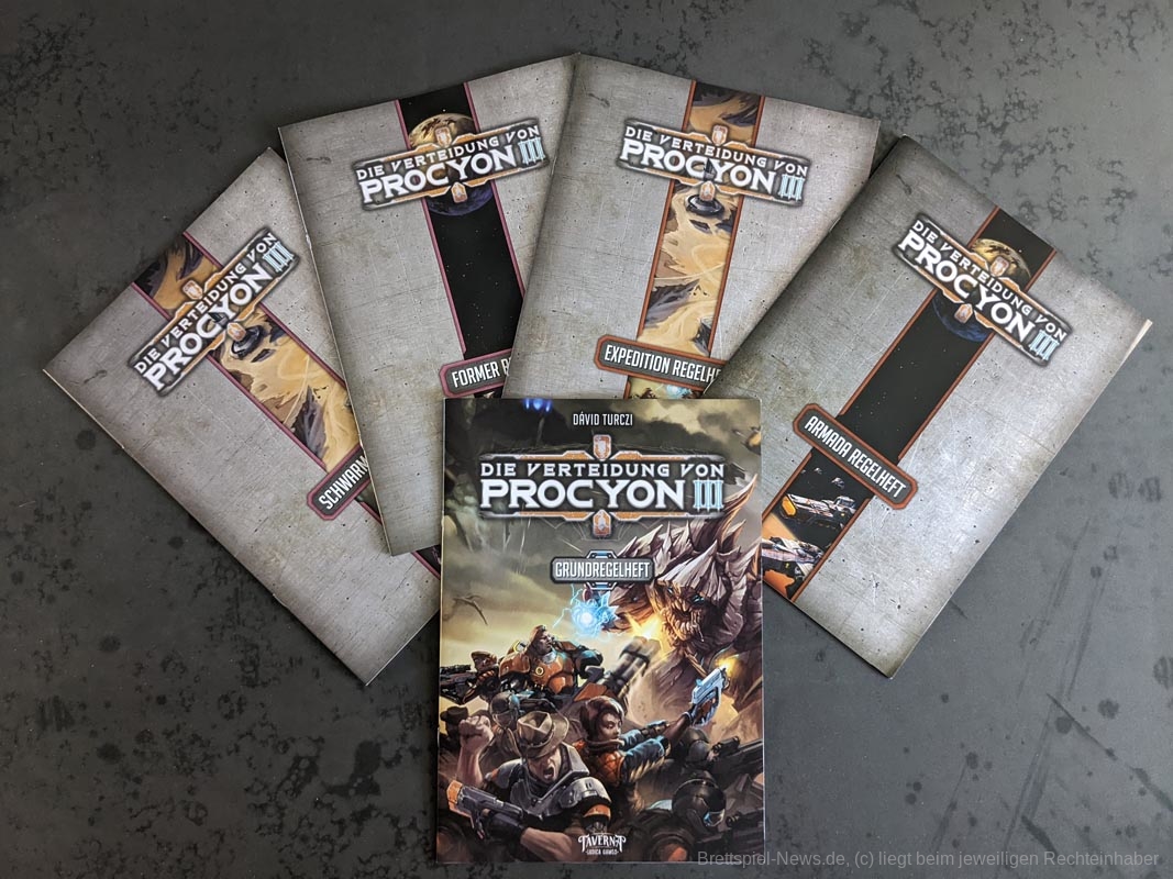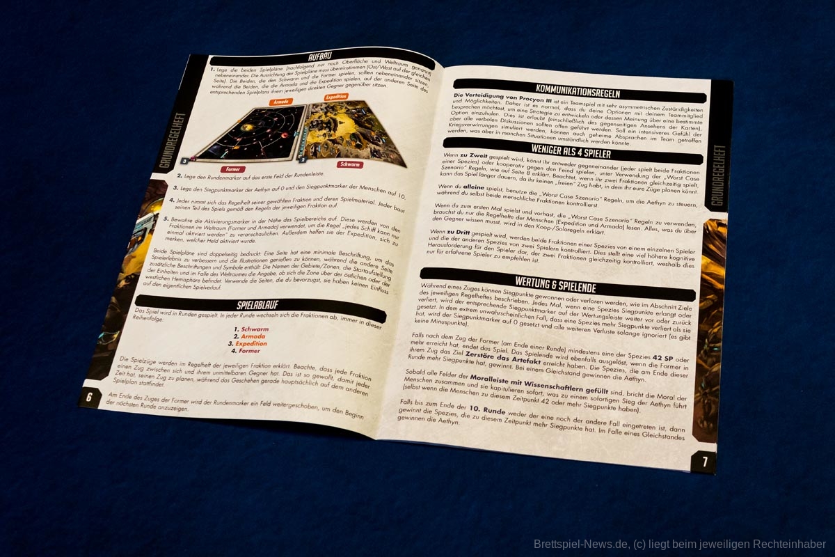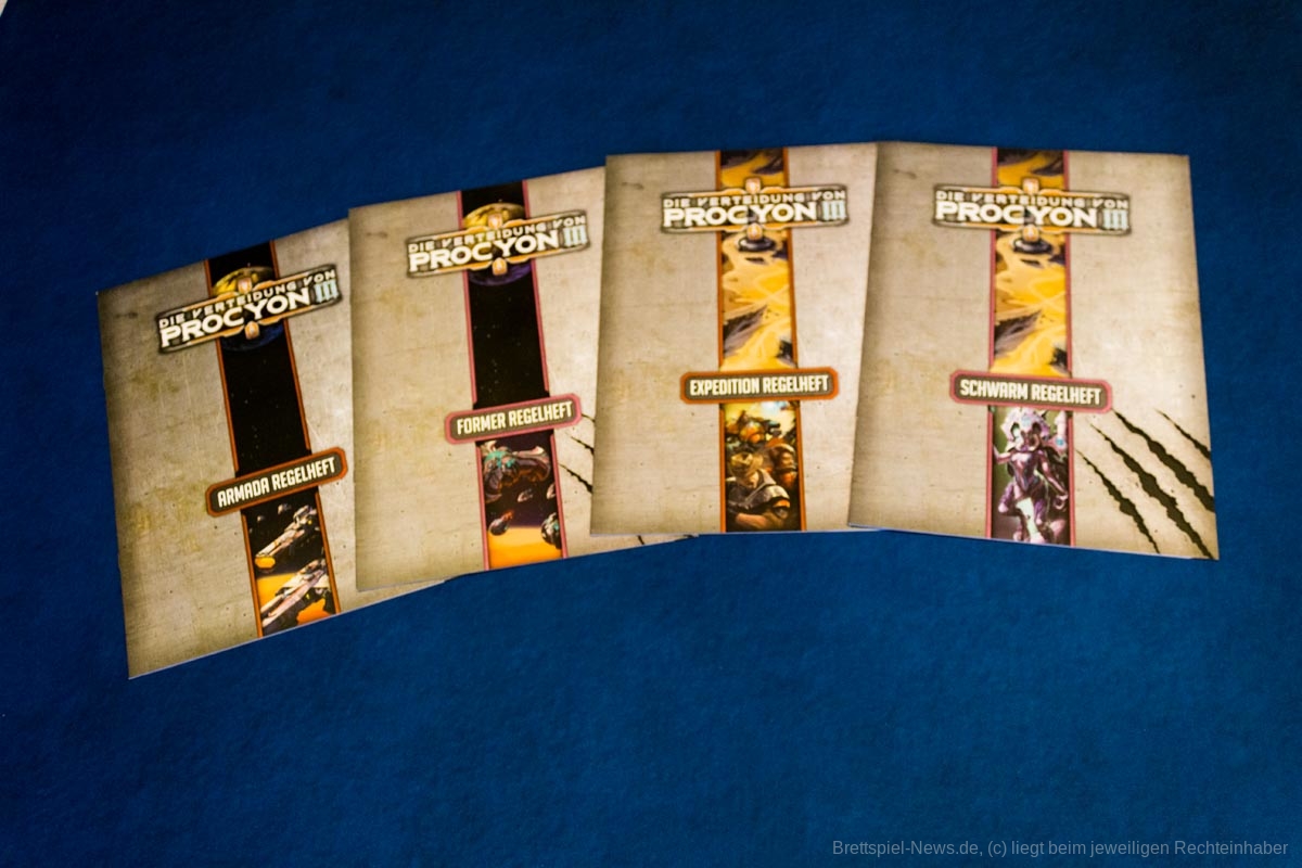 „Die Verteidigung von Procyon III“ schlägt ein wie eine Wucht. Und damit ist nicht nur das Gewicht der Spielschachtel mitsamt Spielmaterial gemeint. Die Einstiegshürde ist sehr hoch, da sich alle vier Fraktionen unterschiedlich spielen und auf dem Tisch im Prinzip zwei völlig verschiedene Spiele stattfinden. Da wir das Spiel nur zu zweit testen konnten, hat sich erstmal jeder mit zwei der fünf Regelhefte zurückgezogen, um sich die Lektüre bei einer heißen Tasse Tee zu Gemüte zu führen. Die Regeln sind jedoch eingänglicher als wir zunächst gedacht haben. Man sollte aber nicht vergessen, dass es sich immer noch um komplexes Expertenspiel handelt. Auf der Rückseite jeder Anleitung gibt es jeweils eine Kurzübersicht zur Fraktion, deren Funktionsweisen, eigenen Zielen und den Zielen der direkten Gegner. Diese Kurzübersicht muss hervorgehoben werden, da wir während des Spielens alle nötigen Informationen dort finden konnten. Ein ständiges Nachschlagen in den Regelheften wird damit vermieden. Ohne diese Übersichten kann ich es mir nicht vorstellen dieses Spiel zu spielen, da hierdurch der Einstieg und das Spielen selbst sehr stark vereinfacht werden.
