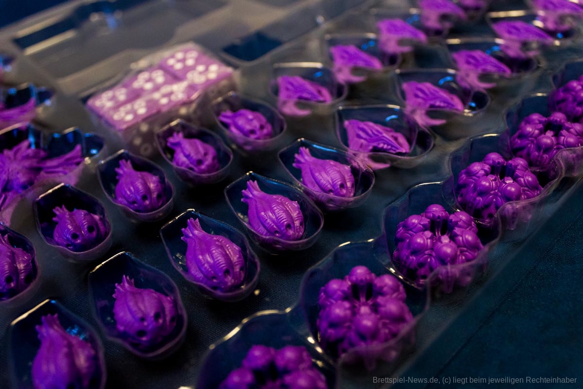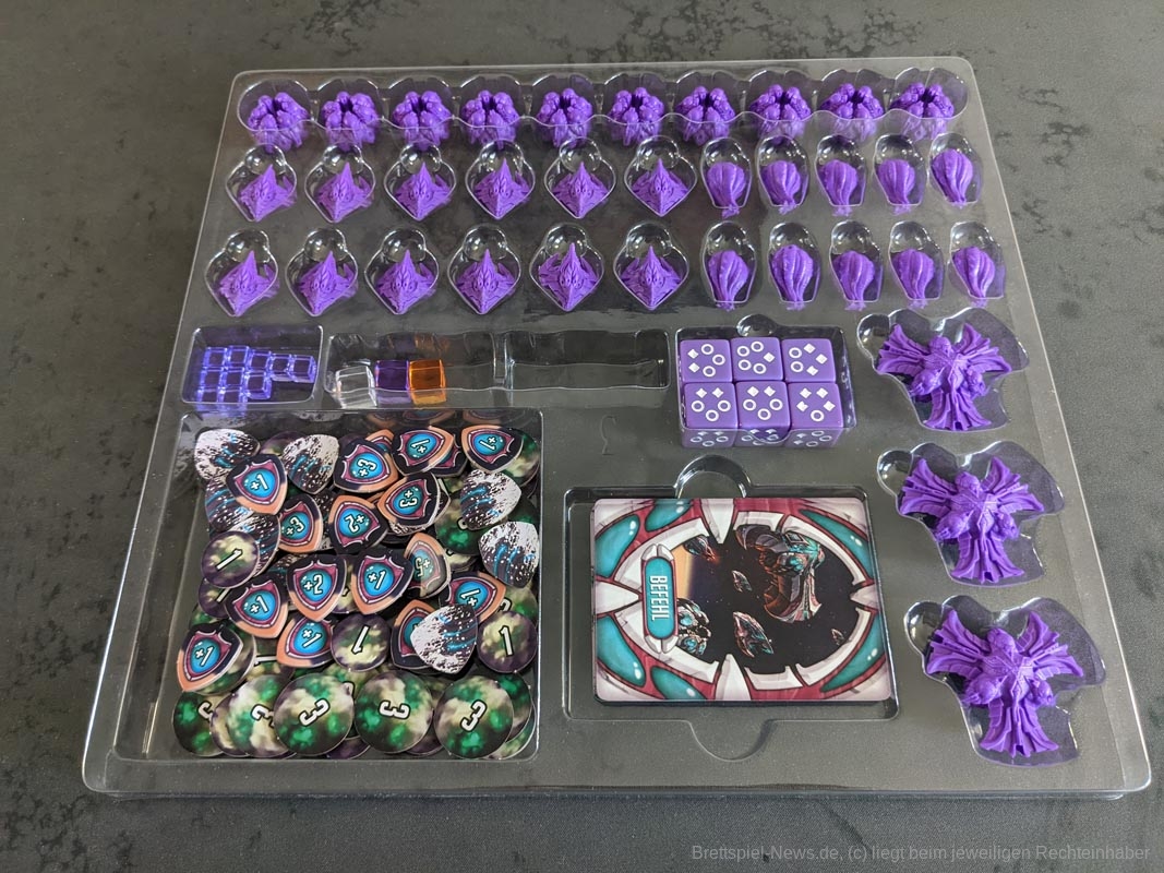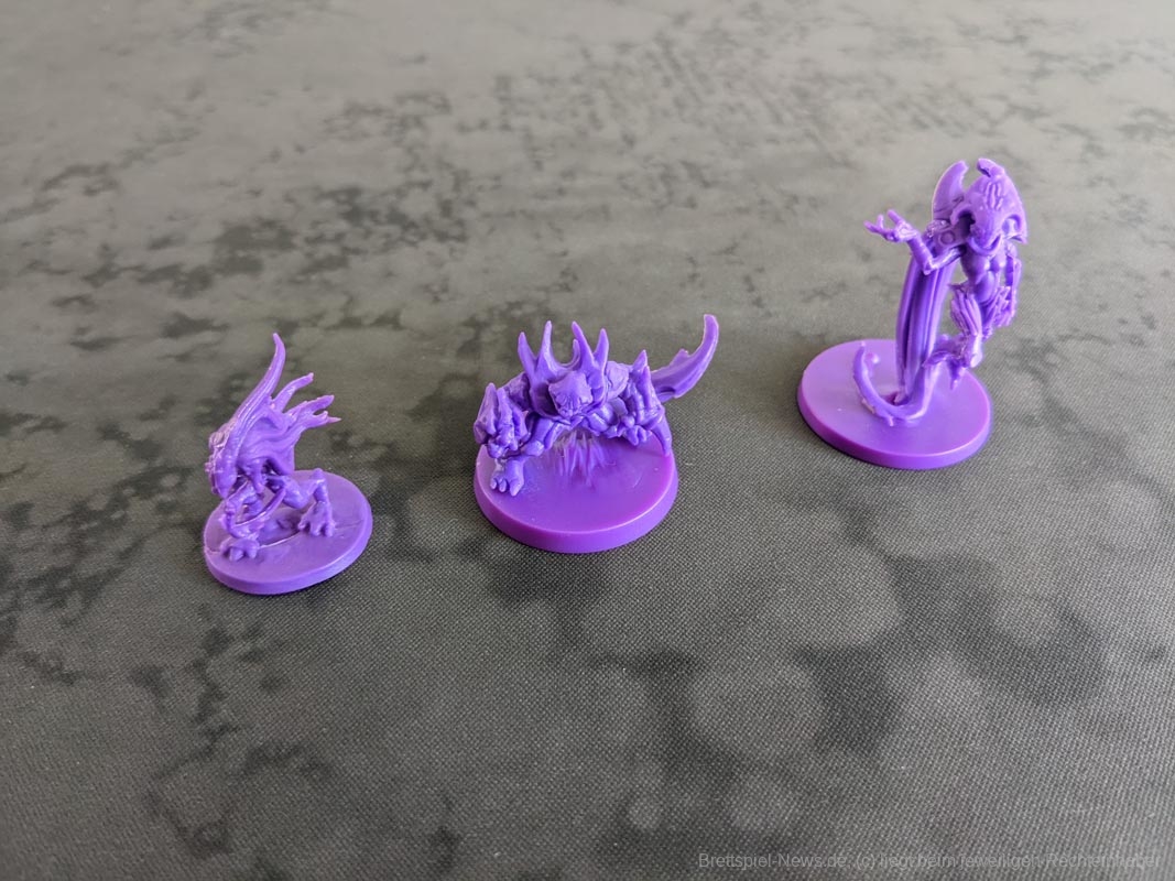 Der Auf- und Abbau des Spieles ist, aufgrund des umfangreichen Spielmaterials mühsam und nimmt einige Zeit in Anspruch. Aufgebaut hat das Spiel jedoch eine unglaubliche Tischpräsenz. Unsere Tischplatte (210cm x 90cm) war so gut wie nicht mehr zu sehen. Glücklicherweise lässt sich das gesamte Material in den mitgelieferten Inlays verstauen, sodass nichts in der Spielschachtel lose rumfliegen muss. Miniaturen sind reichlich vorhanden, die Qualität wirkt aber zu Teilen nicht mehr zeitgemäß und ist nicht vergleichbar mit Miniaturen von bspw. „Awaken Realms“. Zum Bemalen sind vor allem die Figuren der menschlichen Fraktion aufgrund der Detailarmut nicht unbedingt geeignet. Mit der Masse an Miniaturen auf den Spielbrettern fiel das für uns allerdings kaum ins Gewicht und brachte dem Spielspaß keinen Abbruch.