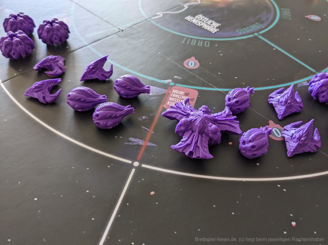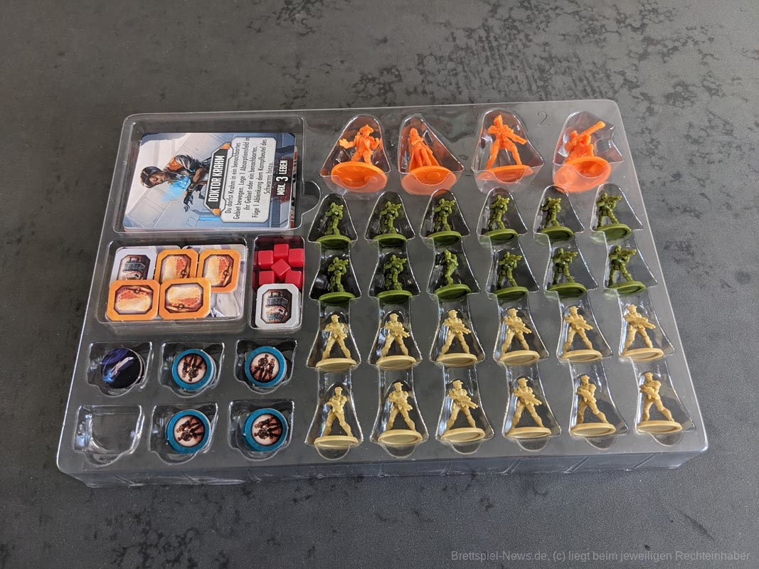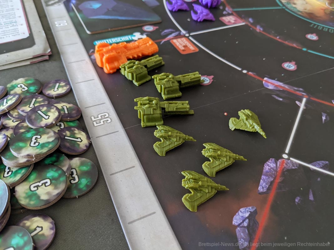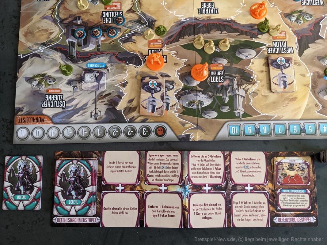 Die größte Besonderheit des Spiels liegt aber im Zusammenspiel der beiden eigentlich voneinander getrennten Schlachtfelder. Hier gibt es unserer Meinung nach Licht und Schatten. Das Spielprinzip ist besonders und haben wir so vorher noch nicht gesehen. Es ist wichtig die Aktionen zwischen den Fraktionen gut abzustimmen, um erfolgreich im Spiel zu sein. Wenn die Menschen der Oberfläche versuchen Wissenschaftler zu evakuieren macht dies nur Sinn, wenn die Flotte der Menschen dies im Orbit entsprechend vorbereitet hat. Wenn man der eigenen Fraktion auf dem anderen Spielbrett jedoch helfen muss, kommt es häufig vor, dass man auf eigene Spielzüge verzichtet und vornehmlich reagiert als agiert. So muss ein bereits geplanter Zug komplett umgeworfen werden nur um zu helfen, obgleich man selbst auf dem eigenen Schlachtfeld so gut wie gar nicht weiter kommt. Auch die möglichen Optionen könnte zahlreicher und abwechslungsreicher sein.