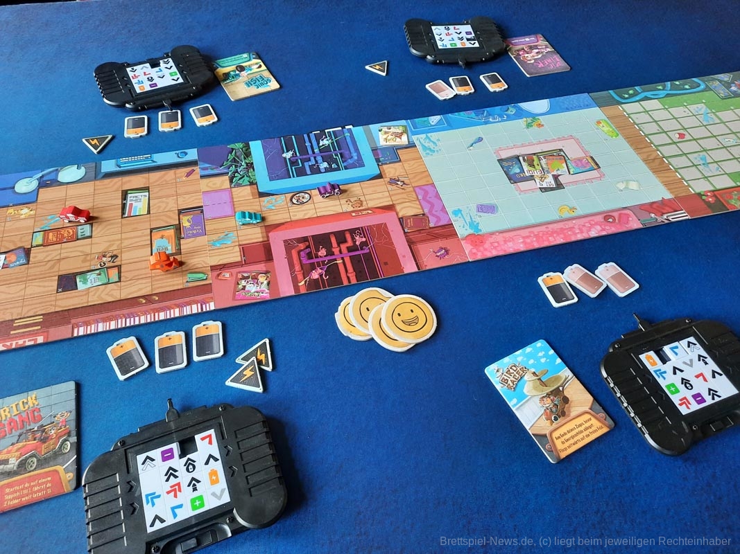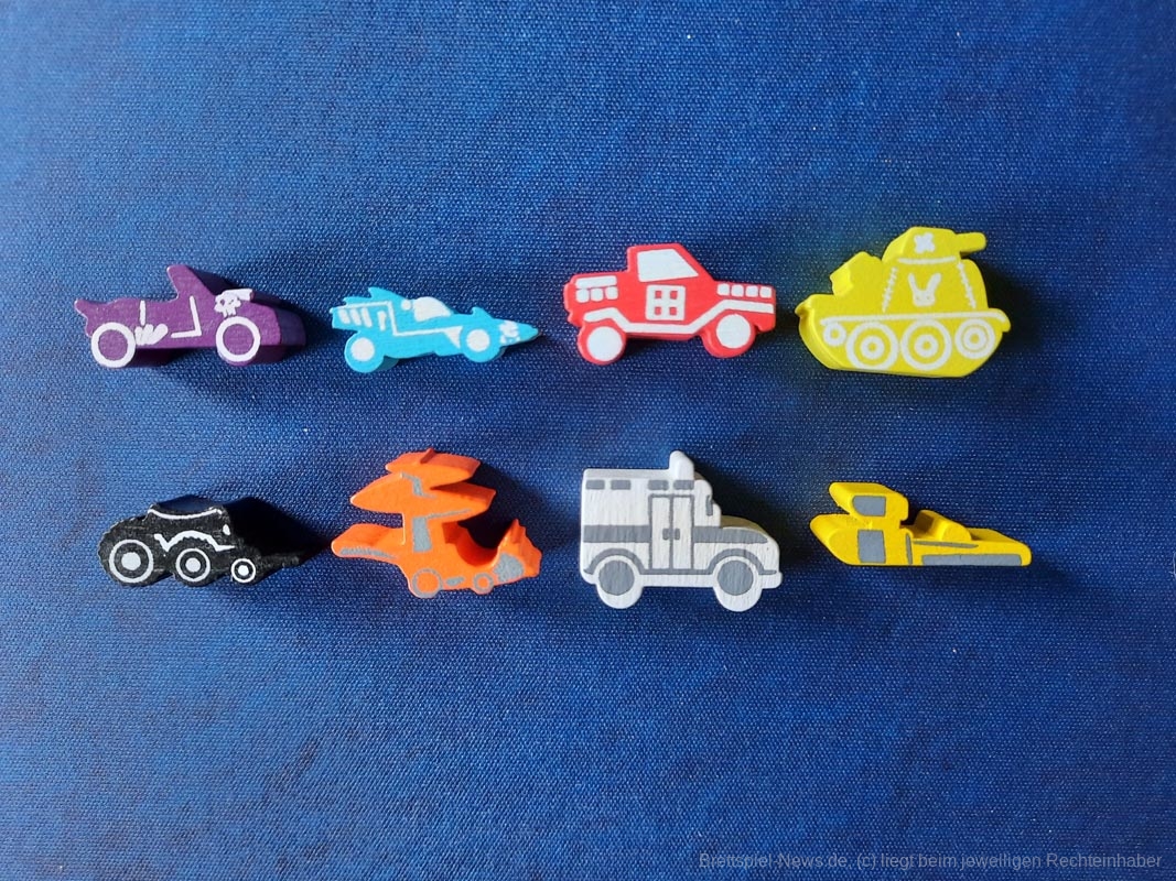 Die Idee mit der Fernbedienung ist super. Es wirkt erfrischend neu, passt thematisch sehr gut zum Spiel und funktioniert einfach gut. Die Autoauswahl ist mindestens genauso gut. Alle haben passende Fähigkeiten, die nicht übermäßig stark sind, sodass es irgendwie unfair werden würde. Durch das ganze Material schafft das Spiel eine witzige Atmosphäre am Spieltisch.