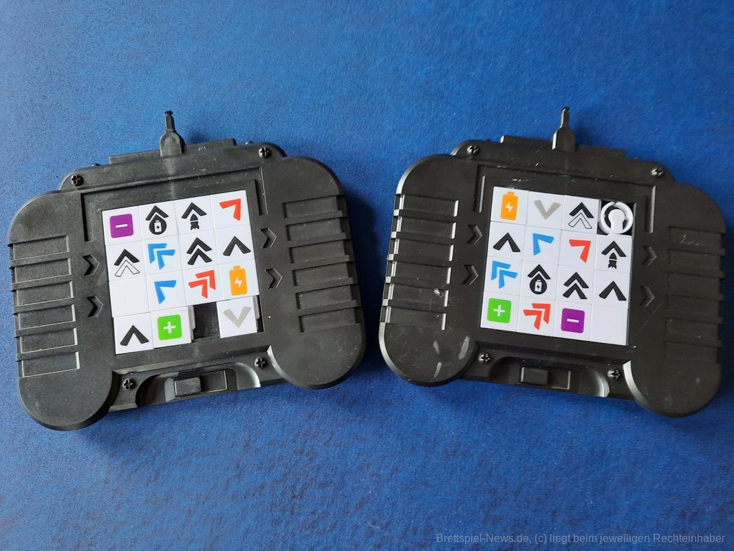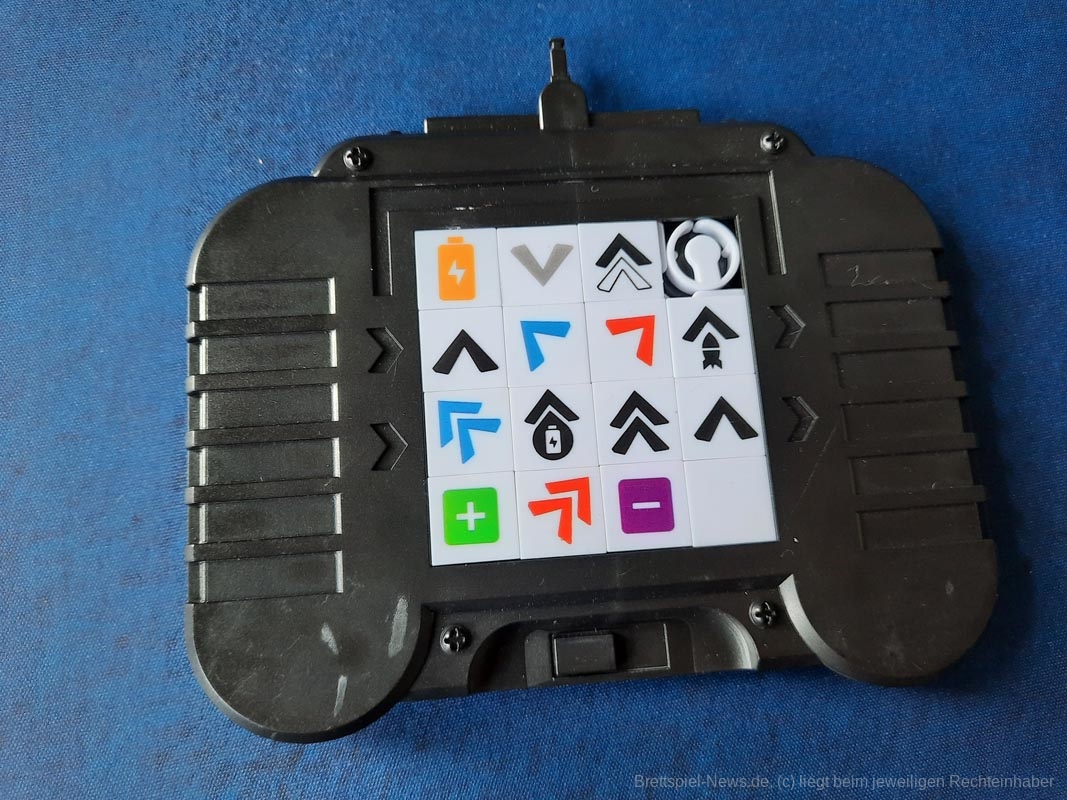 Sobald alle bereit sind werden die Fernbedienungen umgedreht und die Laufbahn des eigenen Autos programmiert. Auf der Fernbedienung befindet sich ein 4x4-Raster mit Symbolen, wobei eine Stelle leer ist. Diese Symbole können hin- und hergeschoben werden. Am Ende des Programmierens werden nur die beiden mittleren Reihen abgehandelt. Die obere und untere Reihe verfallen ganz einfach. Die Symbole geben etwa an, dass der eigene Wagen ein oder zwei Felder nach vorne fährt oder diagonal in die eine oder andere Richtung. Es kann eine Rakete geradeaus geschossen werden, um die Batterie-Marker der anderen auf die leere Seite zu drehen oder es wird eine eigene wieder aufgeladen. Wer mit Programmieren fertig ist, schnappt sich schnell den obersten Smiley von einem der Stapel. Dieser zeigt hinten eine Eins und sichert den ersten Platz in der Zugreihenfolge. Nach der vorletzten Person hat die verbliebene noch zehn Sekunden Zeit, bis die Programmierphase endet und der letzte Smiley genommen wird, der auch noch eine Batterie verbraucht. Die Strafe dafür, so lange gebraucht zu haben.