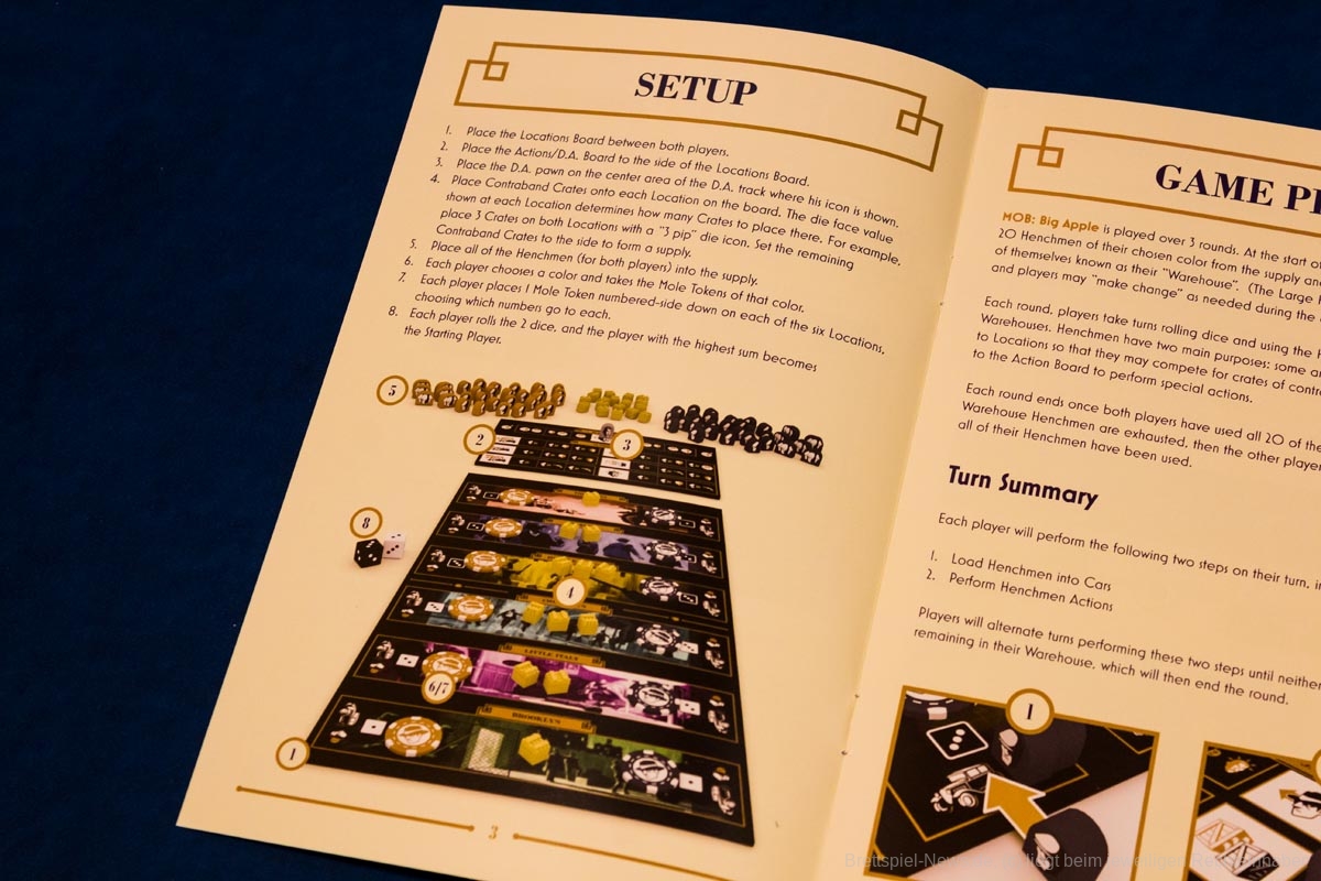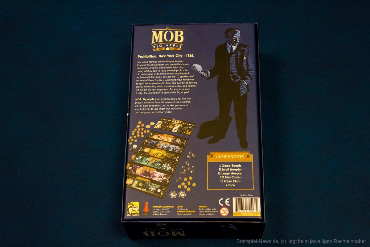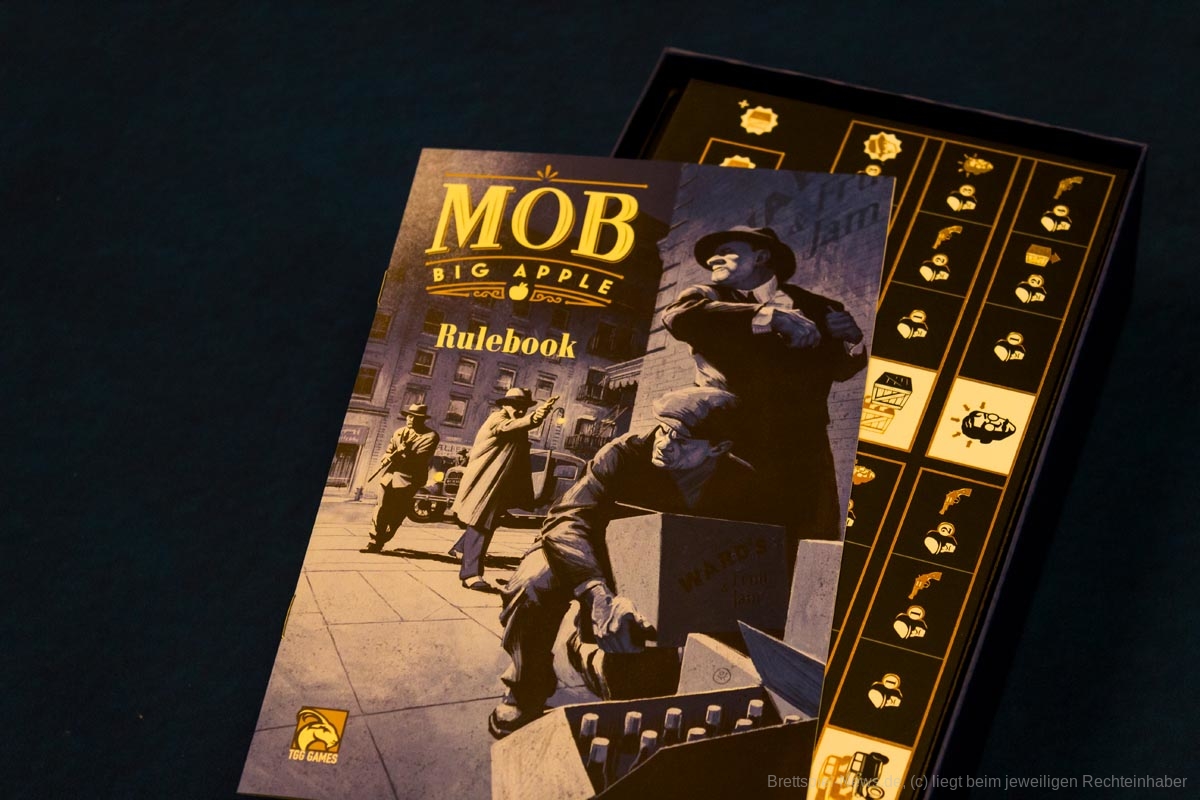 „Mob – Big Apple“ vermittelt gekonnt das Mafia-Thema und erinnert durch die stilvolle Verpackung und das tolle Spielmaterial an vergangene Zeiten New Yorks. Mafia-Mitglieder rasen in Gangsterautos mit überhöhter Geschwindigkeit zu dunklen Orten, an denen sich üble Schurken Feuergefechte liefern.