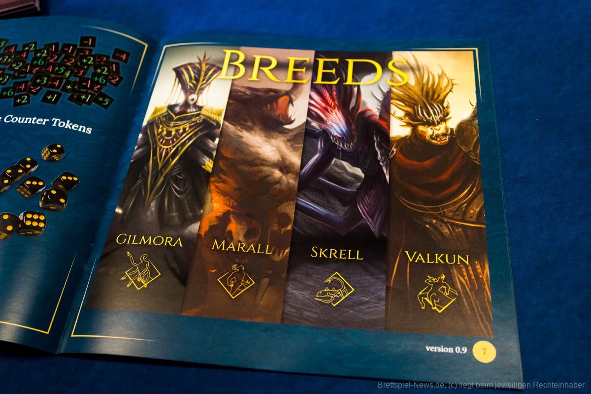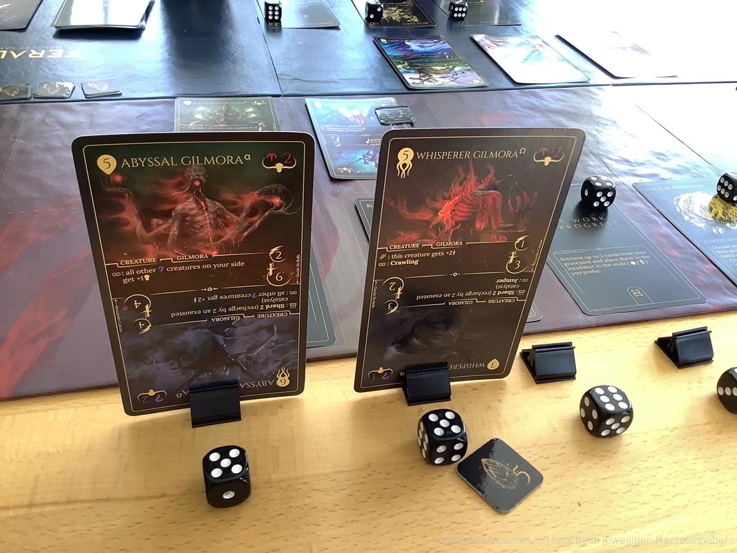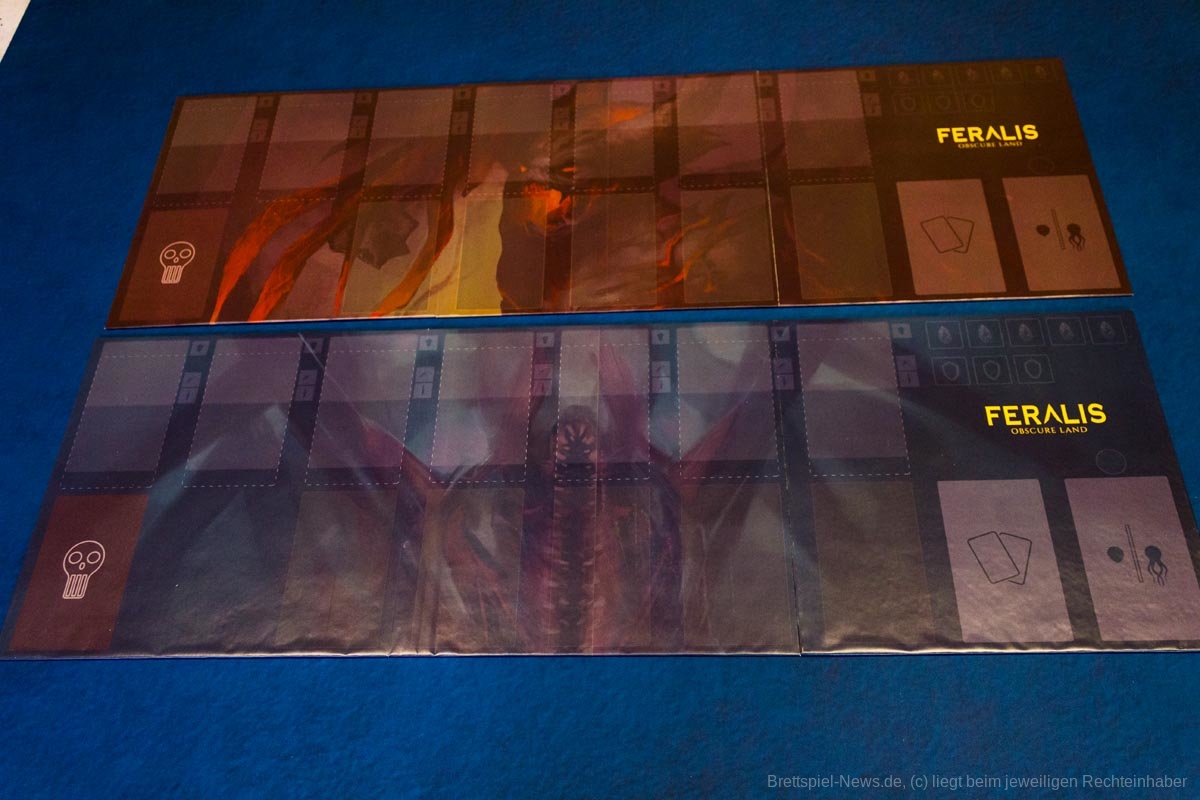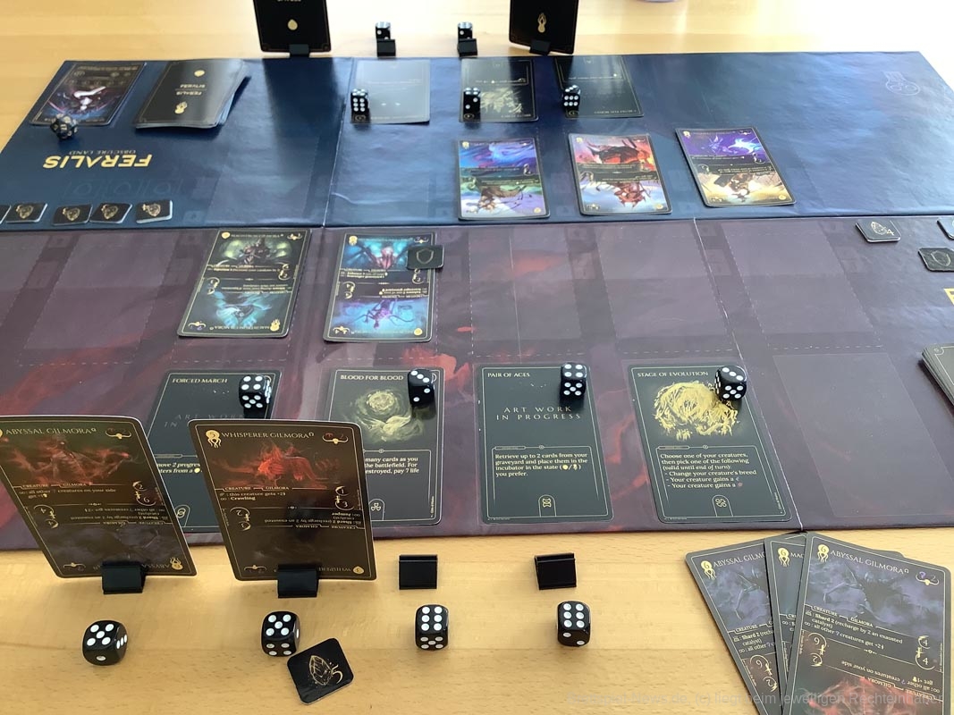Die Illustrationen des Prototyps "Feralis" sind beeindruckend episch, aber auch sehr düster. Karten, Spielbretter, Anleitung, Karton – alles präsentiert sich in schwarzen, dunkelrot- und blauen Tönen, was auf mich etwas bedrückend wirkt. Die Kartentexte sind sehr klein, aber farblich abgehoben. Trotzdem gibt es in dem relativ einfachen Spielprinzip viele Symbole und Icons, die man verinnerlichen oder im noch unvollständigen Glossar nachschlagen muss. Nach dem Lesen der verbesserten Regelversion wurden mir einige Begriffe und Funktionen der Token klarer. Allerdings ist die Geschichte zu dem dramatisch wirkenden Fantasythema immer noch sehr dünn. Auf die Frage, warum das ganze Battle eigentlich stattfindet, warum die Aesyr gegeneinander kämpfen und ihre Schergenmonster in den Kampf schicken, antwortet der Einleitungstext nur mit: ,,Das ist nicht klar“ oder ,,daran kann sich keiner erinnern“. Da geht doch einiges an potenziellem Charme verloren, den die Illustrationen und auch das Setting ausstrahlen.