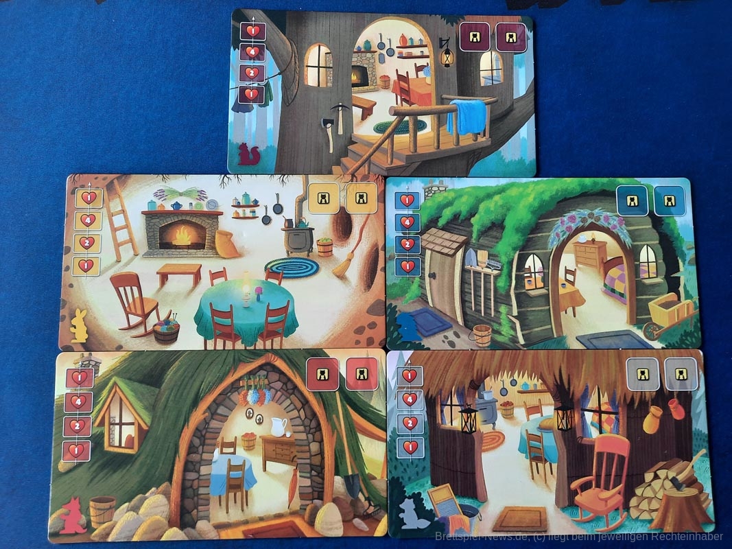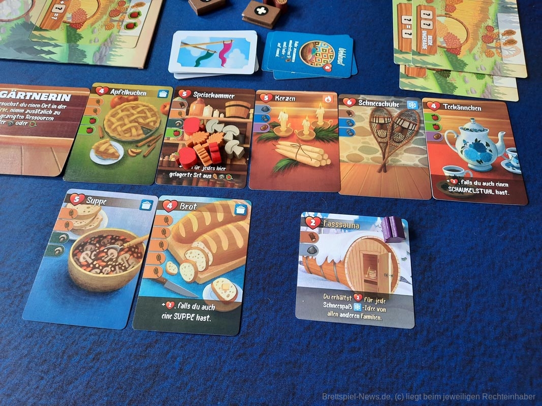 Der Spielplan zeigt das Ahorntal mit diversen Einsatzfeldern. Ganz oben liegt ein Stapel mit Wald- und Wiesen-Karten, die jeweils zwei Einsatzfelder zeigen. Oben auf dem Stapel liegen die Frühlings-Karten, darunter die Sommer- und Wintervarianten. Die oberste wird am Ende jeder Runde abgelegt und eine neue kommt zum Vorschein. So verläuft das Spiel durch drei Jahreszeiten.