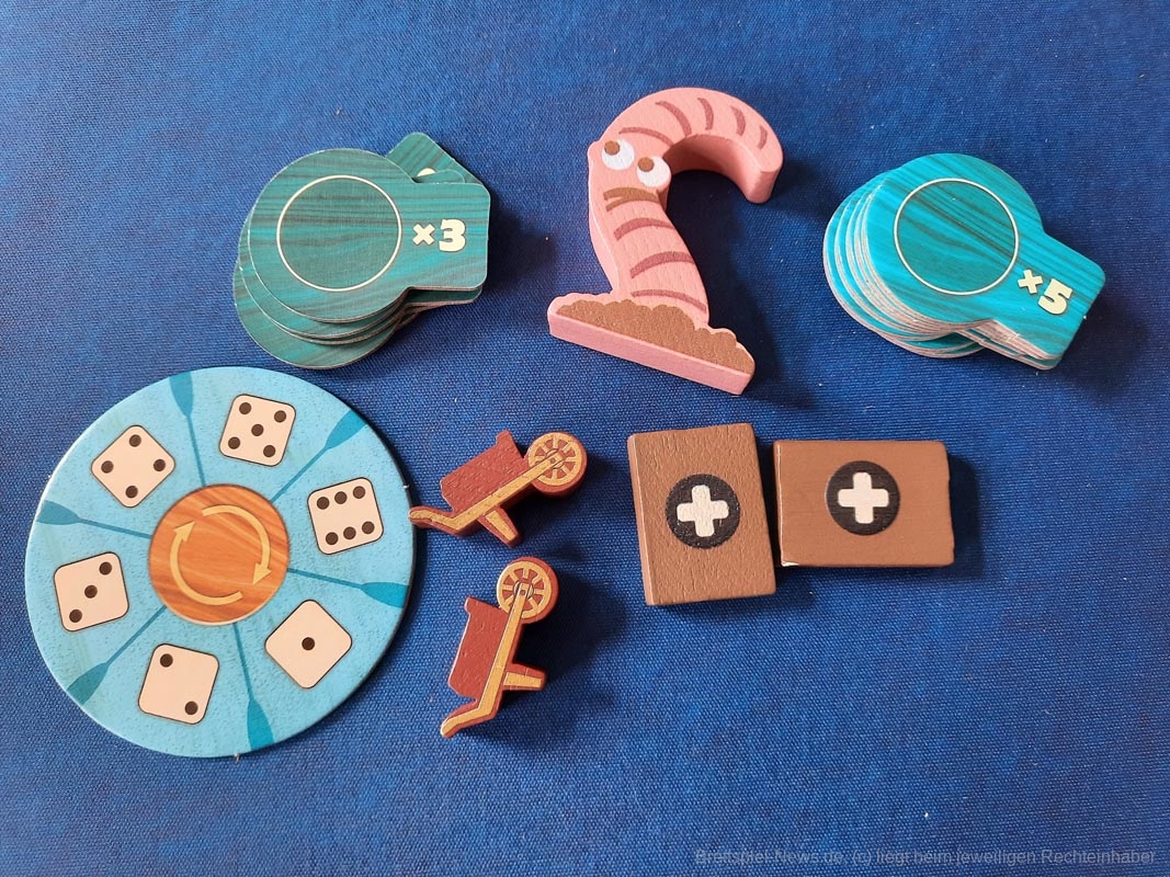Wenn ich am Zug bin, kenne ich lediglich das Ergebnis meiner beiden Familienwürfel. Mit dem Einsetzen meiner Tiere spekuliere ich auf bestimmte Ergebnisse der Dorfwürfel. Das macht das Einsetzen und Vorausplanen zu einer kniffligen Aufgabe. Wenn ich zwei Felder besetze, die jeweils drei Würfel fordern, habe ich bereits alle verfügbaren Würfel verplant und dann muss es auch noch klappen. Alles, was mir dabei helfen kann, sind Trostpflaster, mit denen ich ein Würfelergebnis manipulieren kann. Diese bekomme ich, wenn ich ein Tier vom Plan nehmen muss, weil es keine Würfel zugeordnet bekommen hat. Es kann einige Male im Spiel geschehen, dass ein Tier einfach leer ausgeht und das Feld ungenutzt verlassen muss. Verspekuliert!