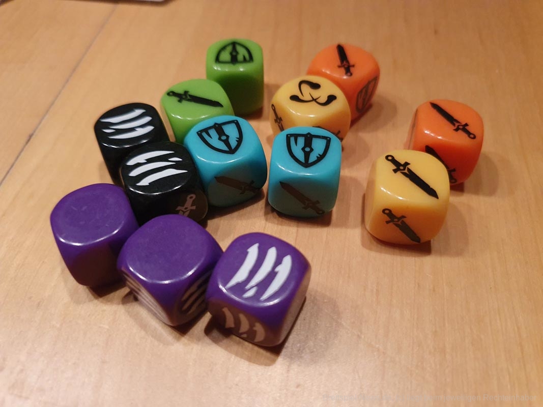 Nun werden die eigenen Würfelergebnisse und die des Monsters verglichen und die eigenen Schäden und die des Monsters werden verteilt. Wird das Monster besiegt, gibt es die Belohnung, die auf dem Monsterplättchen angegeben ist. Siegt das Monster, wird auf dem eigenen Tableau die entspreche Anzahl an Ausdauermarkern entfernt. Wenn der letzte Ausdauermarker entfernt werden muss, ist der Charakter besiegt und wird auf das Burgplättchen zurückgestellt und startet in der Folgerunde von dort. Er stirbt also nicht und die gesamte Ausdauer wird auf dem Burgplättchen regeneriert. Allerdings müssen alle Münzen und ein selbst gewählter Ausrüstungsgegenstand abgegeben werden.
