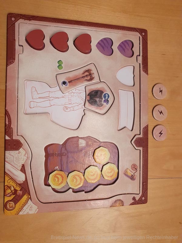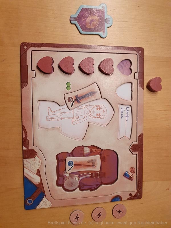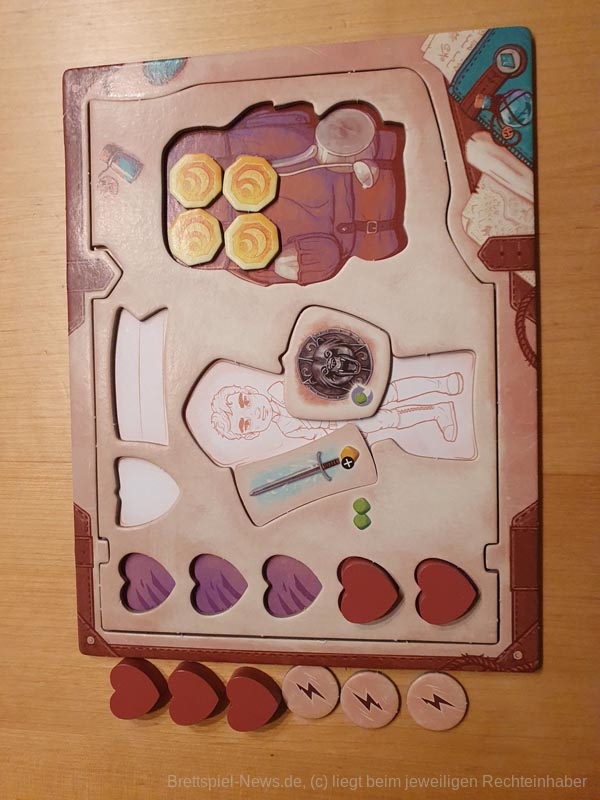 Aus dem Beutel ziehen dann alle reihum einen Ausrüstungsgegenstand. Dieser wird an die entsprechende Stelle auf dem Tableau gelegt. Ebenfalls erhalten alle jeweils eine Münze. Diese wird auf das Tableau in den Rucksack gelegt.