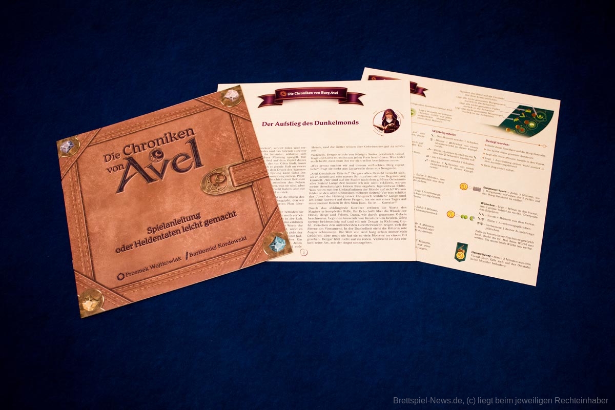 Das Spiel ist durch die Anleitung sehr gut erklärt. Neben der eigentlichen Anleitung gibt es zudem noch eine Kurzversion, die während des Spiels gut genutzt werden kann. Es liegt weiterhin ein eigenes Heft mit einer fiktiven Geschichte der Burg Avel bei, die vor allem beim Spiel mit Kindern dazu beitragen soll, das Spiel zu einem Abenteuer zu machen.