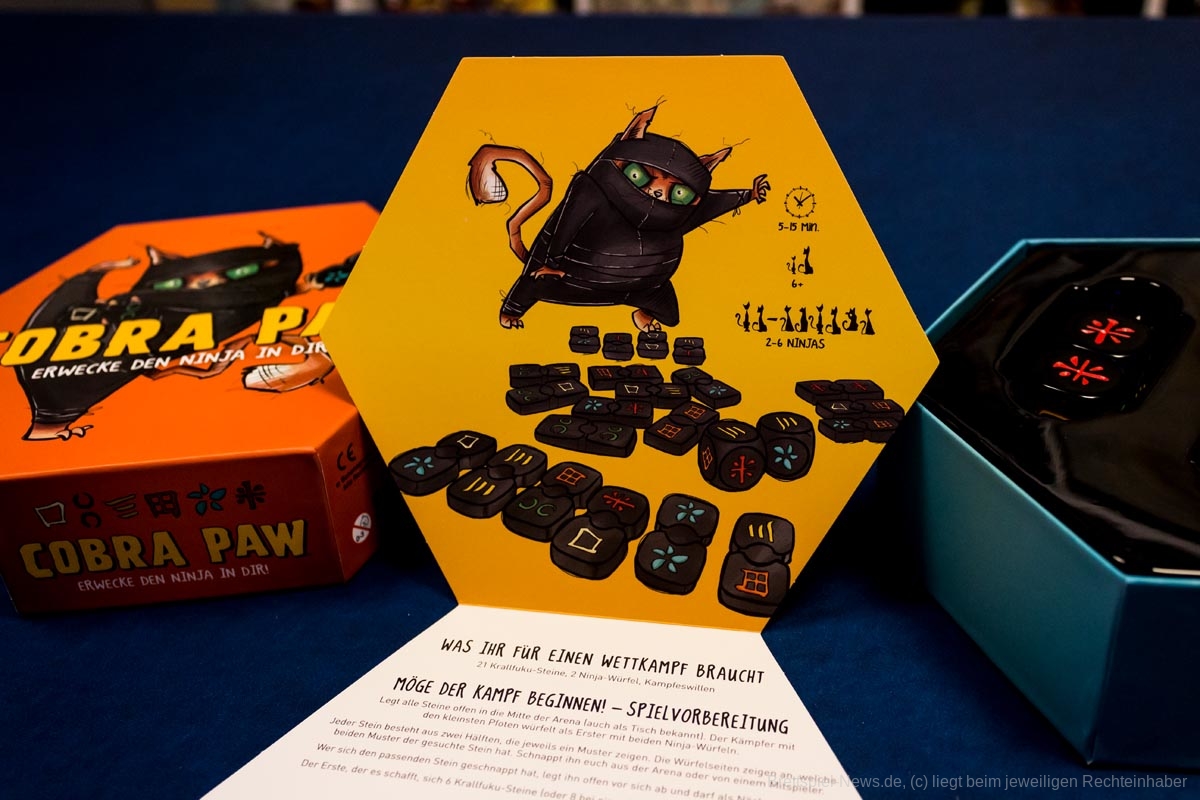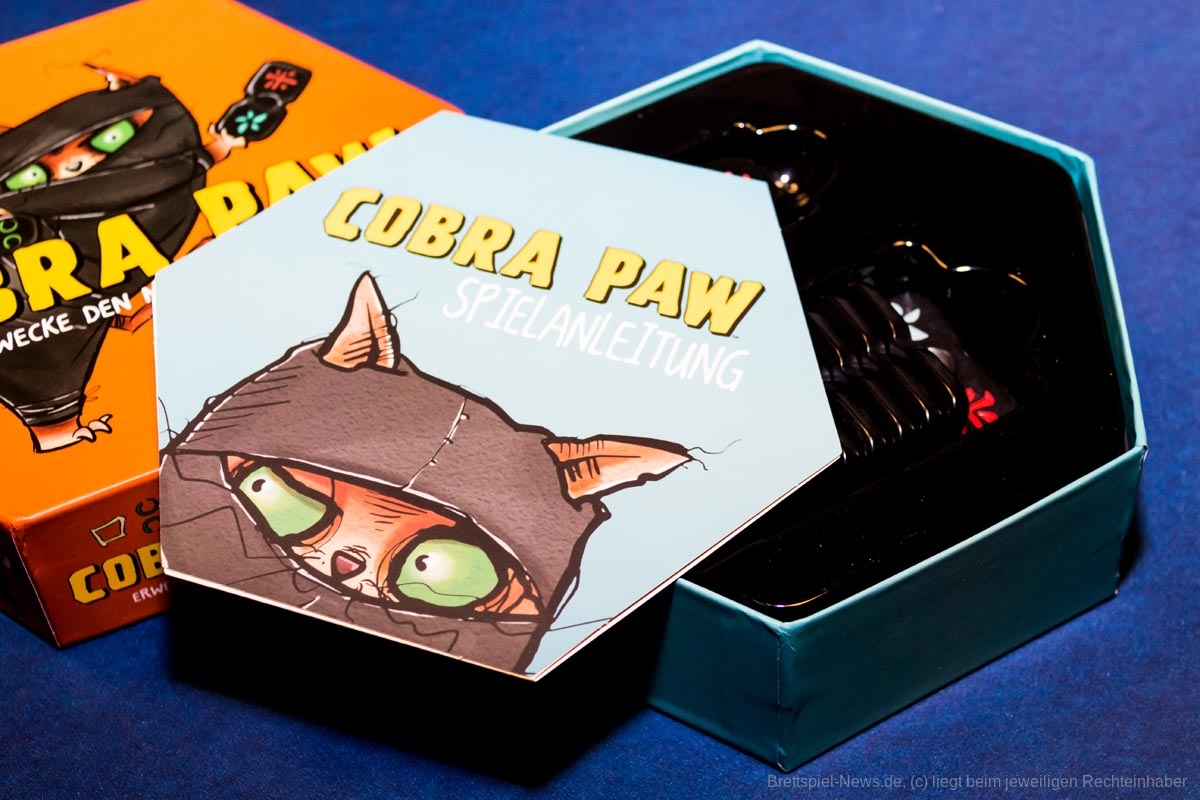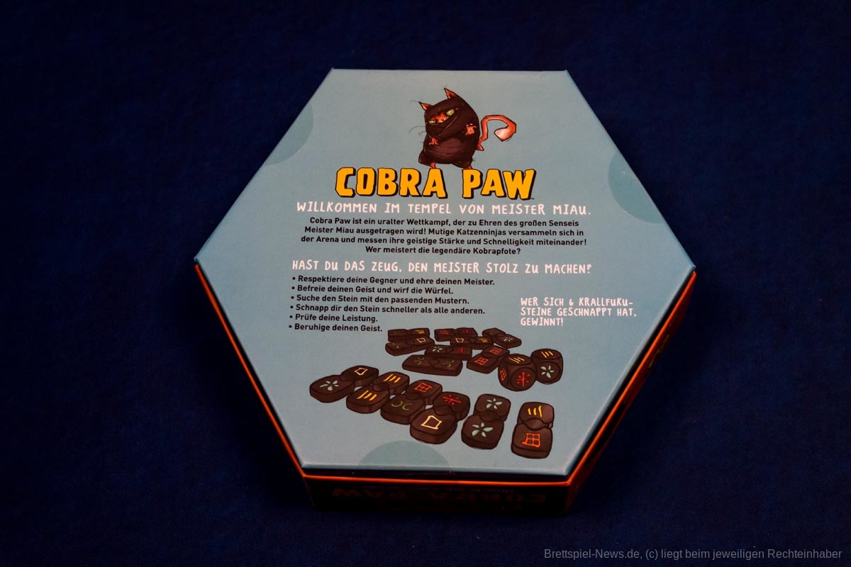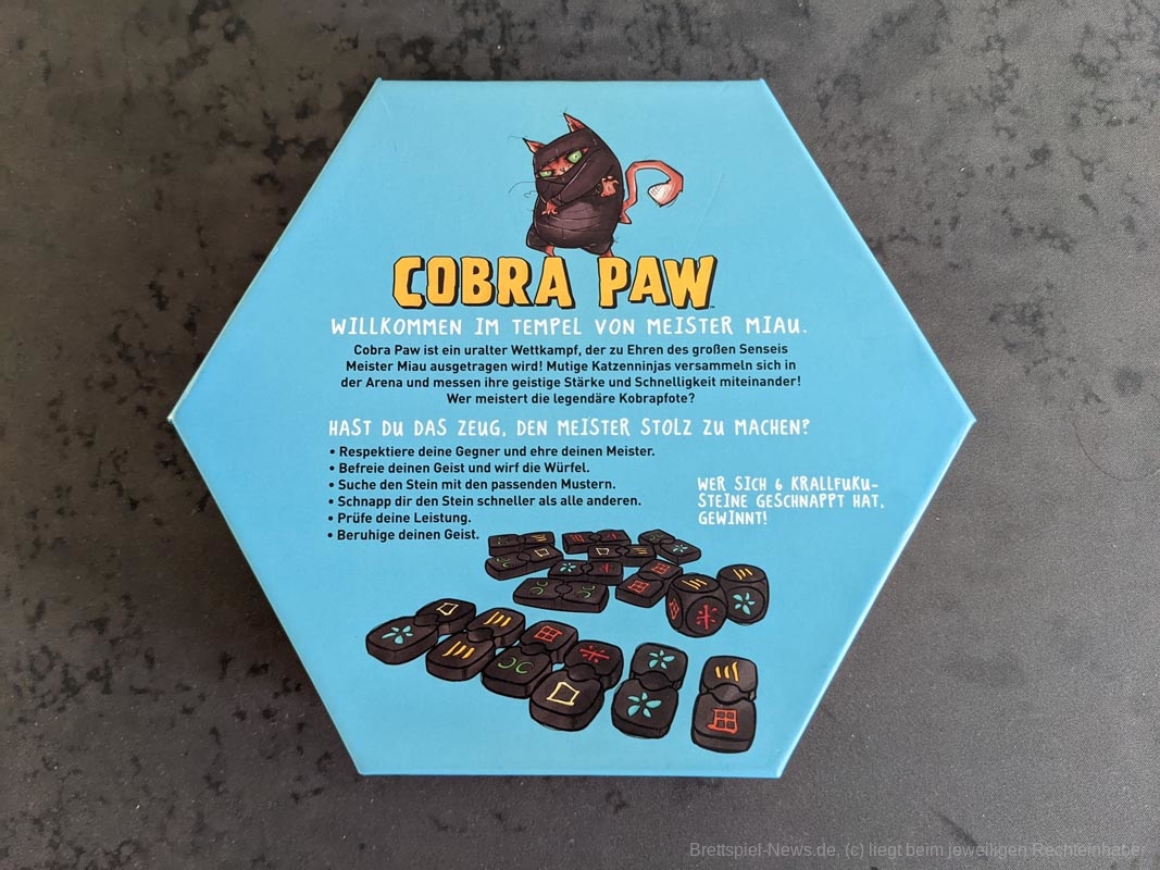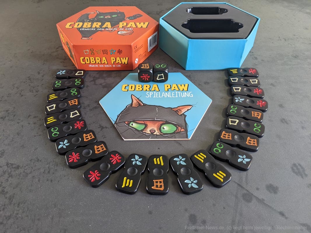 „Cobra Paw“ zählt zu für uns zu den Spielen, von denen man eigentlich gar nicht so viel erwartet, aber am Ende vollends begeistert ist. Die Anleitung ist übersichtlich, die Regeln sind innerhalb einer Minute erklärt und schon kann es losgehen. Die schweren Würfel liegen gut in der Hand, das Spiel hat eine tolle Haptik und das Material ist sehr hochwertig. So fällt es einem leicht, seine Energie zu konzentrieren und den Fokus blitzschnell auf den richtigen Stein zu richten.