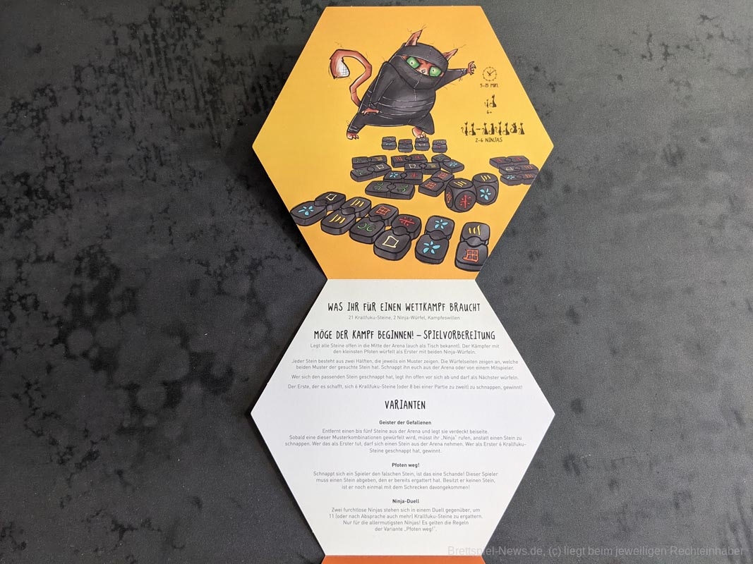 Etwas frustrierend kann es werden, wenn andere Ninjas am Tisch in ihrer Ausbildung weiter sind und die passendenden Steine viel schneller finden als man selbst. Uns hat dies jedoch eher angespornt und da eine Partie „Cobra Paw“ superschnell gespielt ist, blieb es bei uns selten bei nur einer Partie. Einziger Wehmutstropfen ist die Spielschachtel. Das wenige Spielmaterial hätte diese Größe nicht gebraucht. Außerdem bringt die Schachtelform unseren inneren Monk beim Blick ins Spielregal zum Verzweifeln. Glücklicherweise gibt es tolle Erfindungen wie Schubladen und Schränke, um dieses Problem zu lösen.