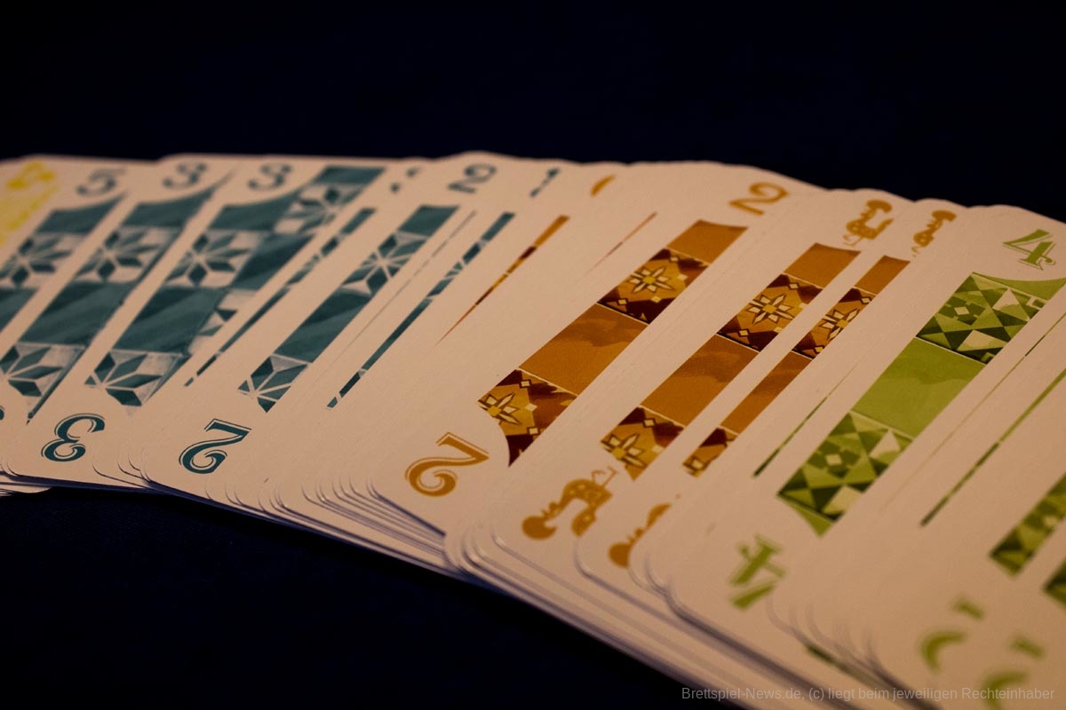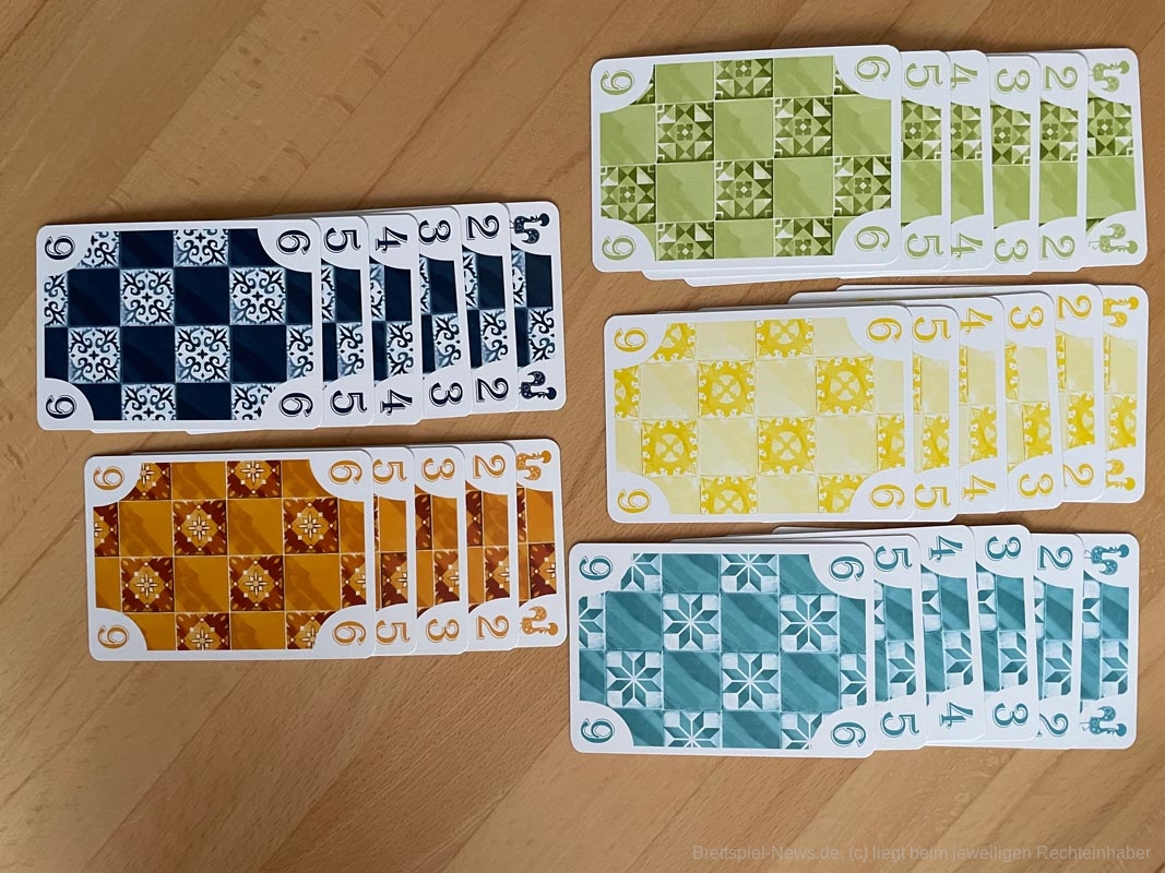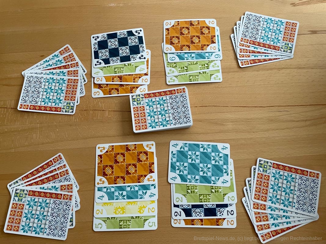"5211 Azul“ hat nur die Optik mit dem ersten Teil der Azul-Reihe gemein. Es ist ein schwacher Versuch mit der bekannt schönen Optik des millionenfach verkauften Spielehits, dem kleinen mittelmäßigen Kartenspiel "5211“ mehr Aufmerksamkeit in den Verkaufsregalen zu verleihen. Thematisch findet man darin nichts von "Azul“ wieder, auch wenn uns das die Beschreibung auf der ersten Seite der Anleitung glauben lassen will. Dass hier durch das Ausspielen von Karten gerade eine Wand gekachelt wird, erahnt niemand. Und die hochwertige, orientalische Fliesenoptik, die dem Azul-Spiel mitunter reißenden Umsatz gewährte, kommt auf großen, aber qualitativ nicht sehr berauschenden Karten meiner Meinung nach absolut nicht rüber. Die gelben Karten leiden zudem unter unbrauchbarem Handling, da die Zahlen sehr schlecht zu erkennen sind. Oben die Zahlen und in der Mitte abgekupferte und grafisch nicht gerade liebevoll aufgedruckte Fliesenmuster. Die expressionistisch anmutenden, wuseligen Muster und Farben im Originalspiel "5211“ haben da für mein Empfinden deutlich mehr Charme.