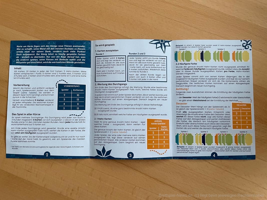 Das Spiel an sich ist nett und funktioniert, ist schnell erklärt und in ca. 10 Minuten gespielt. Es ist kein lustiges Absacker- oder Partiespiel, dafür ist es zu ruhig am Tisch. Für Wenigspielende, die das nicht stört, könnte das Ganze eine annehmbare Unterhaltungsmöglichkeit darstellen. Vielspielern fehlt hier definitiv die strategische Würze. Natürlich muss man sich auch an den Karten der anderen orientieren und vermuten, auf welche Wertung sie abzielen. Dann kann es auch mal clever sein, diese Farbe zu überreizen. Diese Suppe kann man allerdings nur versalzen, wenn man die entsprechende Farbe auch auf der Hand hat, was natürlich ein hoher Glücksfaktor beinhaltet. Zu zweit ist dieses gegnerische Abschätzen und Ausmanövrieren noch in feinen Zügen vorhanden, mit vier oder fünf Personen herrscht die Unberechenbarkeit im Königspalast. Spieleneulingen ist der Ablauf schnell erklärt, wobei auch diese (wie Vielspieler) immer wieder an den beiden wichtigen Wertungs-Zahlen hängen bleiben: Die Anzahl der Hahn-Karten, um deren Wertung auszulösen und der Desaster-Wert wird schnell vergessen. Diese spieleranzahlabhängigen Werte stellen sich für ein fluffiges Familienspiel als zu sperrig heraus und das ständige Nachfragen hemmt den Spielfluss. Immerhin kann man diese Zahlen in der Anleitung auf einen Blick nachschlagen, da sie orange unterlegt sind und einem damit sofort ins Auge springen. Insgesamt ist die Anleitung gelungen, nach einmaligem Lesen kann direkt losgelegt werden.