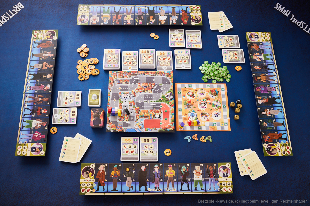 Neben den Gangmitgliedern ist der zweite zentrale Aspekt das „Stadttableau“, auf dem sich die Autos der Spielgruppe sowie ein Auto der Polizei befindet. In einem typischen Rennen fahren alle Wagen von einem Startpunkt auf ein Ziel hin, während sie auf der Strecke verschiedene Boni und im Ziel schlussendlich auch Siegpunkte einfahren können. Der fünfte noch nicht erklärte Würfel ist für die Bewegung des Polizeiautos verantwortlich. In jedem Zug kann sich das Polizeiauto somit um 0-2 Felder fortbewegen. Überschreitet der Polizeiwagen eines der Bonusfelder vor einer Gang, kann diese Gang diesen Bonus nicht mehr erhalten. Ist das Polizeiauto vor einer Gang im Ziel erhält diese Minuspunkte.