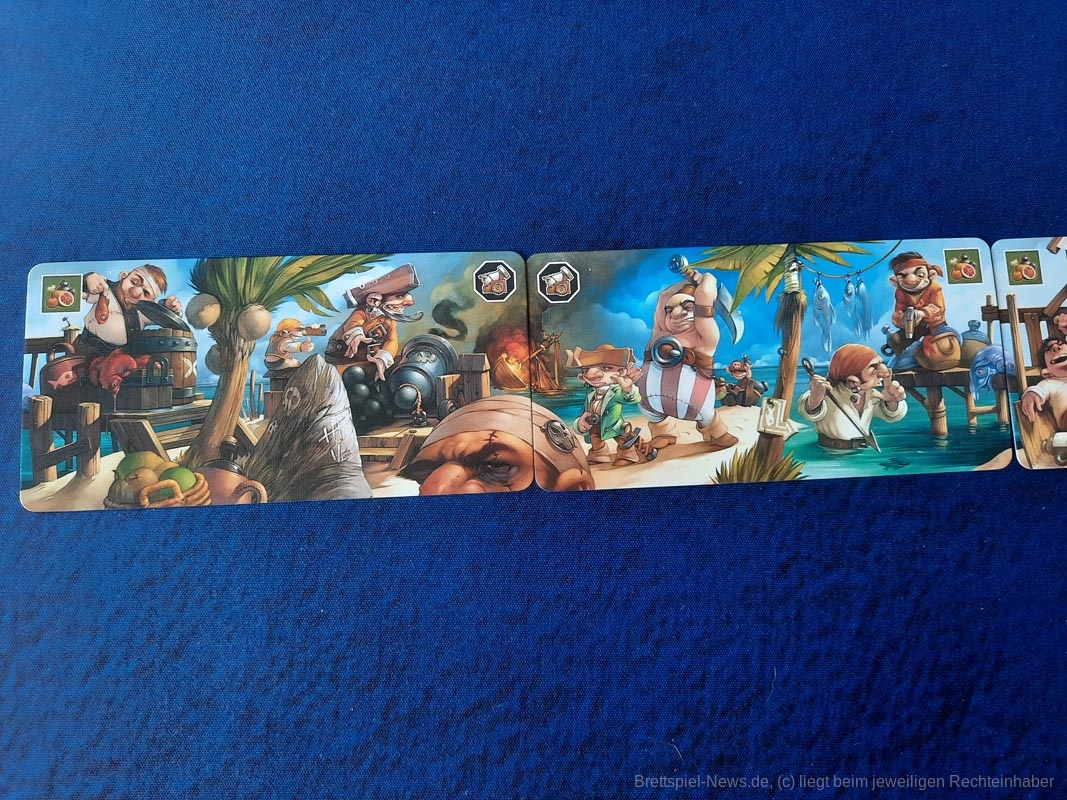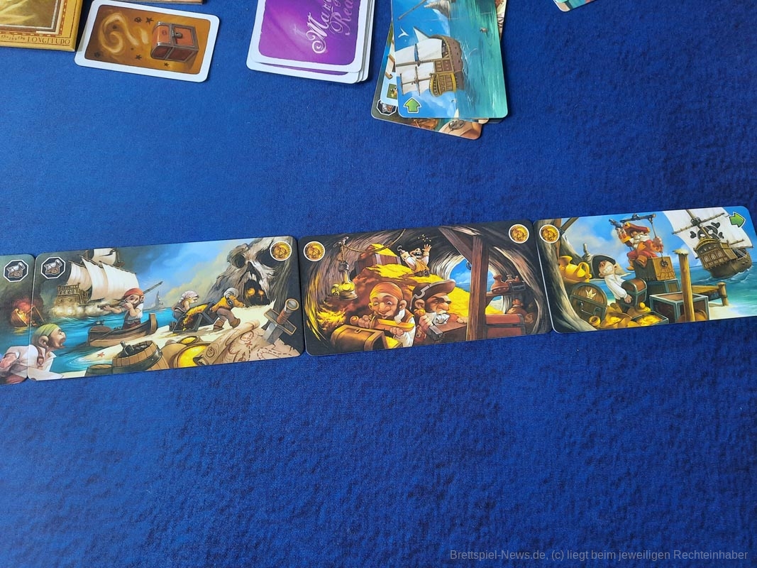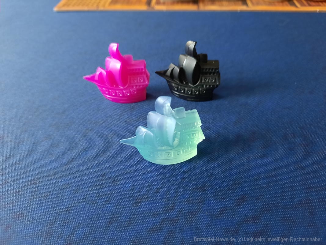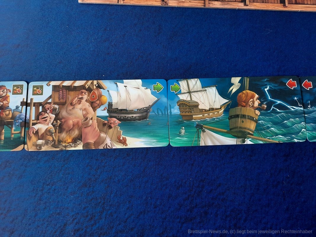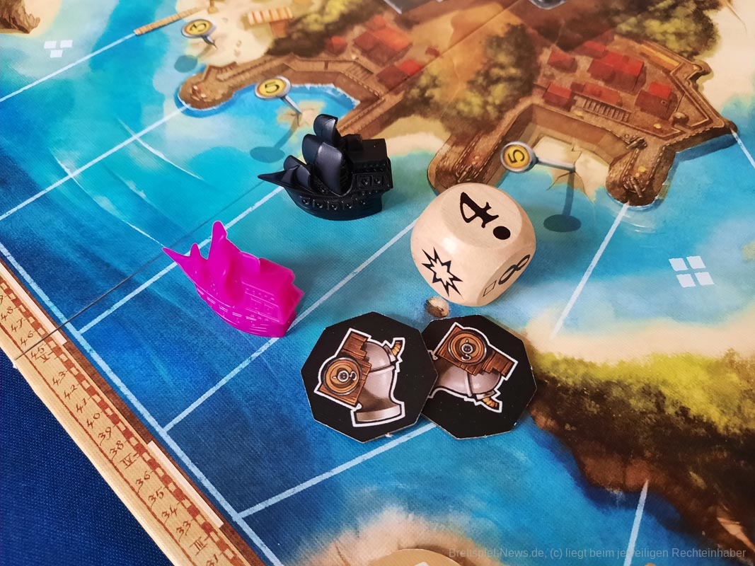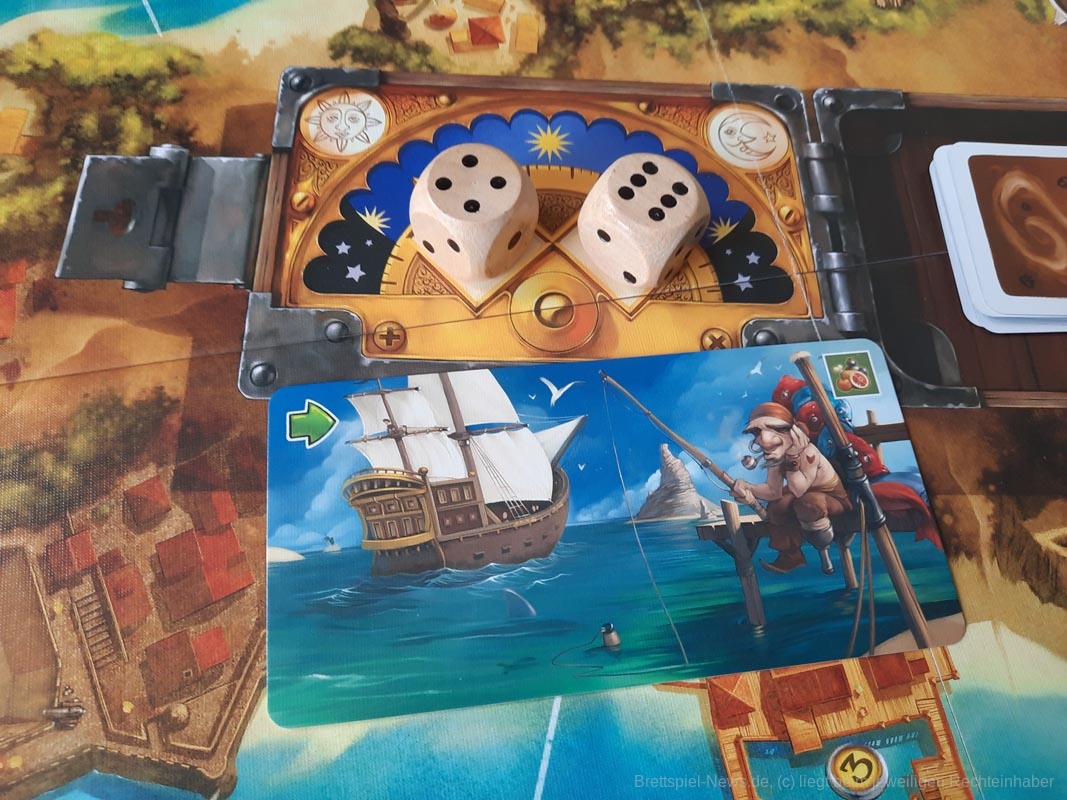 Ein Anteil des Spiels ist klassisches Ressourcen-Management. Da ich in Häfen bezahlen muss und auf dem Meer Proviant verbrauche, sollte ich zusehen, auch genug davon zu haben. Wenn eine Sechs gewürfelt wurde, kann ich die für Proviant nutzen und die anderen ziehen derweil an mir vorbei. Oder ich schippere auch voran, kann aber später vielleicht schwieriger Meer-Felder nutzen, weil es mir an Proviant mangelt. Oder aber …