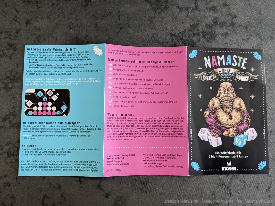 Die Regeln sind schnell erklärt und die Anleitung lässt keine Fragen offen, auch wenn wir uns hier eine thematischere Einleitung gewünscht hätten, da das Thema ansonsten insgesamt sehr aufgesetzt wirkt. Lediglich auf der letzten Seite erhalten wir Informationen über die Bedeutung der Symbole auf dem Spielblock und die sogenannten „Vier edlen Wahrheiten“ des Buddhismus. Diese Informationen sind für das Spielgeschehen jedoch eher irrelevant.