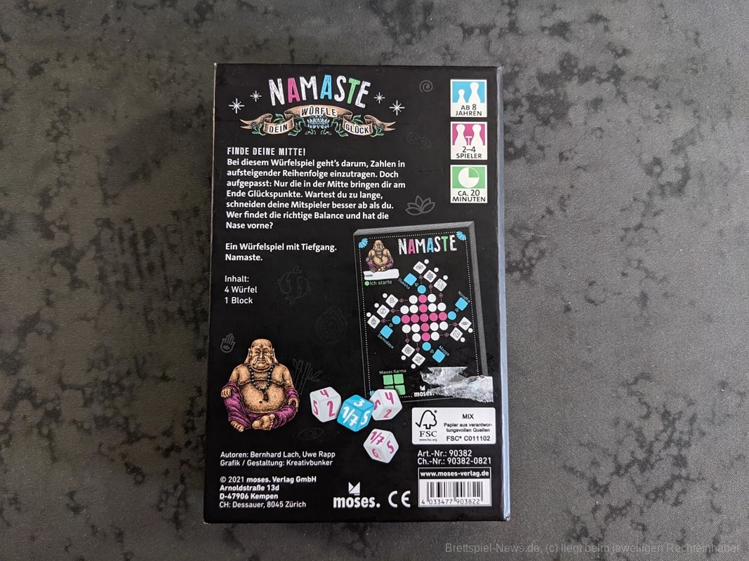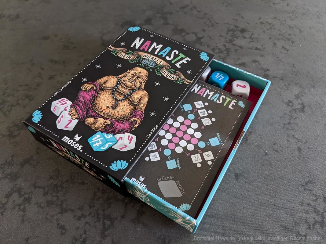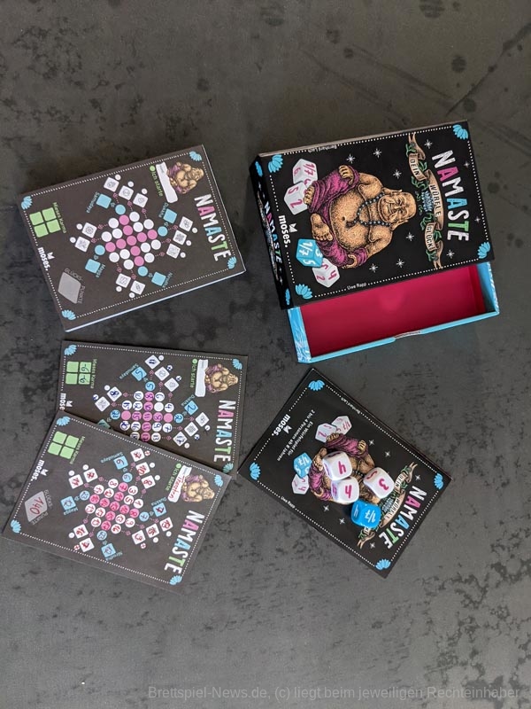 „Namaste“ zusammen und damit erstmal tief durchatmen. „Namaste – Würfel dein Glück“ empfängt uns mit einem Spielblock, vier schönen Würfeln und einem gewöhnungsbedürftigen Artwork - aber über Kunst lässt sich ja bekanntlich streiten. Das Spiel wird in einem tollen Schuber geliefert, der sich sehr gut dazu eignet, das Spiel mit auf Reisen zu nehmen. Der einzige aber nicht kleine Wehrmutstropfen ist der Spielblock. Leider ist hier die schwarze Farbe eher dunkelgrau und die Anordnung der Spalten, Zeilen und verschiedenen Symbole sind unnötig kompliziert und erschweren den Einstieg ins Spiel. Dieses Problem erledigt sich aber spätestens nach einer gespielten Runde.