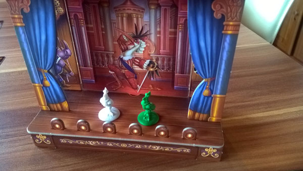 Als wir die Verpackung von Hoftheater geöffnet haben, waren wir erst einmal gespannt auf die aufstellbare Bühne. Diese wird in Form zweier gestanzter Formen aus Pappe geliefert. Wie schon zum Beispiel bei Colt Express, gibt es eine Anleitung und die einzelnen Formen können dann zusammen gebaut werden. Das Zusammenbauen ist nicht sonderlich schwer. Einen kleinen Tipp wollen wir aber geben: es sollten alle Lücken die gestanzt sind, vorab ausgedrückt werden. Ansonsten können Papp-Teile umknicken. Das ist uns passiert, ließ sich aber mit Hilfe eines Messers stabilisieren und dann doch noch in die vorgesehene Lücke schieben.