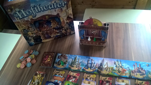In Hoftheater versuchen wir am Hofe des Königs das beste Theaterstück aufzuführen. Wir treten dabei gegen bis zu vier Mitspieler an. Es gibt acht Städte, in denen wir Begegnungen mit Gauklern, Schauspielern und reichen Gönnern haben. Wir fliegen mit Luftschiffen in die einzelnen Städte und können dort Personal rekrutieren, Almosen einsammeln oder den König beeinflussen. Sie merken - in Hoftheater gibt es eine fantasievolle Welt. Da überrascht es kaum, dass alle Schauspieler Tiere sind. Es gibt zwei Aufführungen, dann ist das Spiel auch schon wieder vorbei. Dabei ist es gar nicht so einfach einen guten Auftritt hin zu bekommen. Die Laune des Königs ist sehr Wankelmütig und kann jederzeit wechseln. Mal will er eine Tragödie, dann schon wieder eine Komödie sehen.