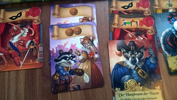 Was für Karten gibt es? Es gibt Schauspieler-Karten. Diese zählen vor sich abgelegt als Schauspieler für die große Aufführung. Wirft man sie ab, gehen Sie stattdessen zum Hof des Königs und beeinflussen dessen Lust auf Tragödie oder Komödie. Der entsprechende Zähler, oberhalb der Bühne, wird in die entsprechende Richtung gedreht. Wechselt die Laune und der König will statt Tragödie lieber Komödien sehen, wechselt der Bühnenhintergrund und alle dort stehende Impresarios fliegen von der Bühne. Die Schauspieler haben oft einen Effekt , der zuerst gewertet wird. Es können zum Beispiel andere Spieler bestohlen werden, alle Luftschiffe zurück geholt werden, oder ein Impesario auf die Bühne gestellt werden. Diese geben dann sofort so viele Ecu, wie Impesarios auf der Bühne stehen.