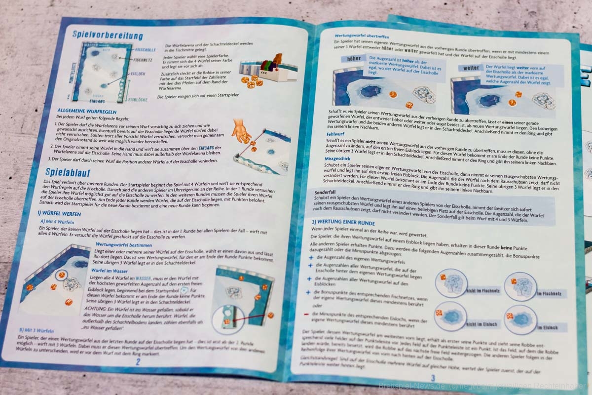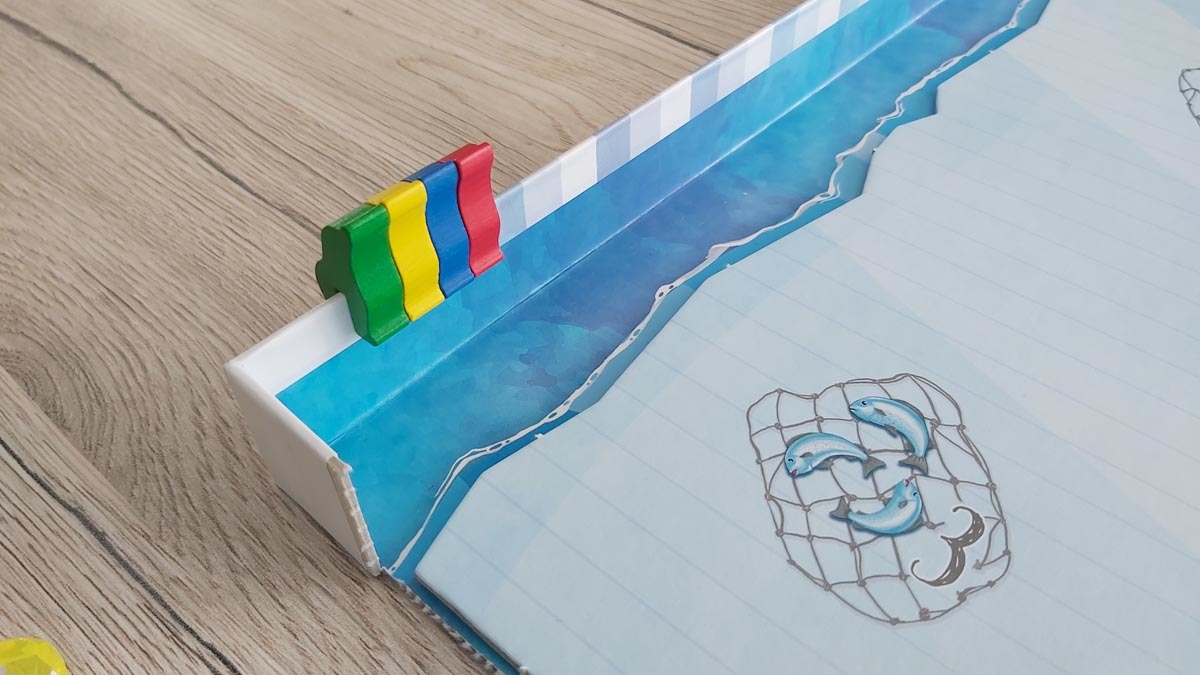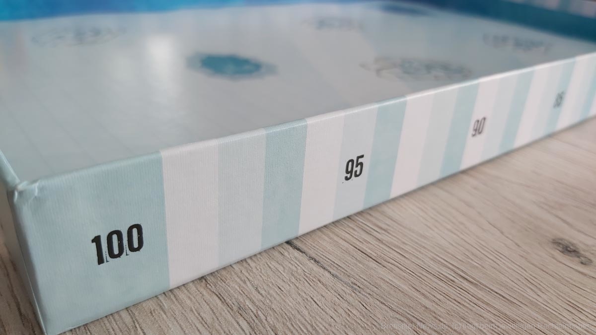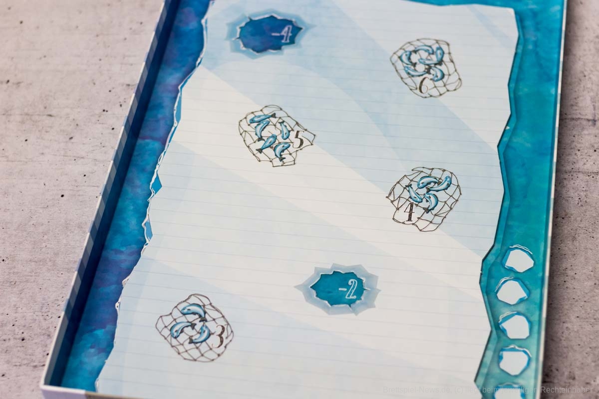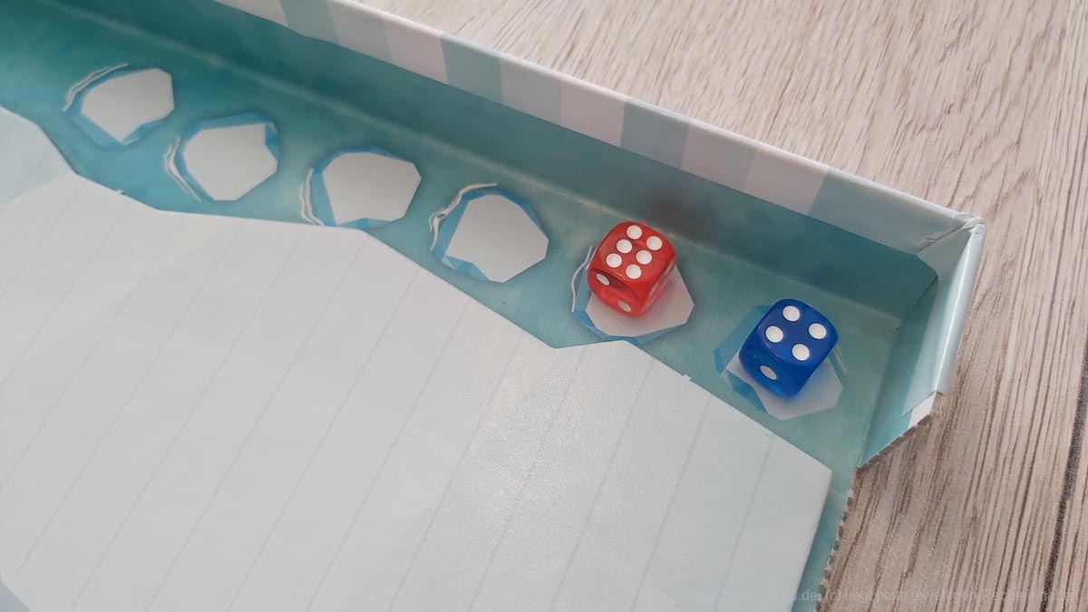 Die Punkteleiste auf dem Rand der Spielschachtel anzubringen ist eine clevere Idee. Leider haben sich hier aus meiner Sicht jedoch auch zwei Kritikpunkte versteckt. Zum einen hätte ich mir einen Punkteaufdruck auch im Inneren der Schachtel gewünscht, damit das Verschieben der Robben auch zügig funktioniert, ohne um den Tisch herum laufen zu müssen. Nicht selten kam es dabei zu kleinen Wacklern an der Spielschachtel, welche den zweiten Aspekt hervortreten ließen: das sehr leichte Verrutschen der Robben auf der Punkteleiste. Lediglich in den Ecken der Spielschachtel, an denen sich vermutlich mehr Papierschichten befinden, halten die Punktezähler sicher ihren Platz.