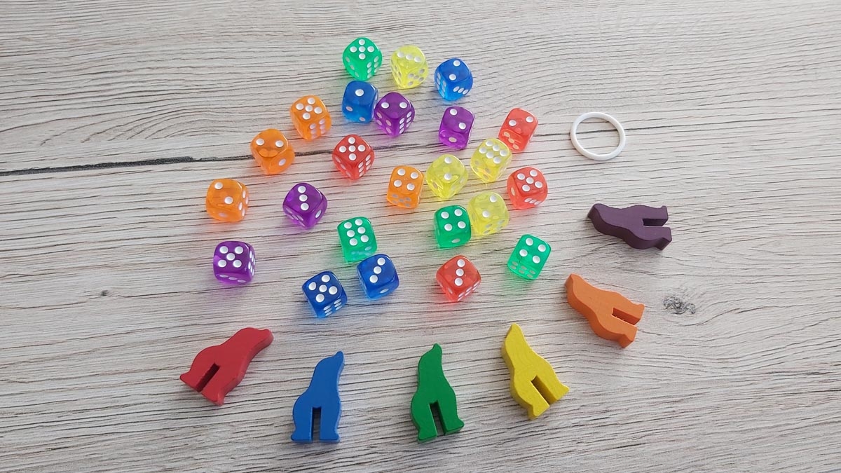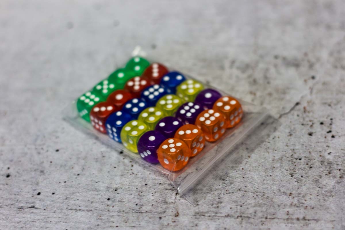 Ungünstig gewählt empfand ich die farblich sehr ähnlichen Würfel in orange und rot. Diese können aus meiner Sicht bei normaler Zimmerbeleuchtung leicht verwechselt werden. Da nicht immer in voller Besetzung gespielt wird, tritt dieses Problem jedoch vermutlich nicht allzu häufig in Erscheinung.