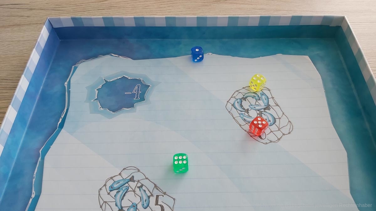 Danach folgen die anderen Kinder im Uhrzeigersinn. Genau hier kommt die Unsicherheit hinzu. In diesem Spiel gibt es sehr viel Bewegung um den Spieltisch, da jedes Kind einen unterschiedlichen Winkel zum Einwürfeln bevorzugt. Will man kein andauerndes Verrücken der Würfel auf der Eisscholle riskieren, bleibt diese liegen und die Kinder wechseln den Platz. Dadurch ist es ohne weitere Marker oder Hilfsmittel schwer möglich, die Reihenfolge im Blick zu behalten.