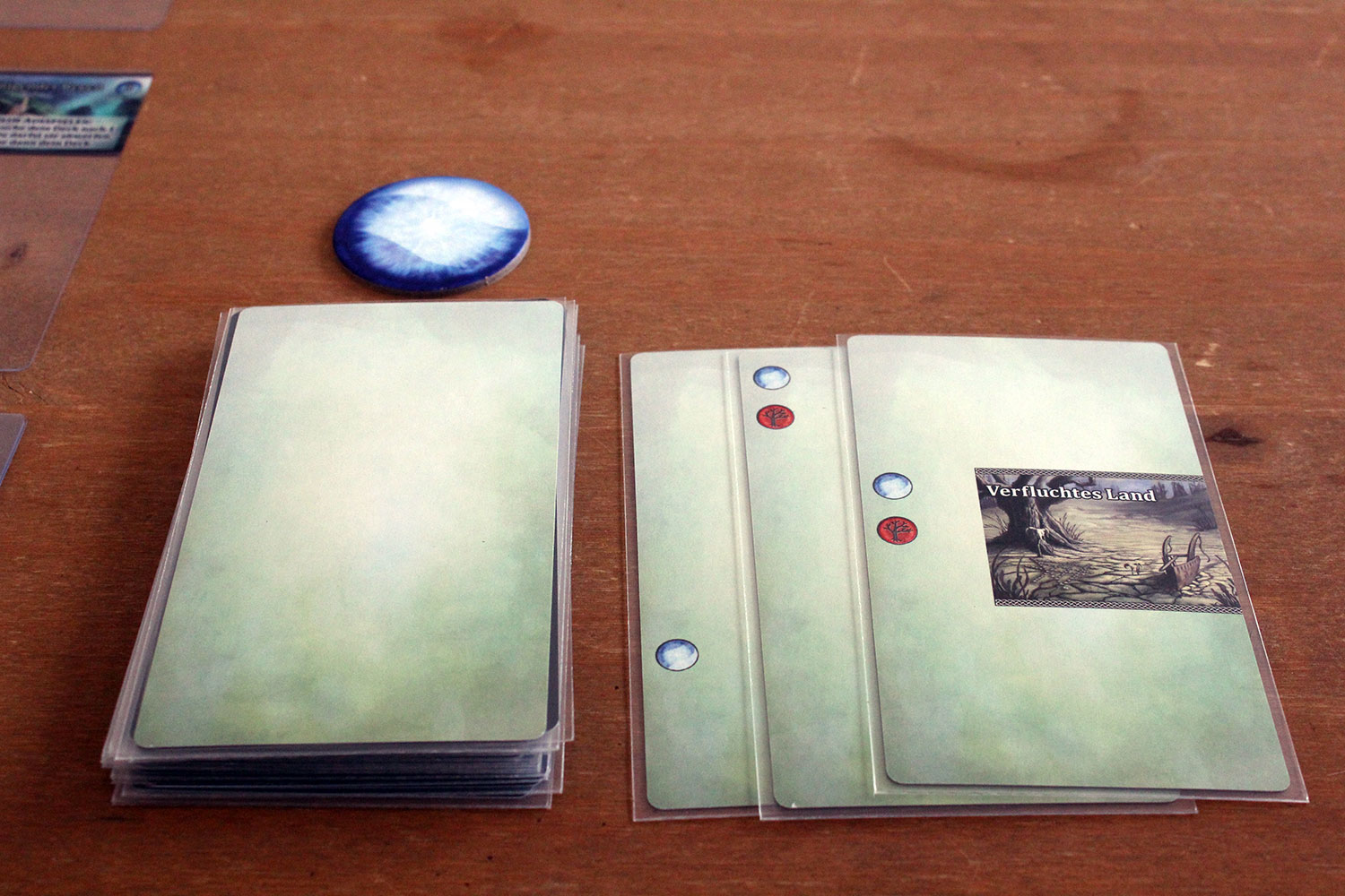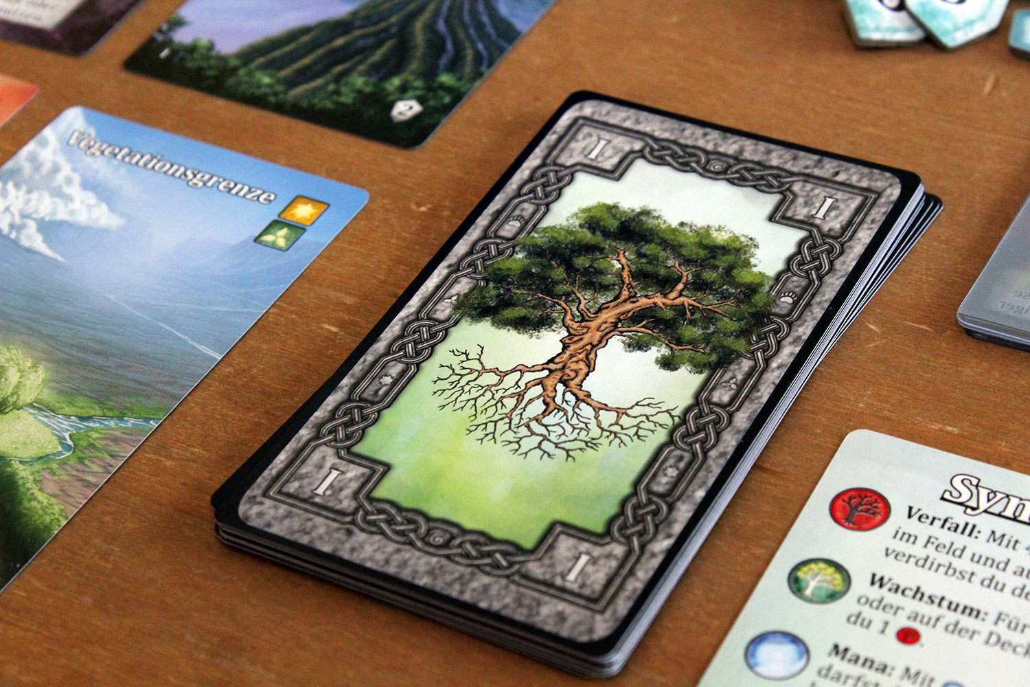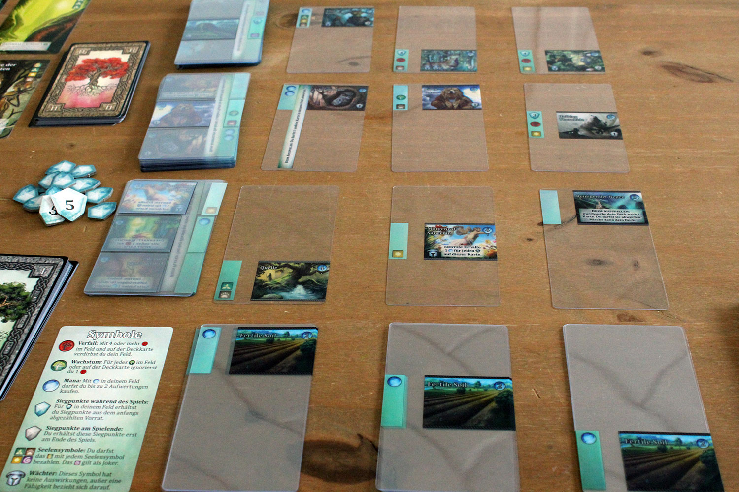 Die zwei bis vier Spieler nehmen sich ein Deck mit 20 Karten, mischern es und legen es verdeckt vor sich ab. Die oberste Karte wird umgedreht und ist die Deckkarte. Nun müssen die Aufwertungen “fruchtbarer Boden in drei Stapeln aufgedeckt bereit gelegt werden. Von den Level 1 Karten wird eine, von der Spieleranzahl abhängige Anzahl genommen, und verdeckt bereit gelegt. Die ersten drei werden dann gezogen und bilden die offene Auslage. Das geschieht dann auch mit den Level 2 und 3 Karten. Am Ende liegen 9 Karten in der Auslage. Die Unterstützungskarten werden nun noch nach Level ein und zwei sortiert, gemischt und vier davon werden jeweils offen neben den NAchziehstapeln ausgelegt. Danach werden von der Spielerzahl abhängig 23-33 Siegpunkte bereit gelegt. Nun bekommt jeder Spieler ein Manaplättchen und der Startspieler wird bestimmt.