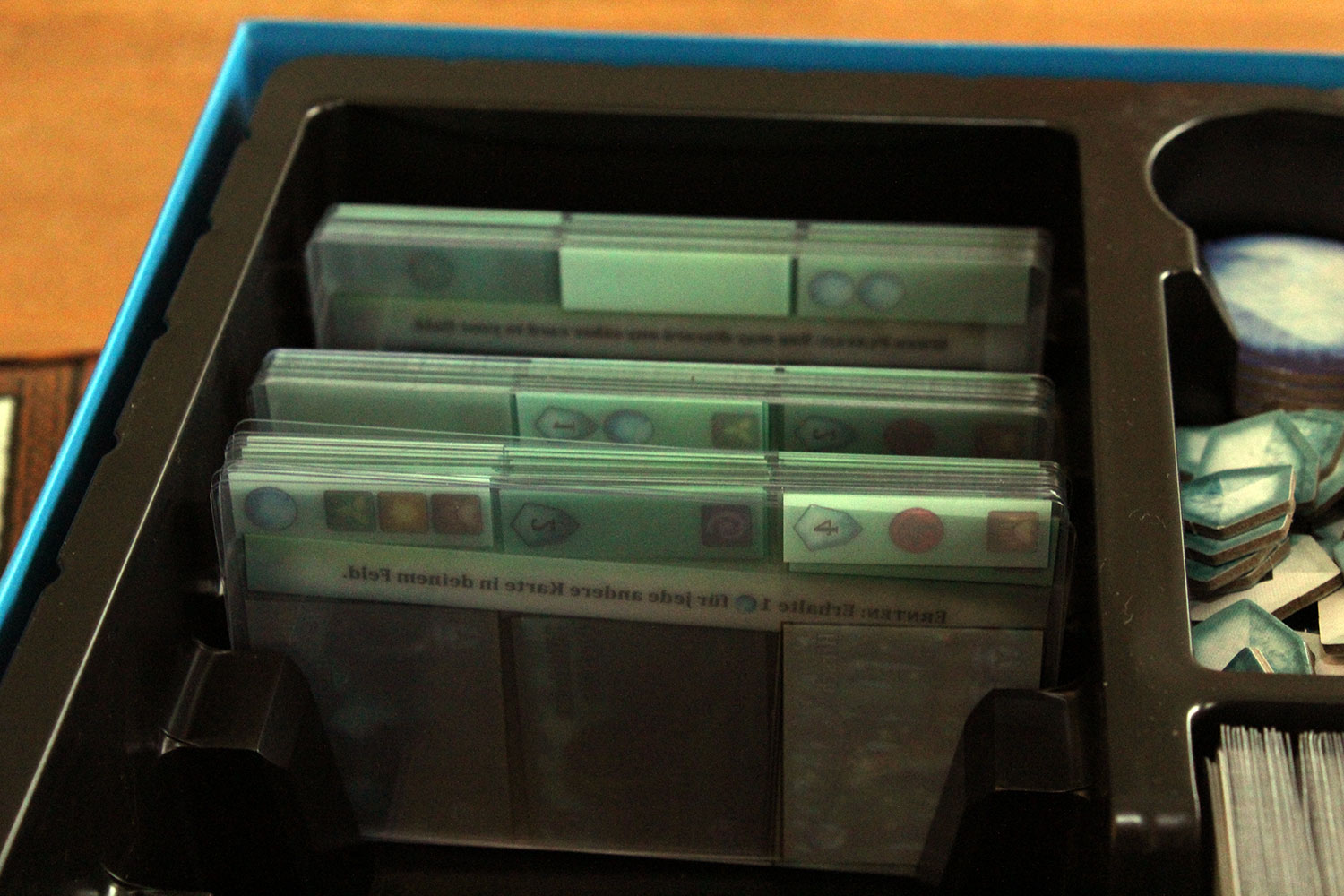 Das ist viel Licht für ein Spiel und natürlich gibt es da auch Schatten. Die Vorbereitung des Spiels ist für das erste Spiel recht zeitaufwendig. Der Qualität geschuldet hat jede(!) transparente Karte eine Schutzfolie. Diese kann entweder sofort entfernt oder erst bei Verschleiß abgezogen werden. Das ist aus Sicht der Qualitätssicherung löblich, bedeutet aber etwas mehr Aufwand als bei anderen Spielen.