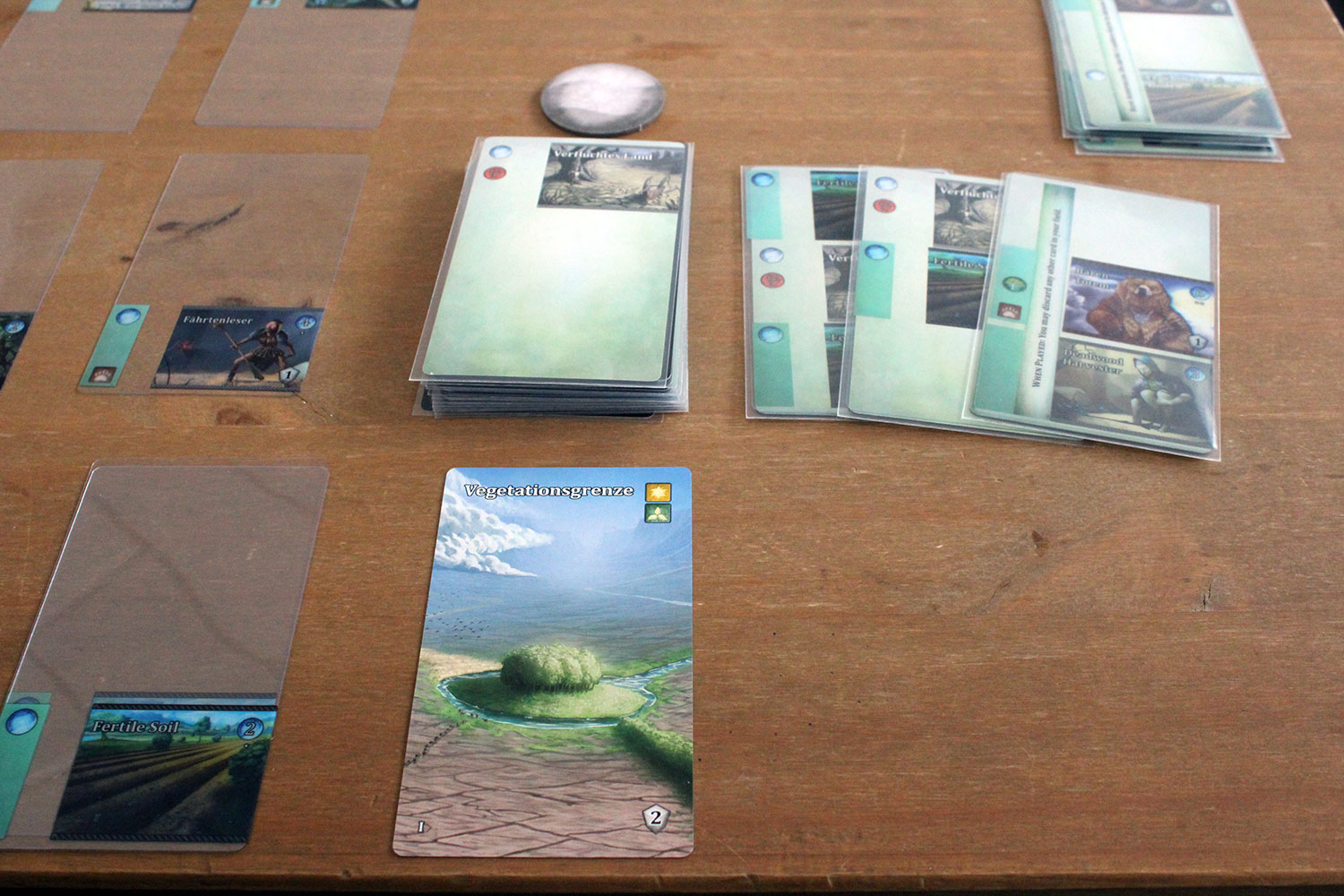 Es wird die Deckkarte genommen und neben das Deck gelegt. Nun wird die oberste Karte des Decks umgedreht und ist seinerseits die neue Deckkarte. Der Spieler darf so lange neue Karten in sein Feld legen, bis drei oder mehr rote Verfallsymbole offen liegen. Es zählt dabei das Feld, also alle ausgelegten Karten und die Deckkarte. Wer seinem Deck grüne Wachstumssymbole zufügt kann durch diese jeweils ein rotes Symbol ausgleichen, unter der Voraussetzung, dass diese ebenfalls offen ausliegen.
