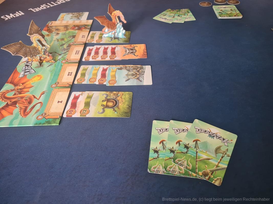 Im Kern funktioniert das auch. „Drakatak“ lässt sich gut spielen und es bestehen kaum Einstiegshürden, sobald die etwas hakeligen Regeln des Regelbuches einmal durchgearbeitet sind. Das zentrale Spielfeld macht einen sehr aufgeräumten Eindruck und wirkt auch in seinem Material nicht überladen, was das Spiel durchaus zugänglich macht. Bei unseren Spielrunden litt das Spiel aber an dem, was es eigentlich einzigartig machen sollte. Durch das kompetitive Spielsystem wurden wir aufgefordert, unserer Spielgruppe Steine in den Weg zu legen, indem wir sie mit den Drachen blockierten. Da es aber zu wenig alternative Wege gab, die anderen in ihrem Tun zu stören, fühlte sich dieser Part eher an wie ein reines Glücksspiel. Besonders deutlich wurde das, da der Drache nach einer bestimmten Zeit immer wieder zwischen zwei Reihen hin- und hergeschoben worden ist. Auch die drei Handkarten bieten sehr wenig Handlungsspielraum. Das wird besonders beim Ablegen von Kartenreihen verdeutlicht. Schafft es eine Person eine Kartenreihe mit der sechsten Karte zu vervollständigen ist es reines Glück, wie viele weitere Karten in diesem Zug ausgespielt werden können.