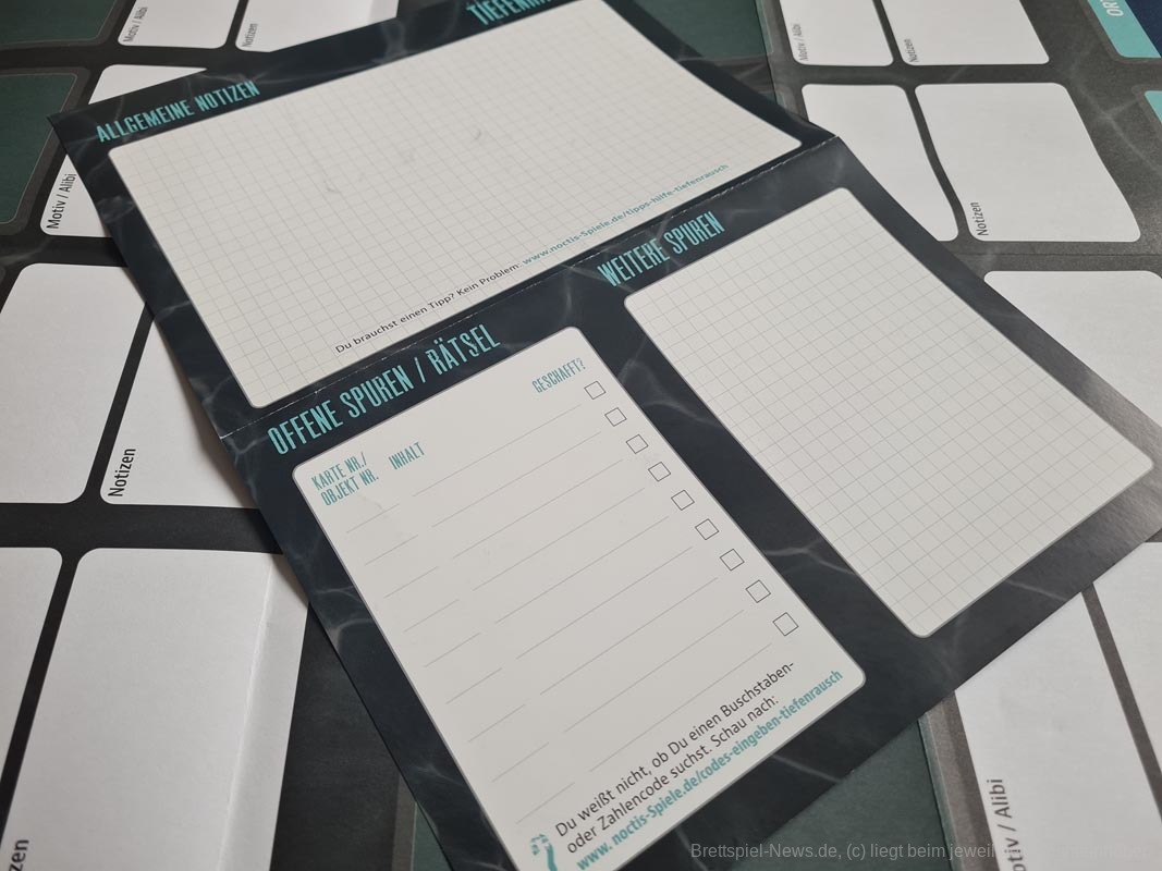 Eines der Probleme von „Tiefenrausch“ ist aber die Spielzeit. Möchte man alle Hinweise genau untersuchen, was eigentlich immer notwendig ist, dauert das Spiel zwischen 3.5 und 4 Stunden. Ja, das Spiel kann gespeichert werden, jedoch muss sich die Spielgruppe bei der nächsten Sitzung wieder an die ganzen kleinen Details erinnern, wenn nicht alles so genau wie möglich aufgeschrieben wurde. Auch bietet sich „Tiefenrausch“ eher nicht als Solo-Spiel an. Die Menge an Materialien und Hinweisen allein zu managen ist eine sehr große Aufgabe, die schnell darin resultiert, dass wichtige Hinweise oder Aufforderungen auf Karten übersehen werden. Werden diese Aufgaben auf unterschiedliche Personen verteilt läuft das Spiel um einiges flüssiger. Auch das Regelblatt schlägt vor bestimmte Aufgaben spezifischen Personen zuzuordnen. So können sich alle individuell an der Lösung beteiligen, ohne sich ausgeschlossen zu fühlen.