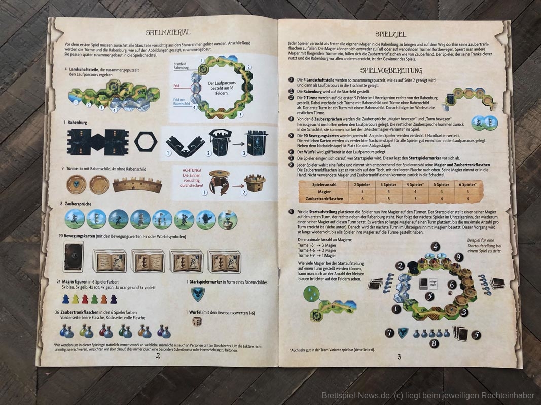 Alle erhalten am Spielbeginn auf die Anzahl der mitspielenden Personen abgestimmt Magierfiguren und Zaubertrankflaschen. Die Magierfiguren werden nun auf dem Spielertableau - ein Laufcours mit 16 Feldern - verteilt. Ebenfalls auf diesem Laufkurs stehen neun bewegliche Türme. Weiterhin erhält jede Person drei Handkarten. Gespielt wird abwechselnd, die aktive Person darf zwei Aktionen durchführen. Hierfür kann zweimal eine Handkarte abgeworfen und die entsprechende Bewegung durchgeführt werden, am Ende der Runde werden dann wieder Handkarten nachgezogen. Die Handkarten zeigen entweder Bewegungen für Magier oder für die Türme. Auf manchen Karten ist ein Magier und ein Turm abgebildet, hier darf ausgesucht werden, was bewegt wird. Die abgedruckte Zahl legt dann fest, wie weit ein Turm oder ein Magier bewegen werden darf. Ein Würfel zeigt alternativ auf einigen Karten an, dass die Zahl der Bewegungsschritte erwürfelt werden muss.