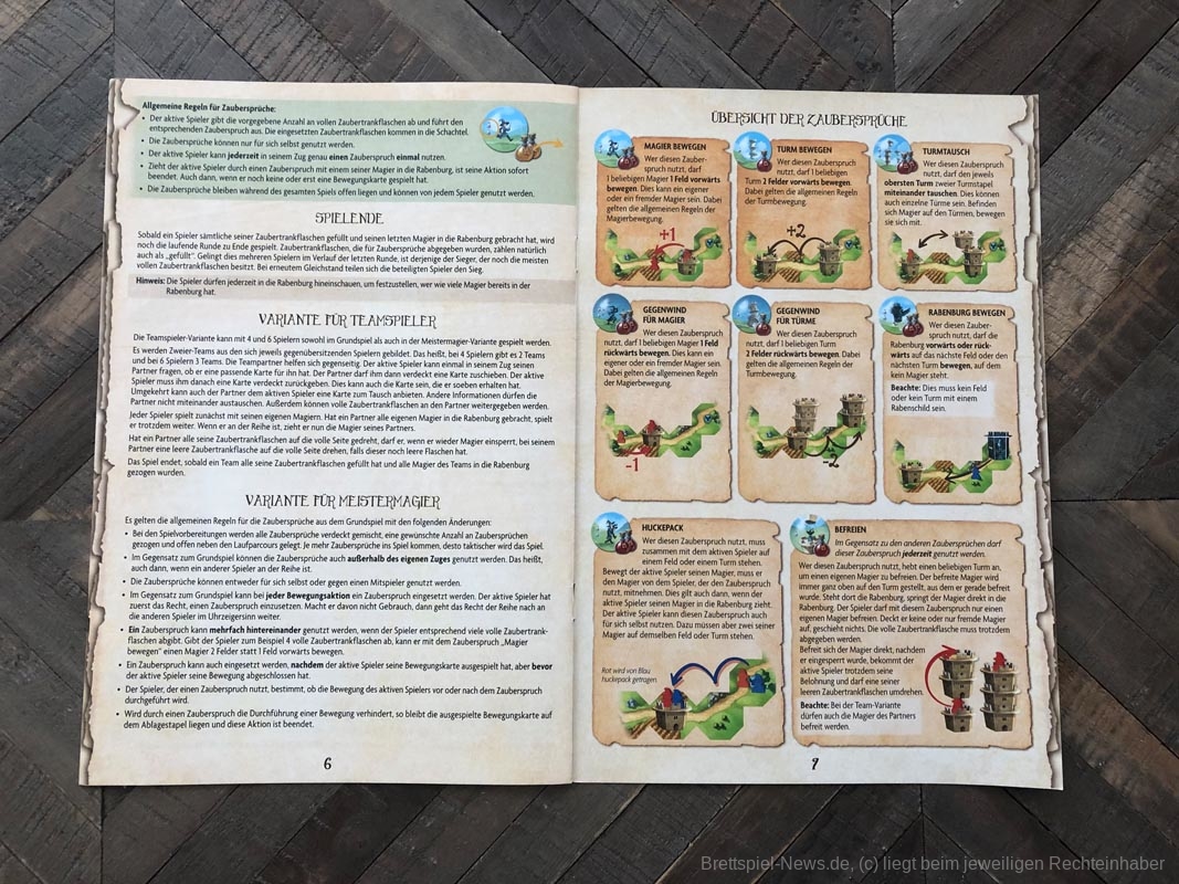 Um noch ein bisschen mehr Spannung ins Spiel zu bringen, gibt es noch Zaubersprüche, mit denen Extra-Aktionen ausgeführt werden können. Diese kosten natürlich, bezahlt wird mit vollen Zaubertrankflaschen.
