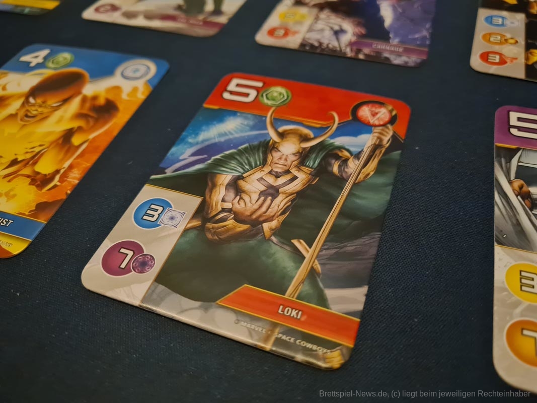 „Splendor-Marvel“ ist eine Eins-zu-Eins-Umsetzung des Originalspiels. Alle Mechaniken funktionieren identisch, nur dass anstatt Edelsteine Infinity-Steine gesammelt und Helden angeheuert werden. Wir empfanden es als ein wenig schade, dass sich das Thema im Grunde nicht wirklich im Spiel wiederfinden lässt, da es im Grunde nicht wirklich viel Sinn ergibt, dass Infinity-Steine wie Sand am Meer verfügbar sind und für das Rekrutieren von Helden genutzt werden. Sinnbildlich steht dafür der letzte Stein (der Zeitstein) der automatisch in den eigenen Besitz geht, sobald einer der Helden der letzten Stufe rekrutiert wird.