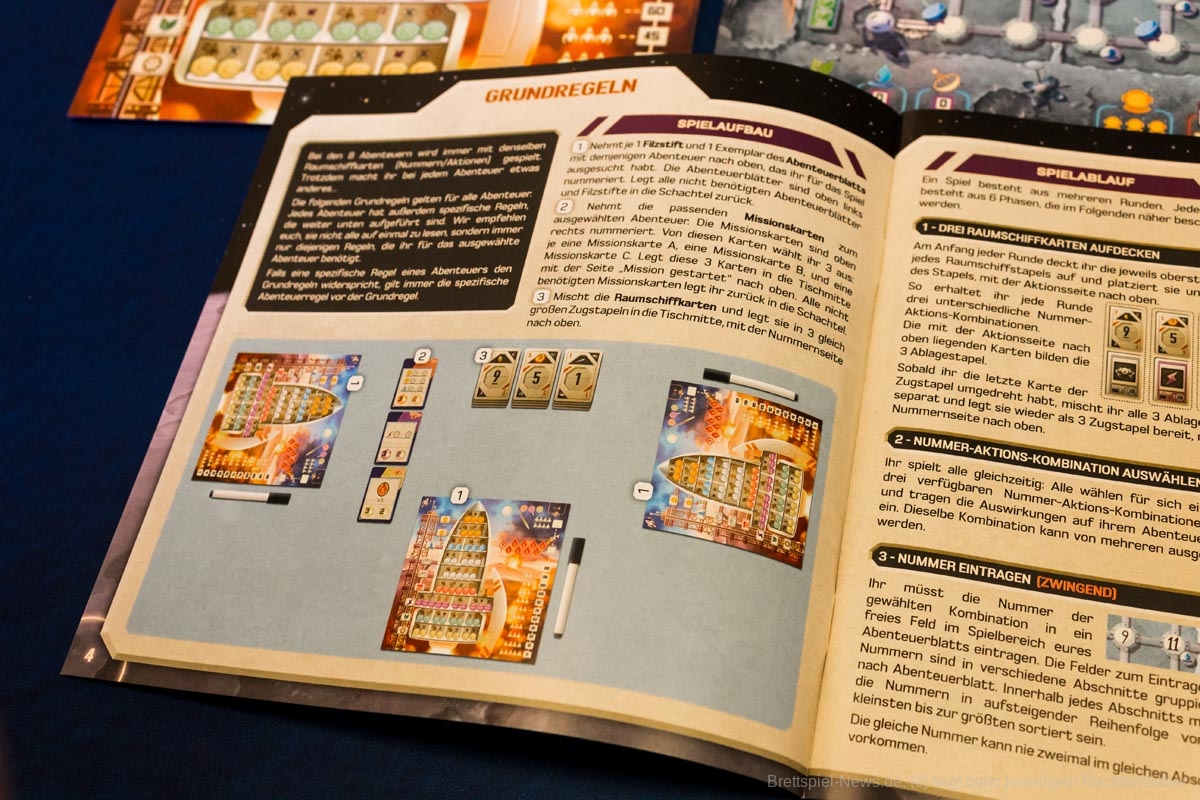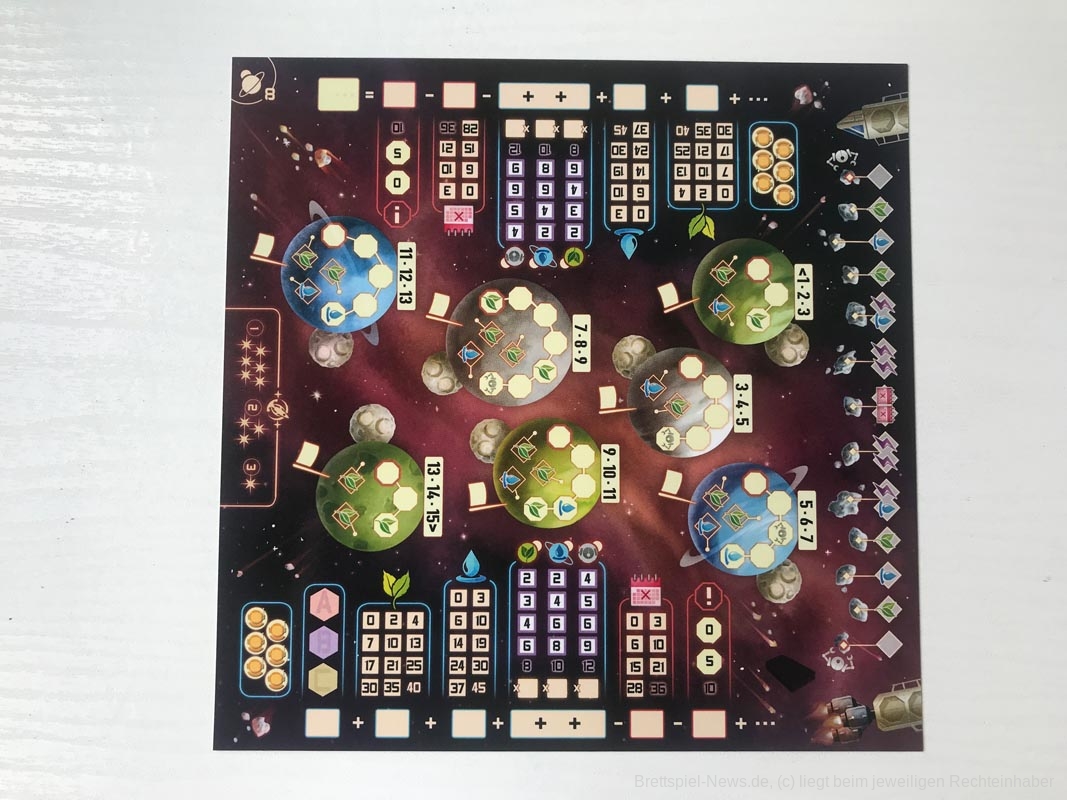 Das Spielmaterial finde ich gut. Die Illustrationen sind passend und es gibt viel zu entdecken – da taucht dann auch mal eine kleine Enterprise auf. Der Retrolook fängt schon beim Cover an und zieht sich konsequent durch das gesamte Spiel. Die Ikons sind einfach zu verstehen. Bei den Stiften hätte ich mir eine feinere Spitze gewünscht. Dafür haben sie aber bis jetzt einige Partien gut überstanden. Spielkarten und Playerboards haben eine vernünftige Kartonstärke. Außerdem kommt das Spiel ganz ohne Plastikinlay und Plastikbeutel aus.