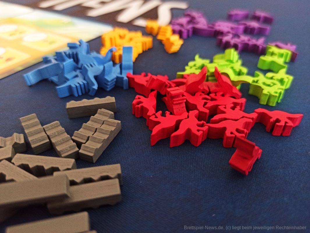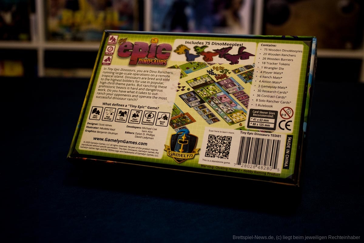 Mit „Tiny Epic Dinosaurs“ ist ein weiteres Spiel der Tiny Epic—Reihe erschienen. Diesmal dürfen Dinosaurier gezüchtet werden. Wie bei allen Spielen dieser Reihe, so ist auch hier der Name Programm. Alles kommt im Miniformat daher, was dem Spielspaß jedoch keinen Abbruch tut. Das Spielmaterial ist für die kleine Box erstaunlich umfangreich, insbesondere die 75 sehr filigranen und dennoch stabilen Dino-Meeples fallen einem sofort positiv auf.