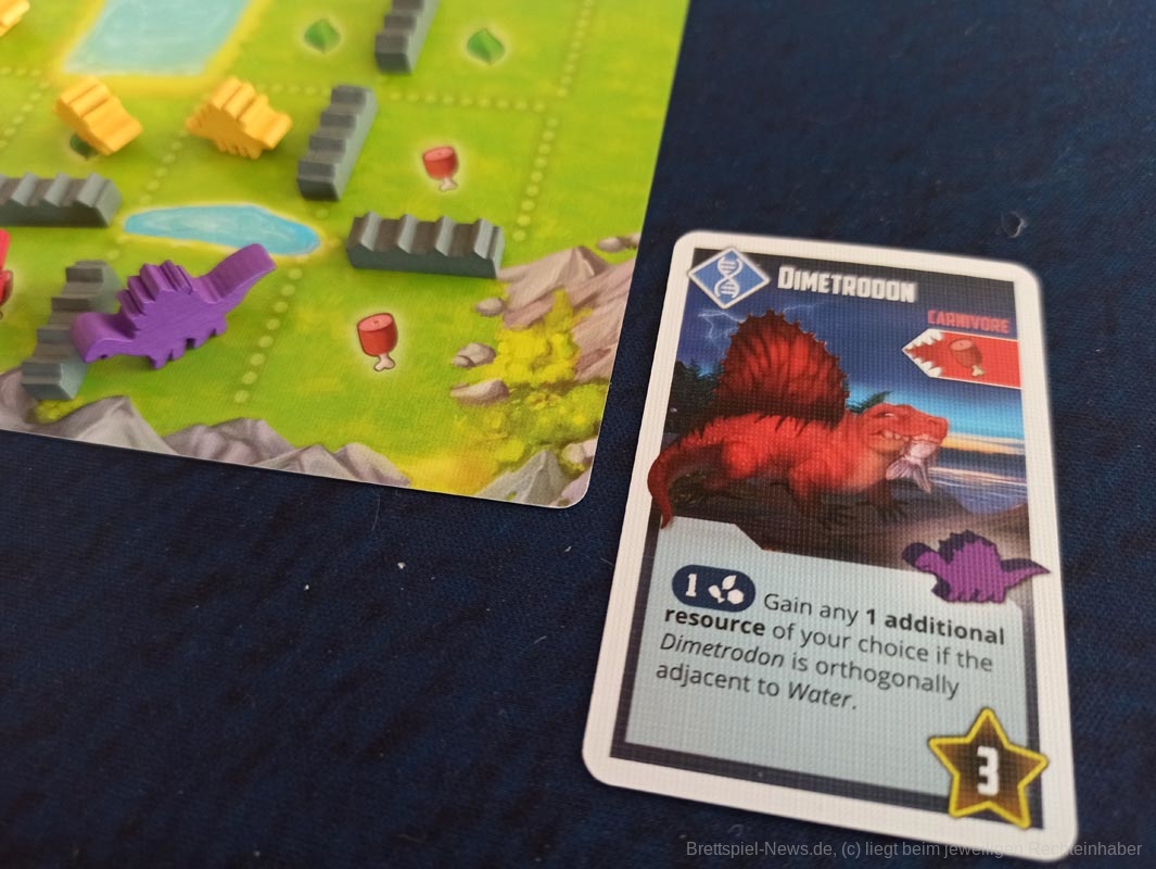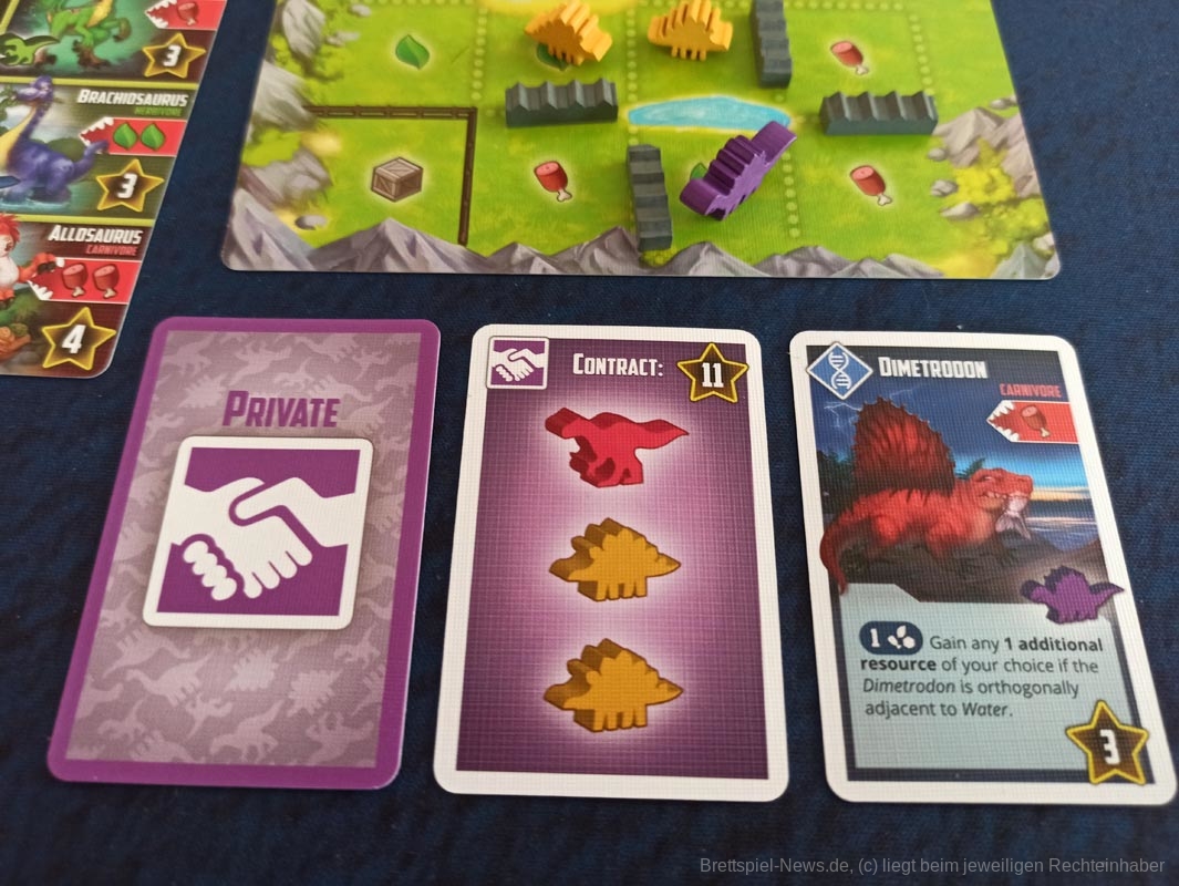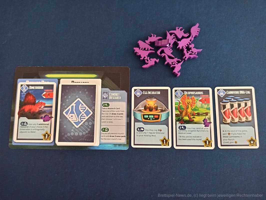 Thematisch ist das Spiel wunderbar umgesetzt. Wir bauen Zäune, züchten Dinos und wenn wir diese nicht ausreichend füttern, reagieren die entsprechend empfindlich. So gilt es, einiges im Auge zu behalten. Schnell wird übersehen, dass eine Ressource fehlt, was dazu führt, dass beispielsweise ein Fleischfresser einen anderen Dino frisst, der in Folge keinen Nachwuchs zeugen kann, den wir eigentlich benötigt hätten, um einen Auftrag zu erfüllen. Oder es wurde übersehen, dass nicht genug Platz für den Nachwuchs da ist, somit wird ein Zaun zerstört und zwei Spezies, die sich nicht mögen, sind plötzlich nicht mehr getrennt.